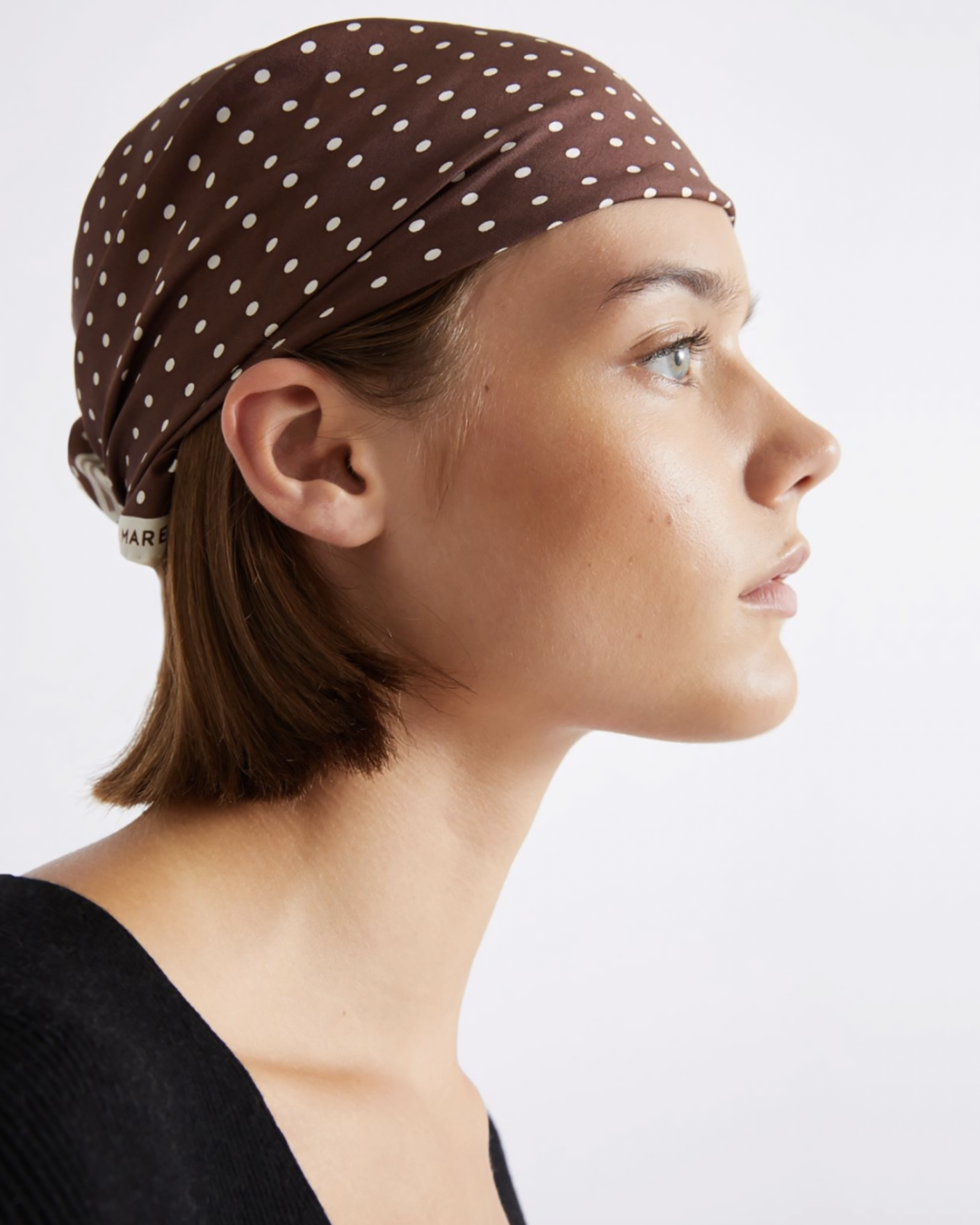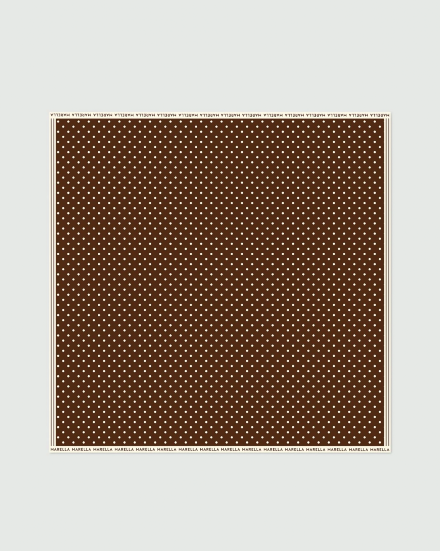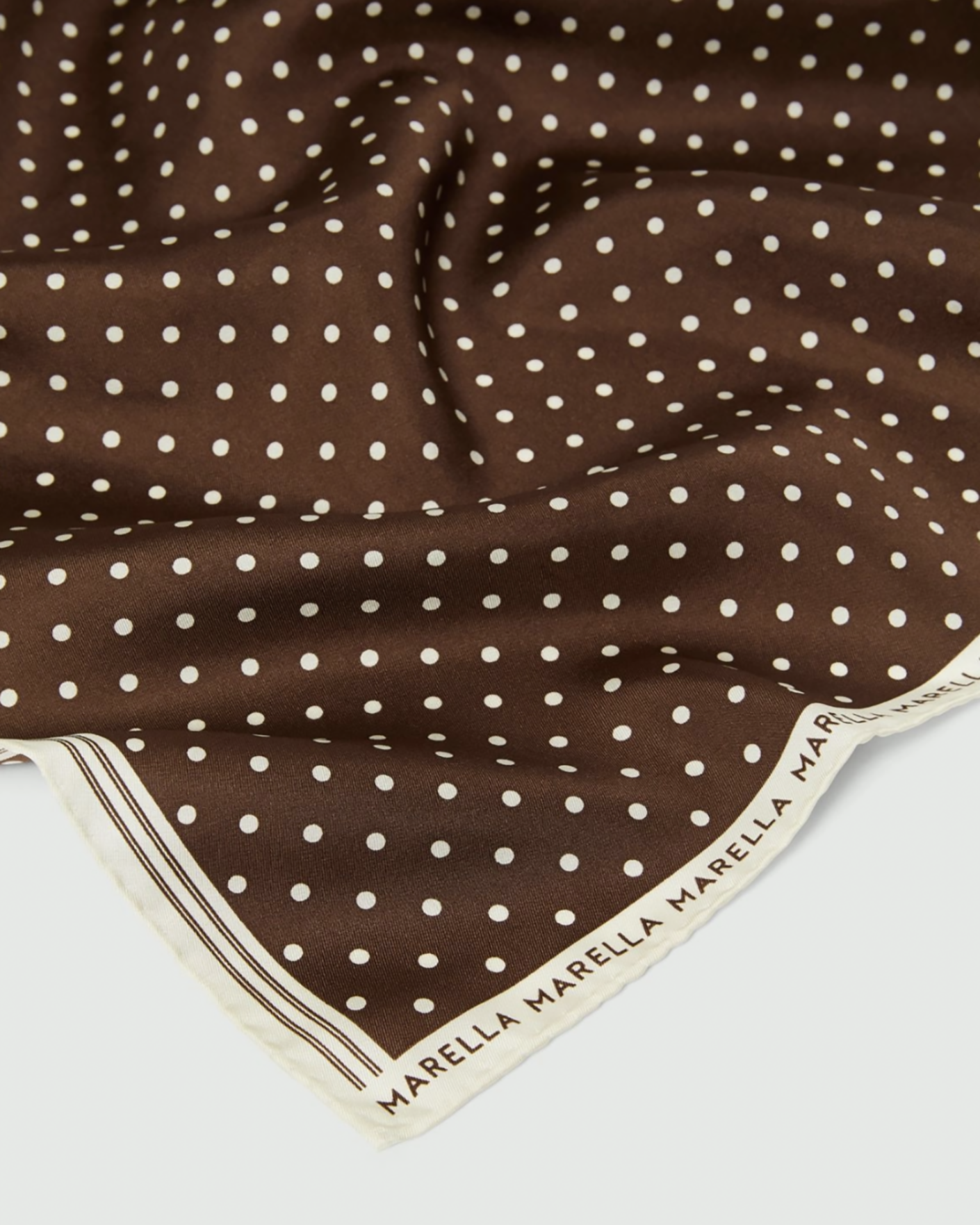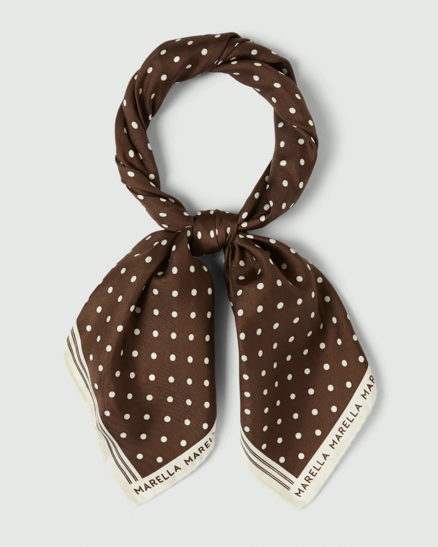 Стильный платок Marella коричневого цвета в принт горох и логотип по краю. Модель из 100% шелка, квадратная форма 58*58 см. Платок можно повязать на голову, шею, а также использовать, как аксессуар на сумку.