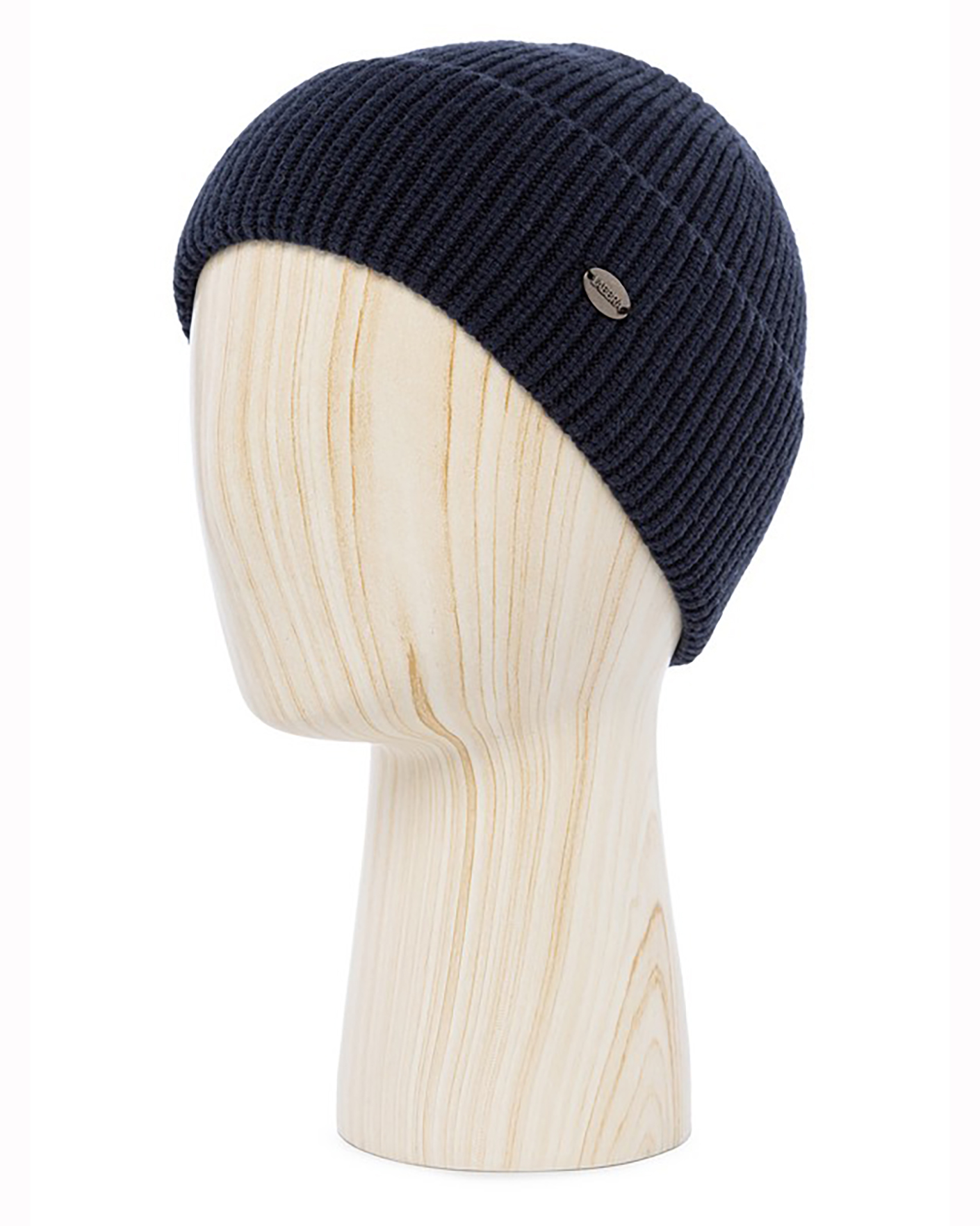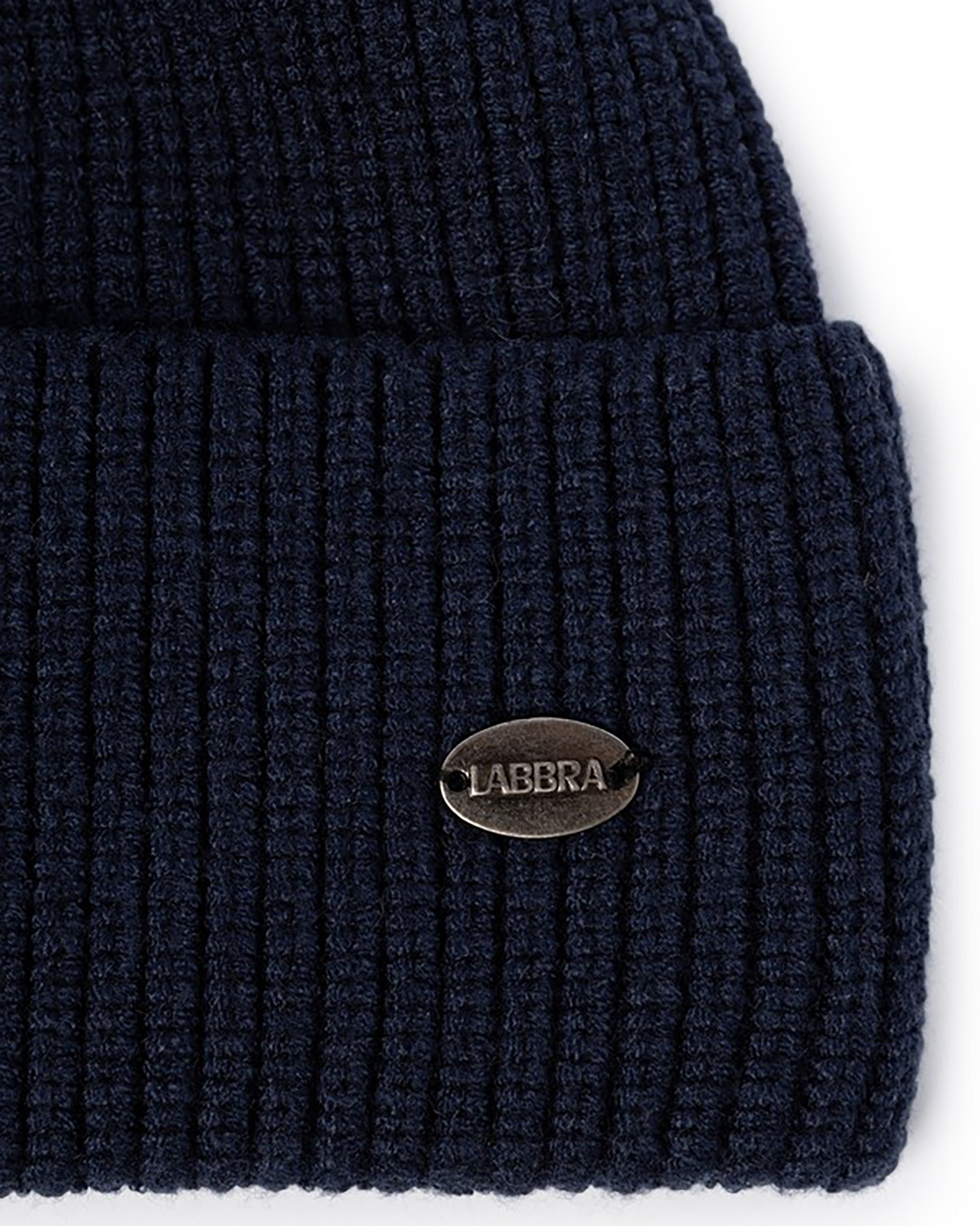 Вязаная мужская шапка Labbra темно-синего цвета. Модель с широким отворотом и фирменным логотипом. Шапка - теплый аксессуар на каждый день.