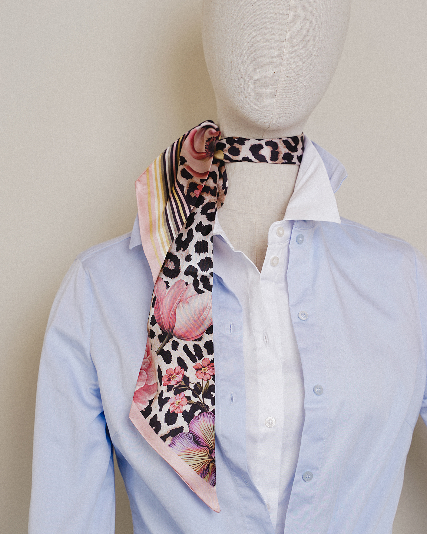 Узкий шарф OUI кремового цвета в цветочный и анималистичный принт. Модель прямоугольной вытянутой формы с косыми краями. Шарф идеально завязать на шею или использовать в качестве аксессуара на джинсы или сумку.