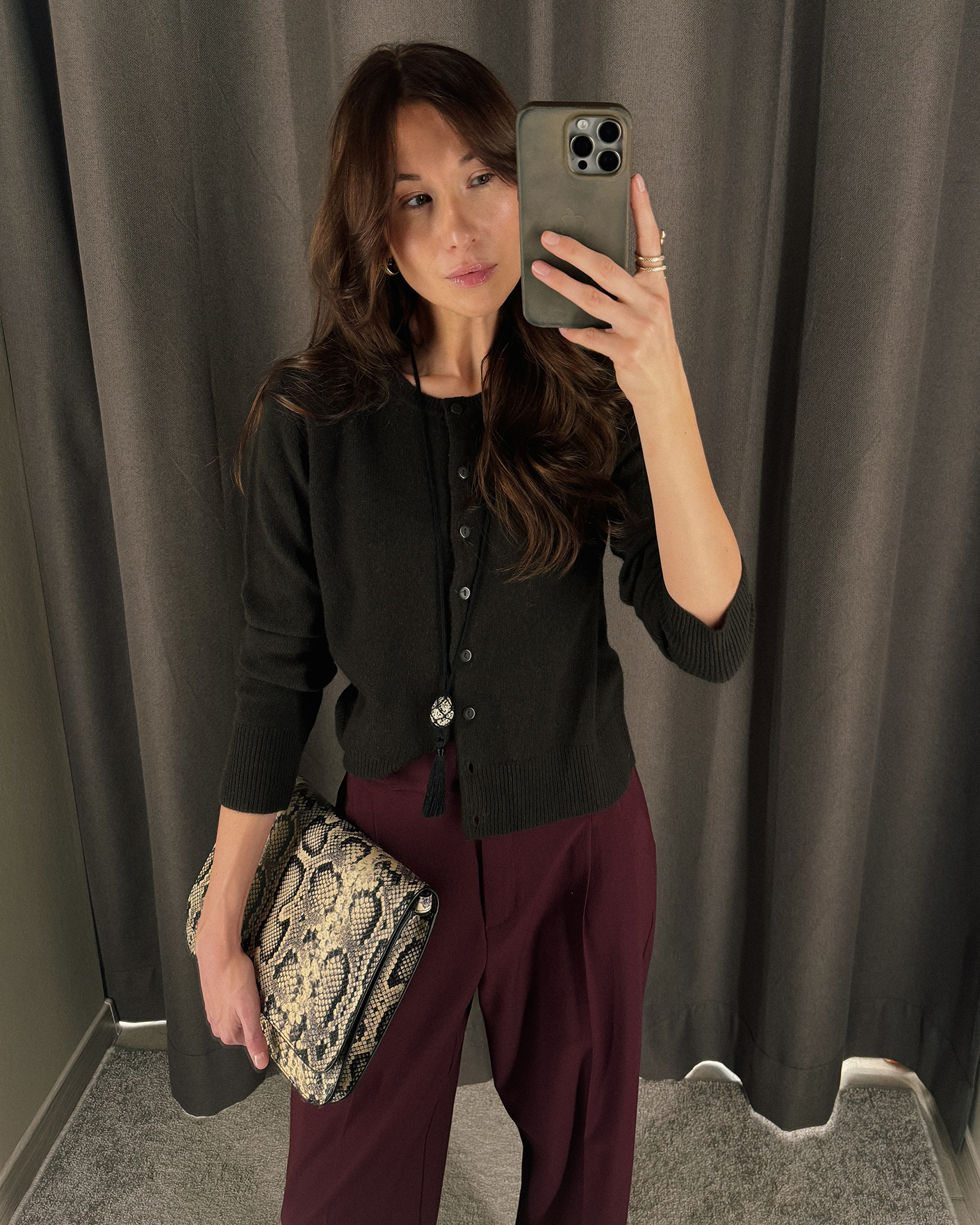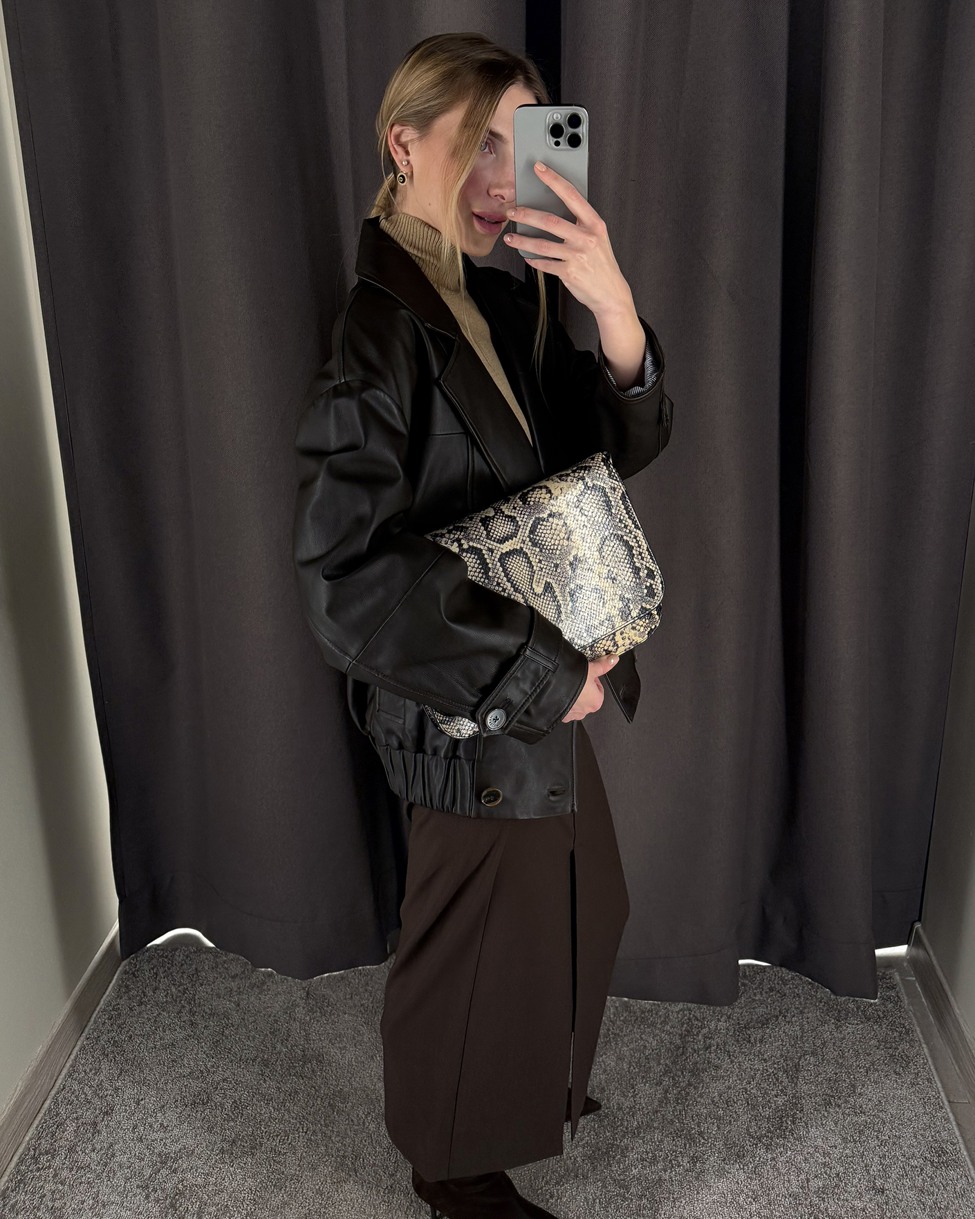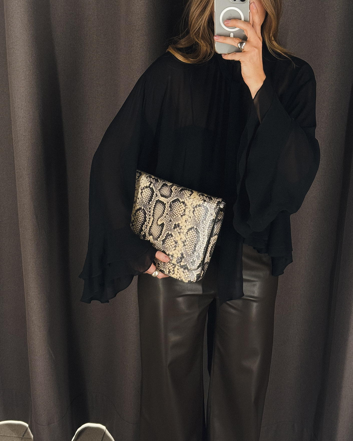 Стильная сумка-конверт Sportmax серо-бежевого цвета в принт змеиной кожи. Модель прямоугольной формы, с глубоким клапаном спереди на магнитной застежке, а внутренним карманом на молнии. Имеется съемный ремешок, что позволяет носить сумку на плече или через него.