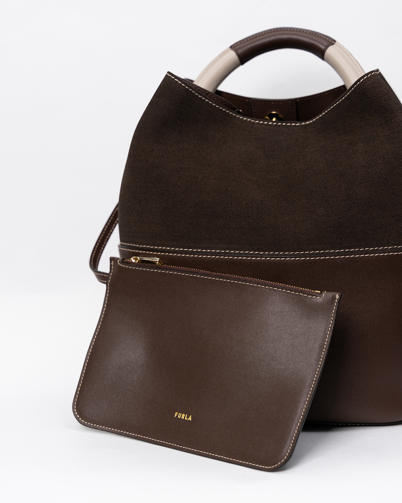 Сумка Furla Sfera темно-коричневого цвета. Прочное основание из гладкой кожи образует контраст материалов с верхней частью, созданной из мягкой замши с отделкой под джинсовую ткань. Удобная и легкая сумка дополнена подкладкой и культовой фурнитурой Sfera, привносящей в дизайн ручки изысканный акцент. Съемный регулируемый ремень из кожи в тон, магнитная застежка. Это компактная, но вместительная сумка-торба на каждый день.