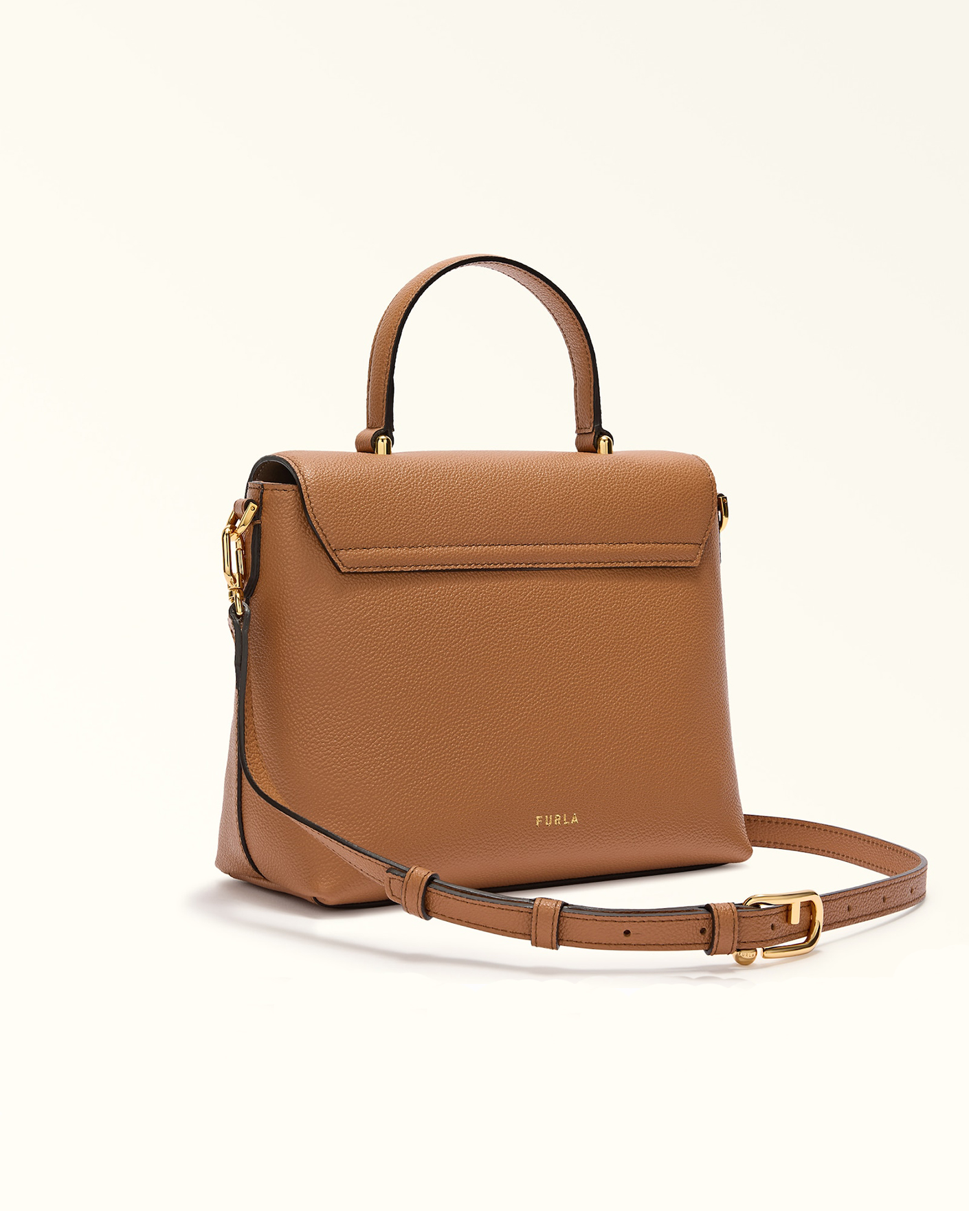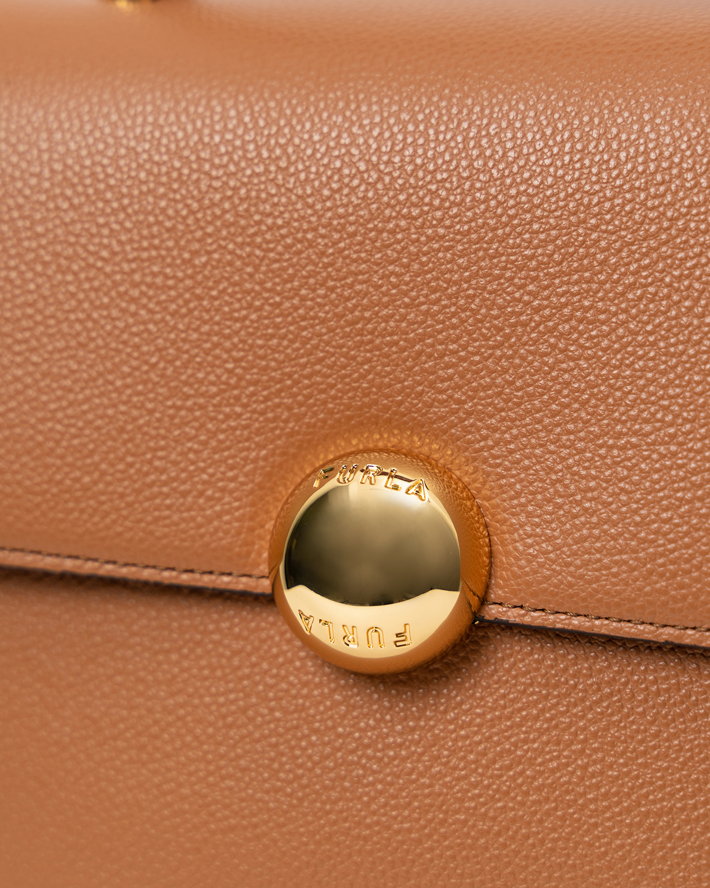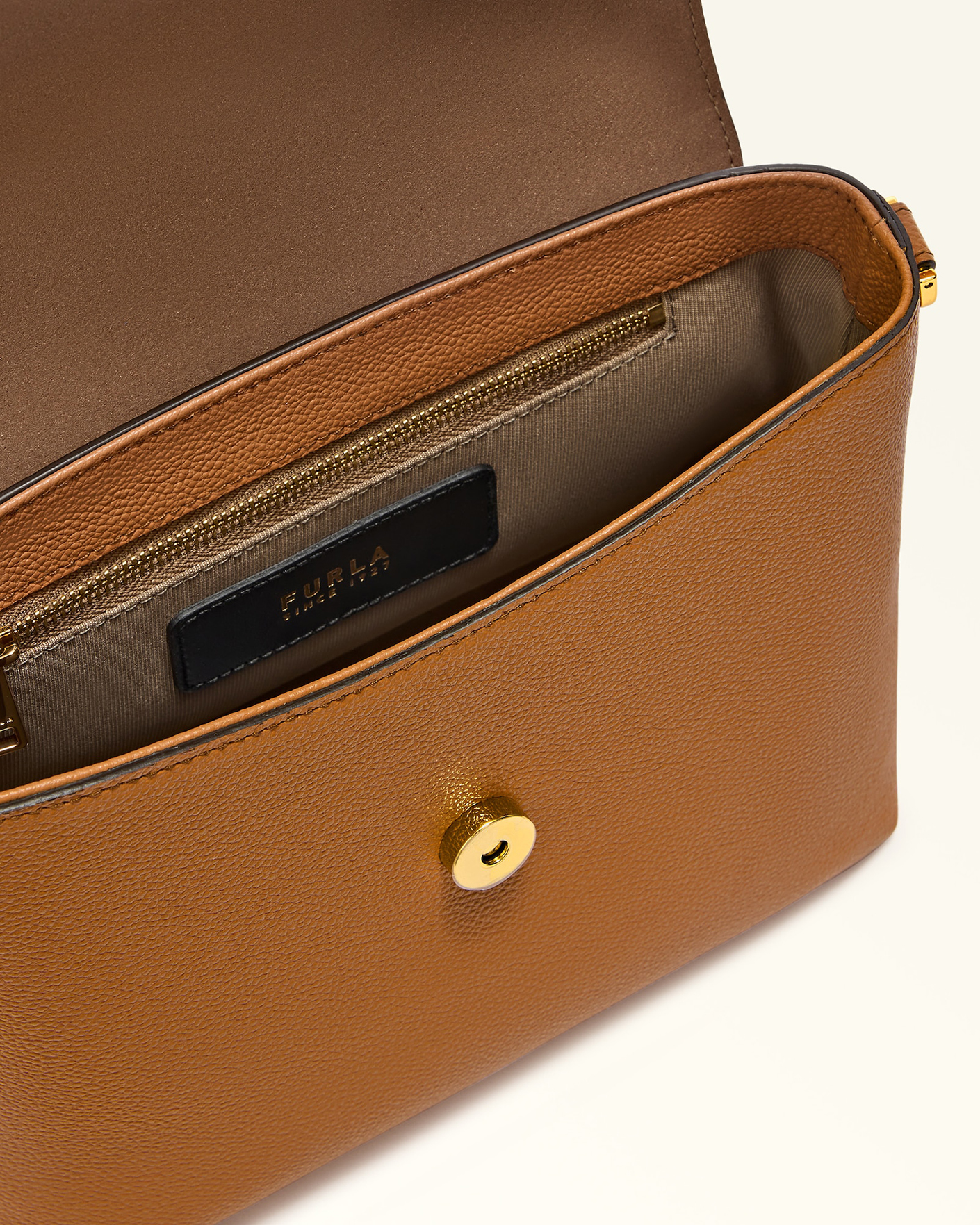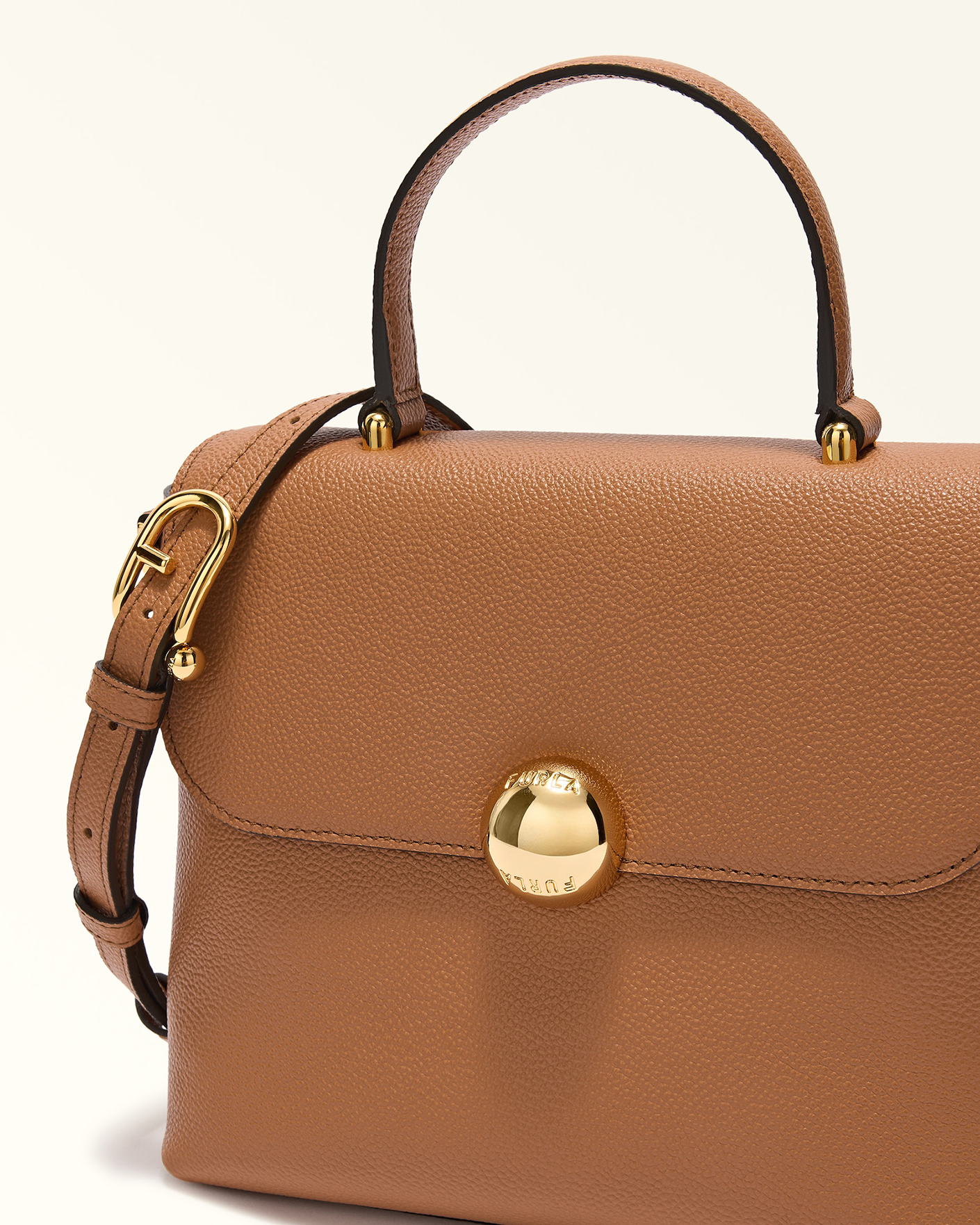 Сумка Furla Moonlight бежевого цвета. Компактная модель из 100% кожи с легким теснением. Открытый внутренний карман, внетренний карман на молнии, клапан с застежкой с магнитной кнопкой и логотипом Sfera. Аксессуар с округлым силуэтом можно носить разными способами благодаря съемному регулируемому ремешку в тон, что делает его идеальным решением как для дневных, так и для вечерних образов.