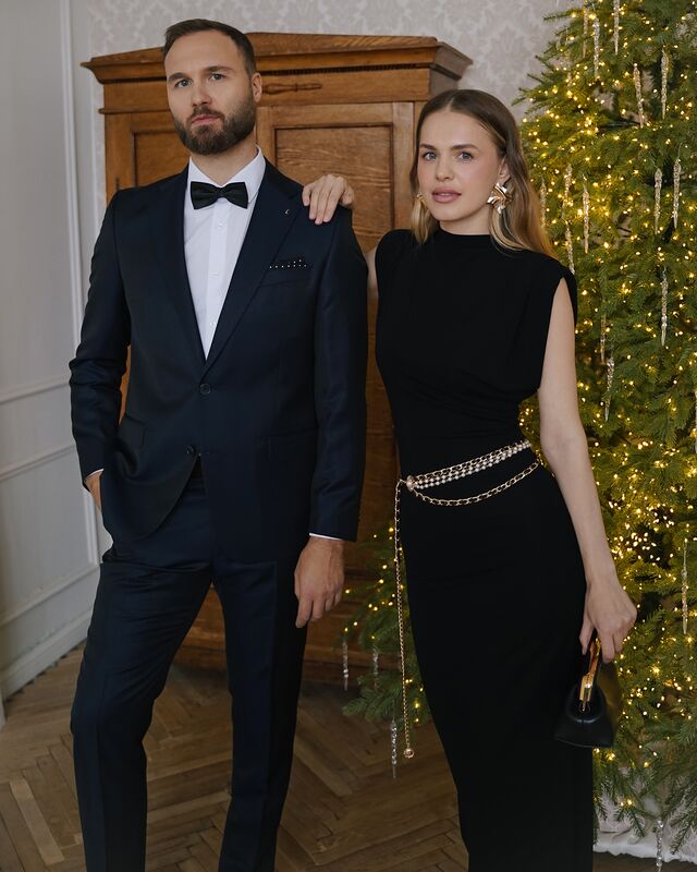 Мужчина одет в тёмный костюм с идеально сидящим пиджаком и аккуратной бабочкой — классика европейского вечернего дресс-кода. Женщина — в чёрном лаконичном платье, подчеркнутом золотистым акцентом на талии. Образы мягко гармонируют, создавая атмосферу статусного и культурного вечера.