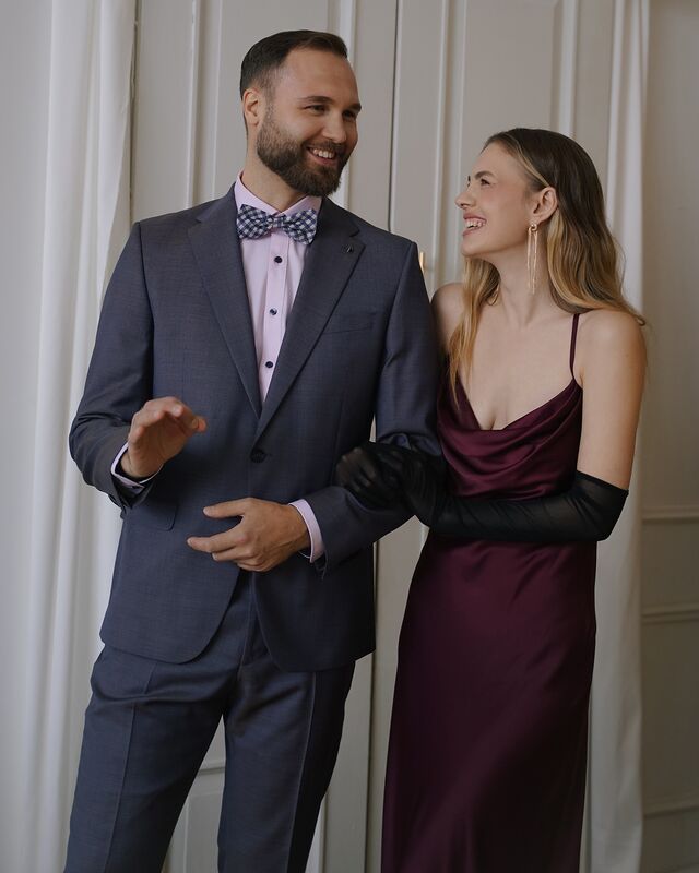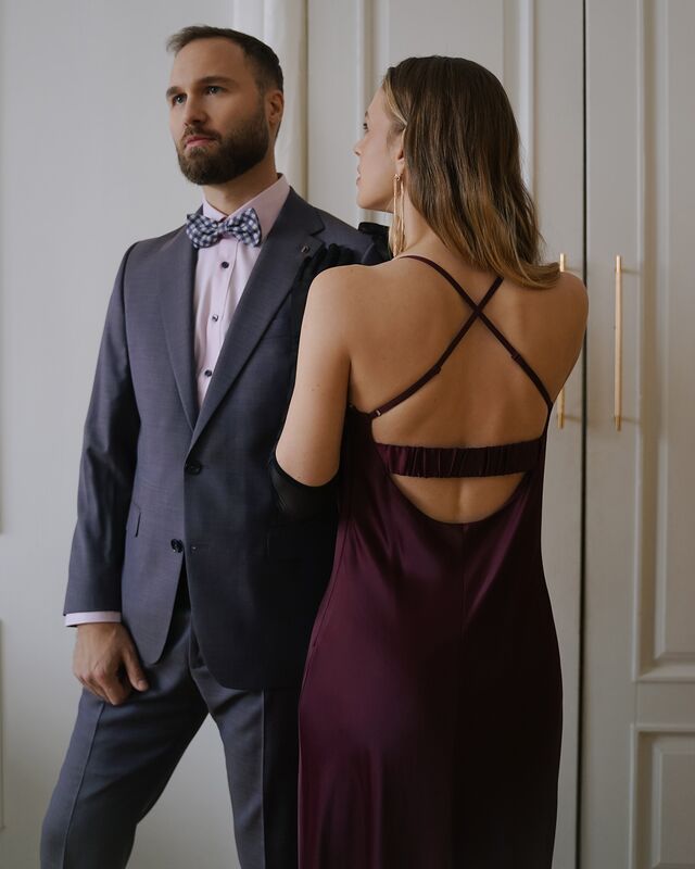 Женщина в сатиновом винном платье с открытыми плечами и длинными перчатками — образ, в котором ключевую роль играют мягкие линии и насыщенные оттенки. Мужчина — в элегантном костюме с игривой бабочкой, создающей лёгкий намёк на театральность.