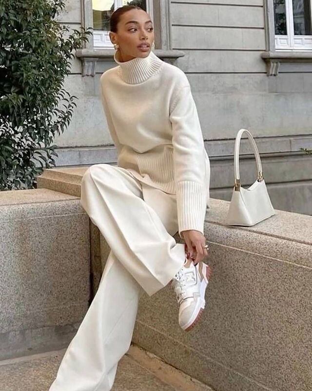 Образ в молочной гамме — один из самых актуальных приёмов последних сезонов. Светлый свитер в сочетании с широкими брюками в тон создаёт цельный, вытянутый силуэт и выглядит максимально благородно.