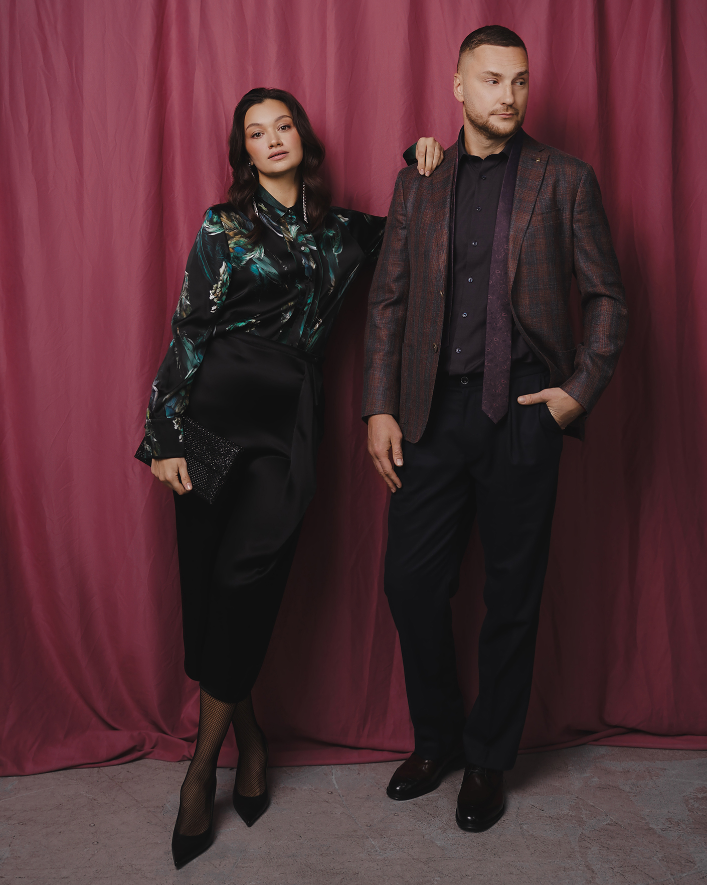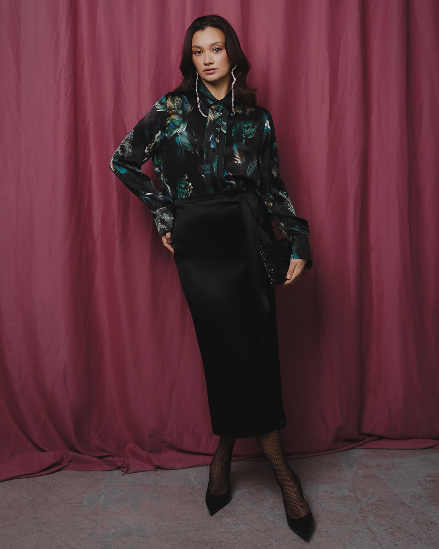Элегантный сдержанный образ от Marc Cain состоит из блузы черно-зеленого цвета с принтом и из юбки-карандаш черного цвета с воланом.