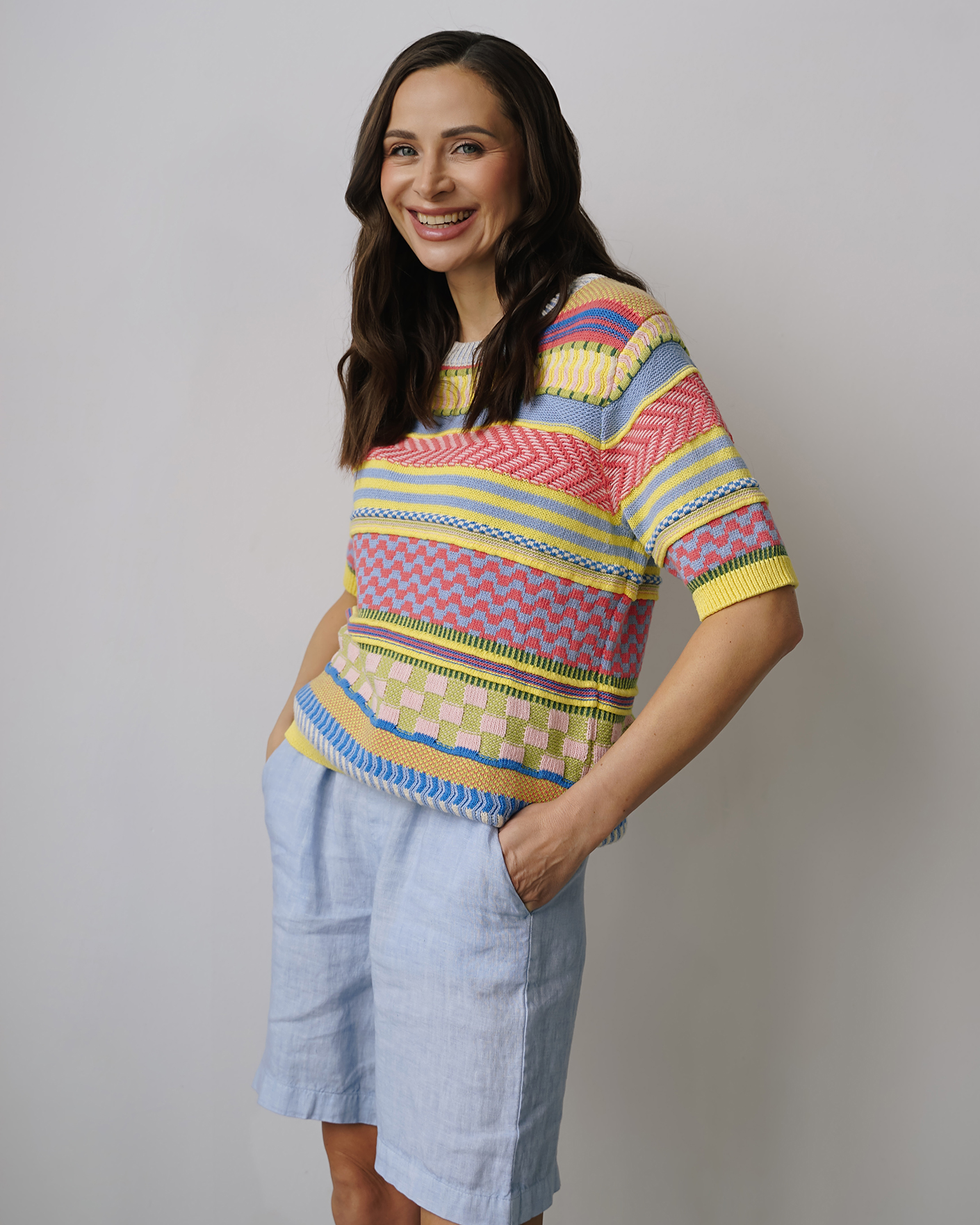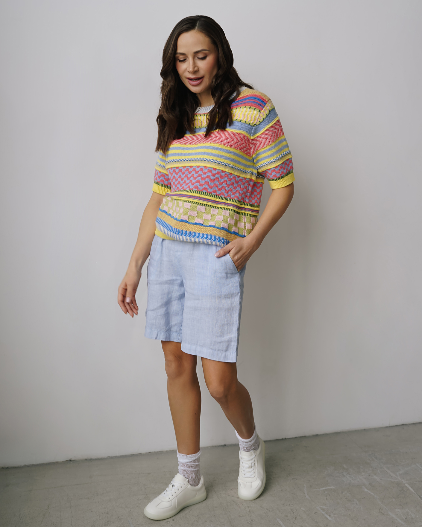 Идеальный летний образ от OUI для прогулок состоит из хлопкового джемпера желто-голубого цвета в текстурный горизонтальный рисунок и из шорт светло-голубого цвета в строчный рисунок из 100% льна.