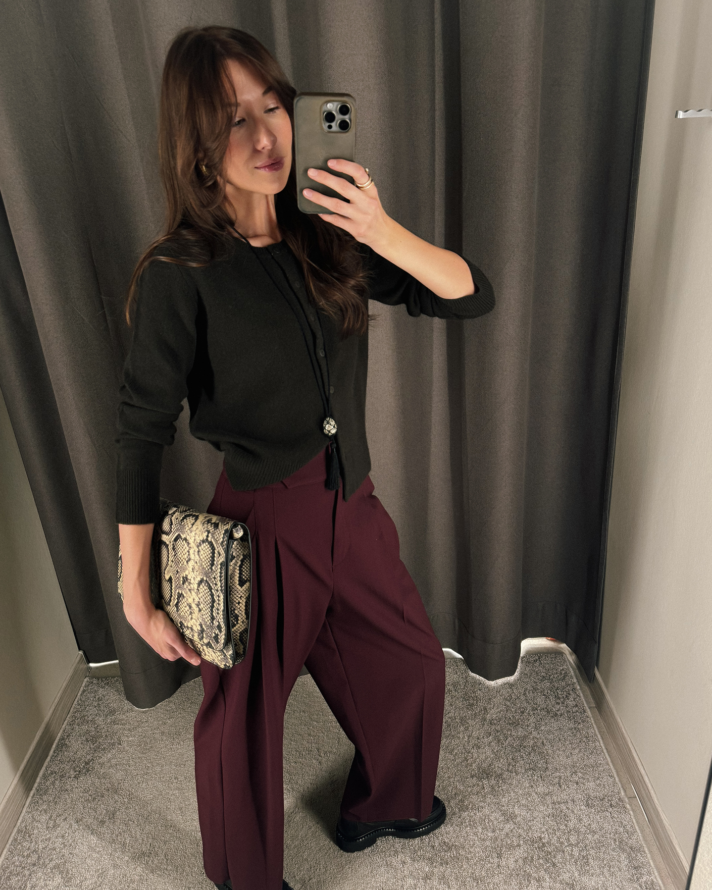 Идеальный образ для деловых встреч состоит из полуприталенного кардигана темно-коричневого цвета с застежкой на пуговицы и из широких брюк вишневого цвета.