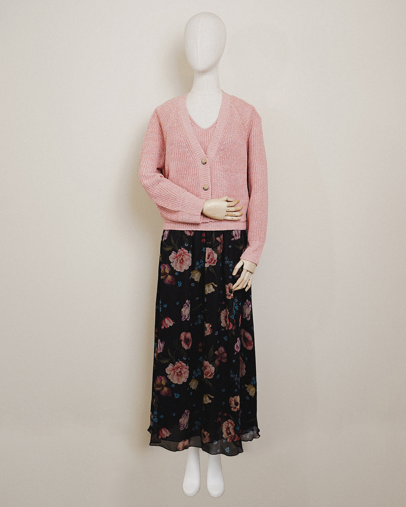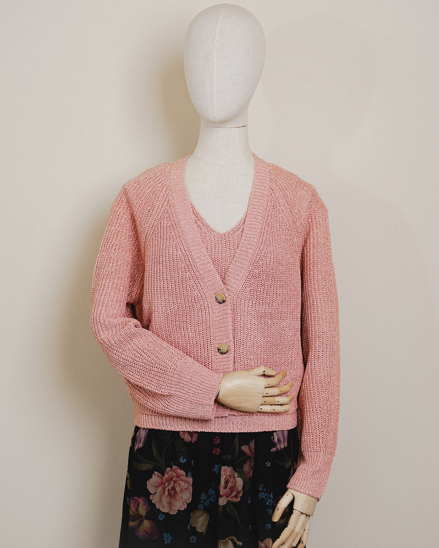 Идеальный образ для прогулок от OUI состоит из вязаного кардигана розового цвета с люрексом и застежкой напуговицы, из вязаного жилета розового цвета с люрексом, а также из юбки розово-черного цвета в крупный цветочный рисунок.