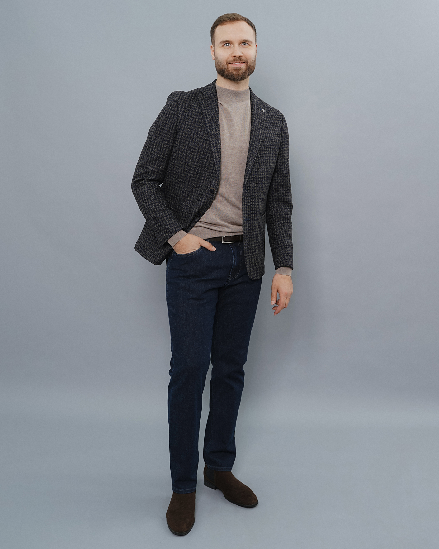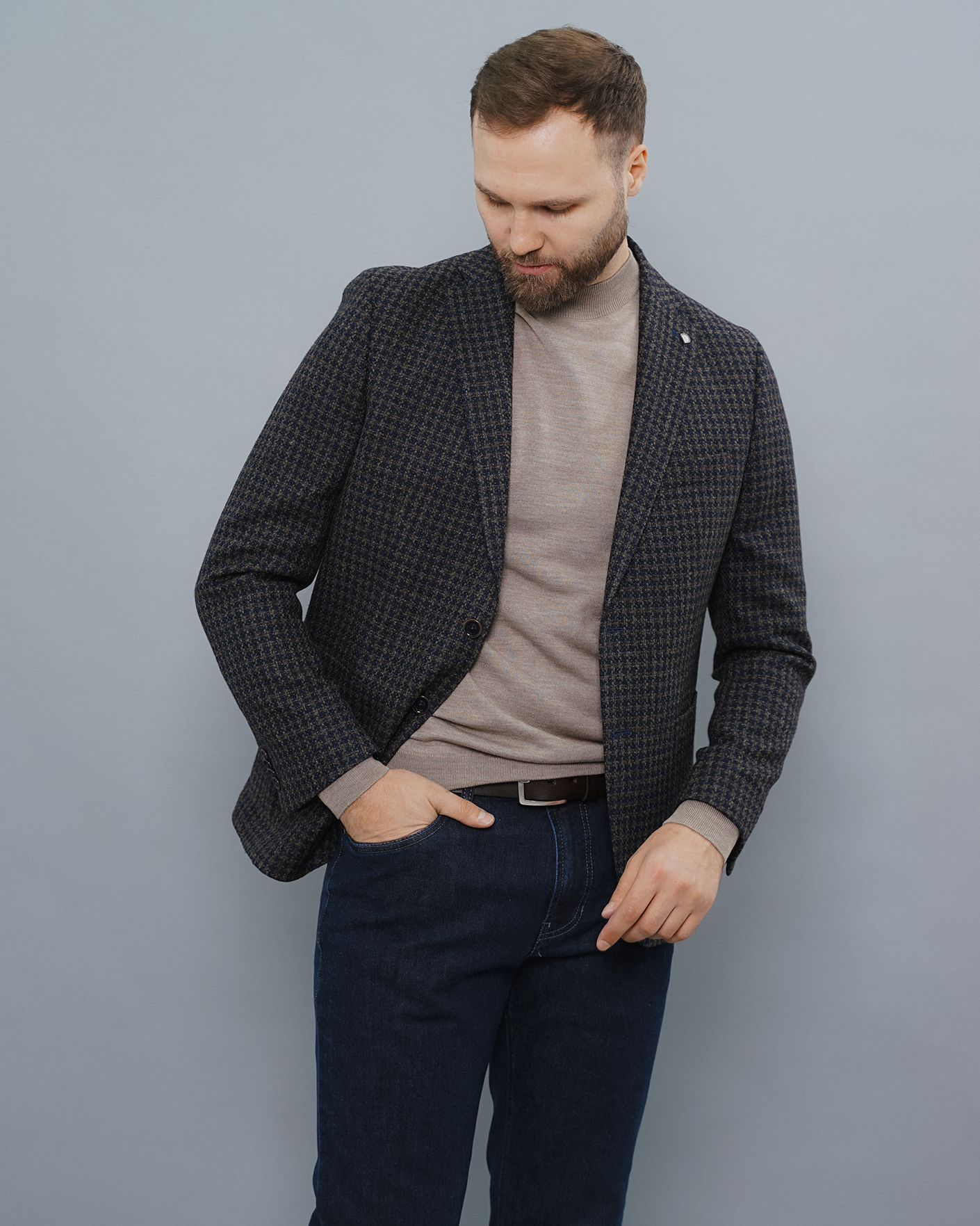 Идеальный образ для работы в офисе состоит из шерстяного пиджака  зелено-синего цвета в рисунок гусиные лапки, из джемпера в светло-бежевом цвете и из базовых джинс темно-синего цвета.