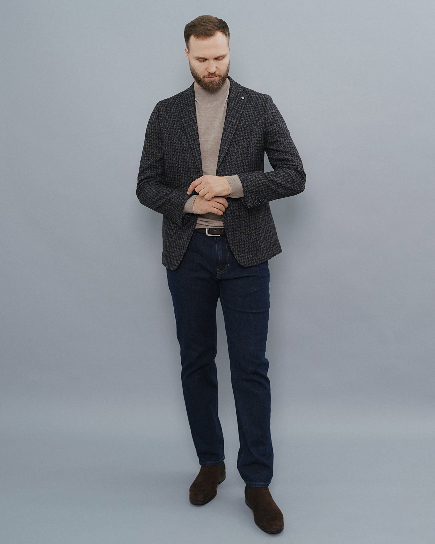Классический образ для деловых встреч: пиджак, водолазка, брюки