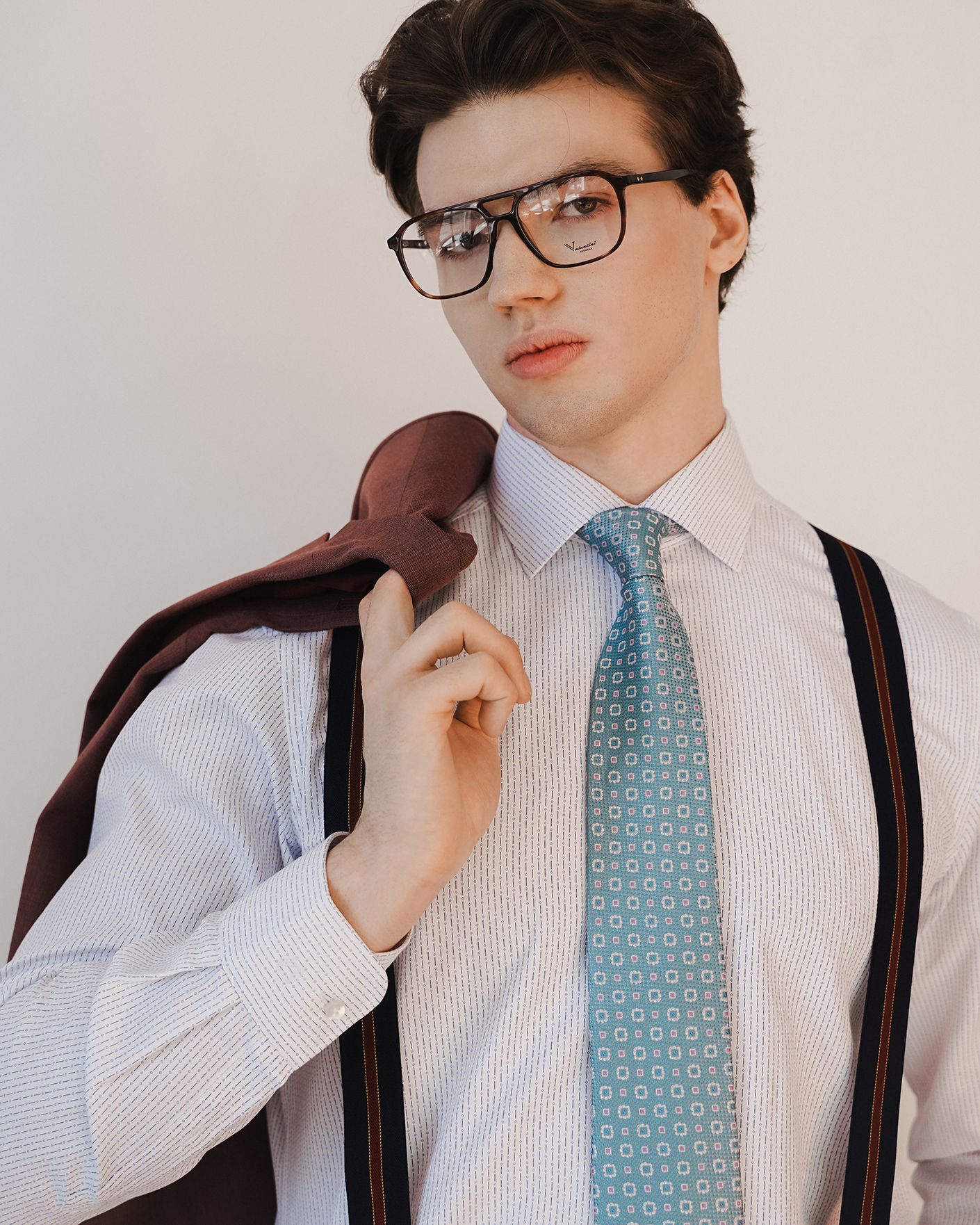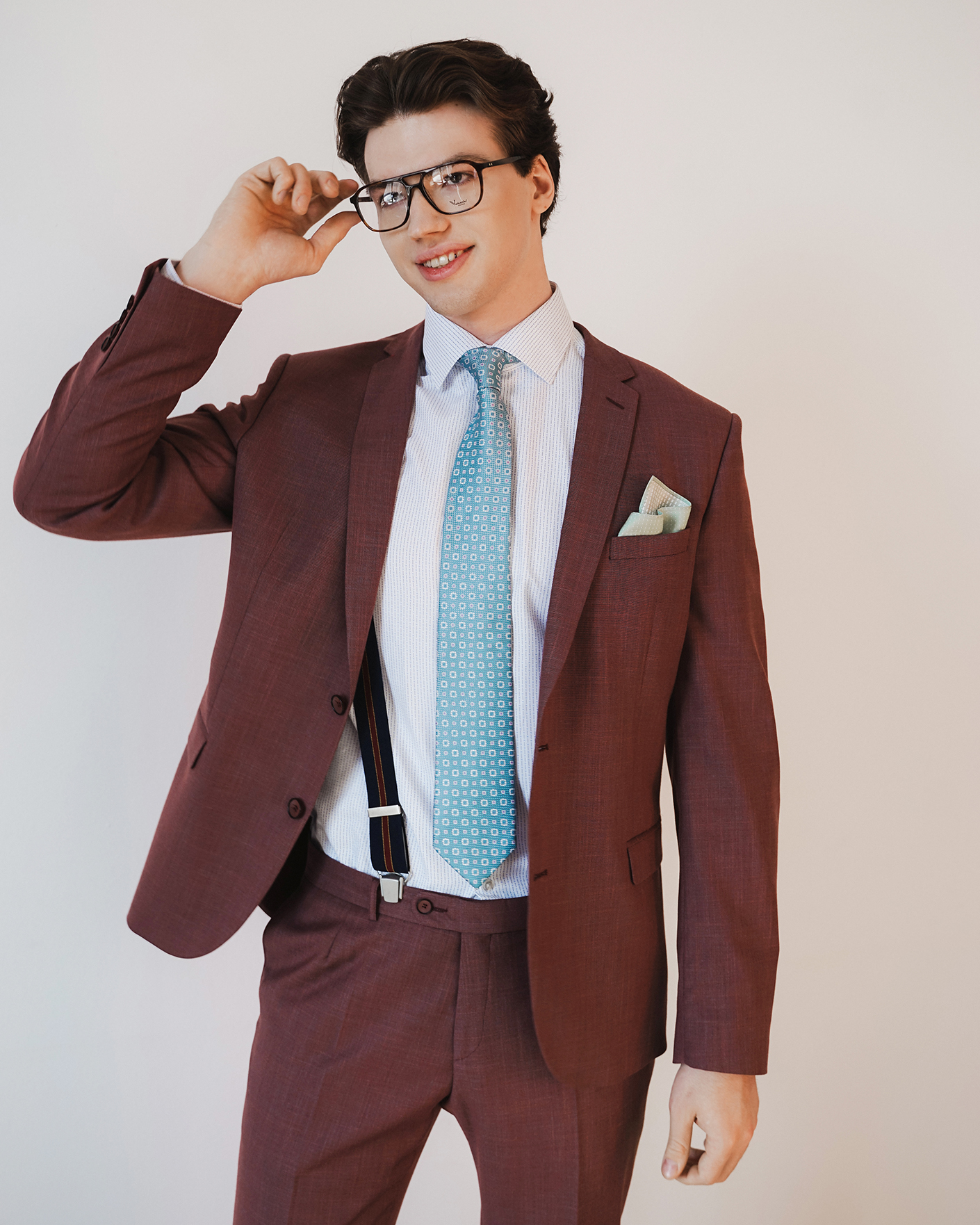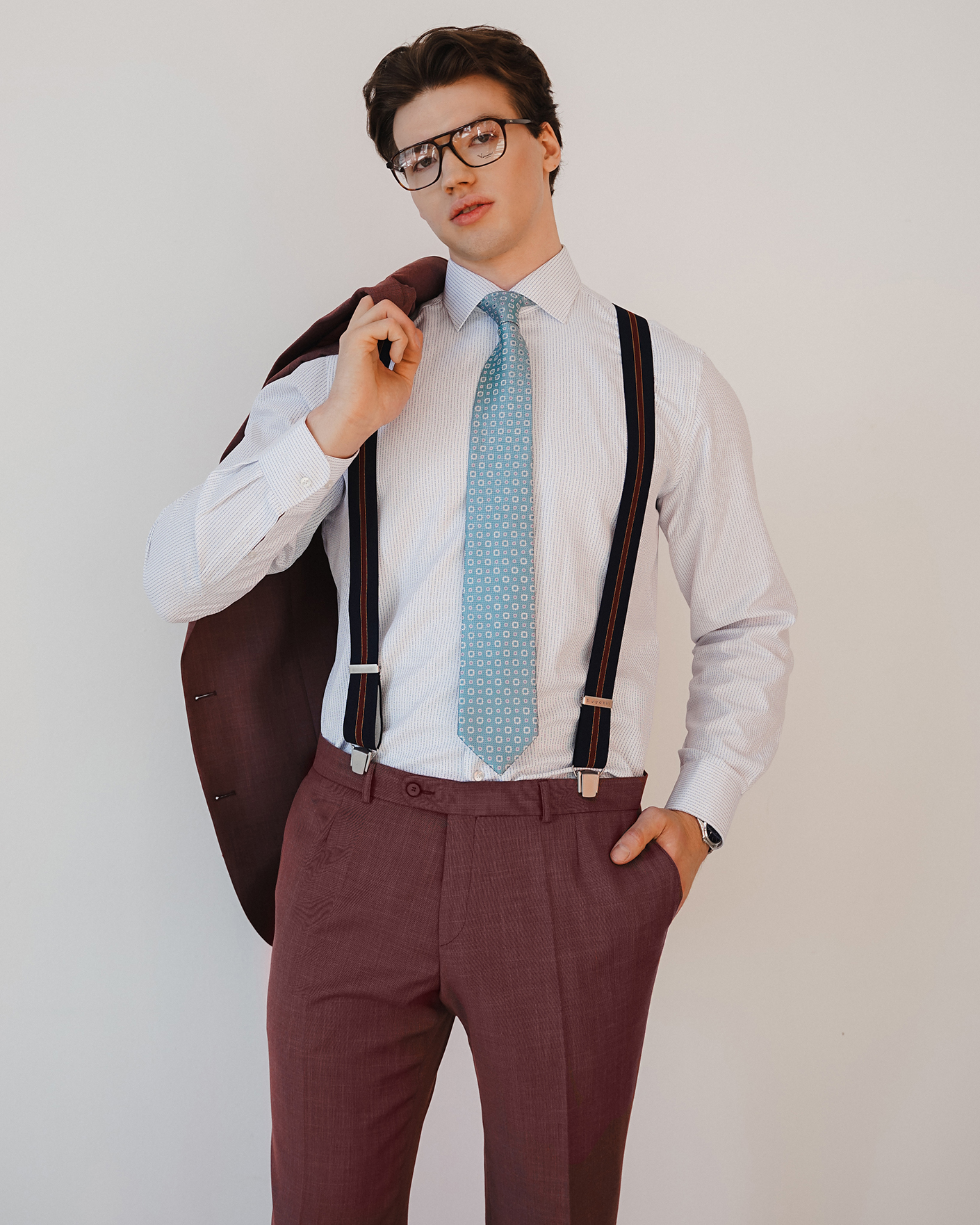 Идеальный образ для вечернего мероприятия состоит из костюма брусничного цвета в строчный рисунок и из хлопковой рубашки светло-голубого цвета в мелкий рисунок.