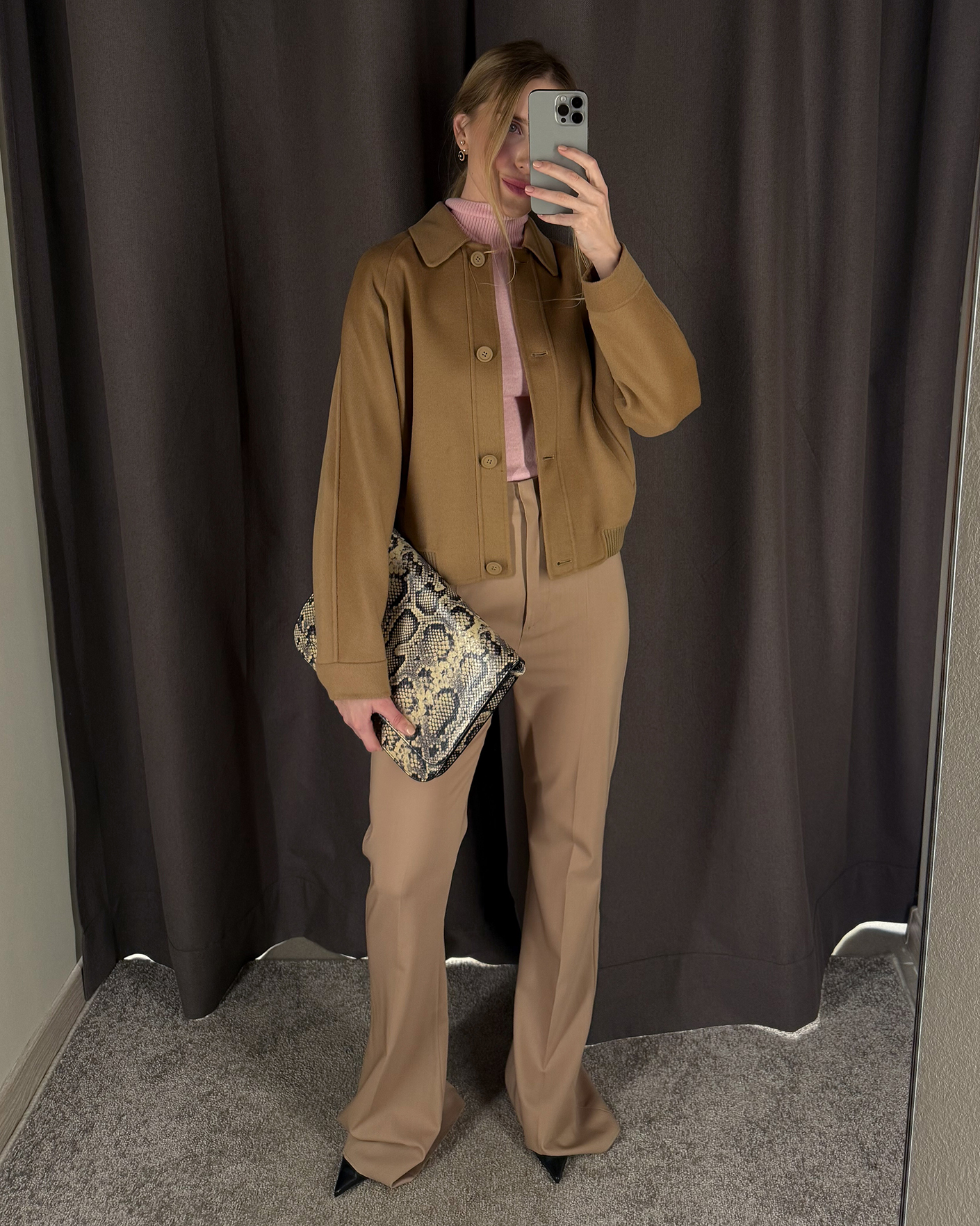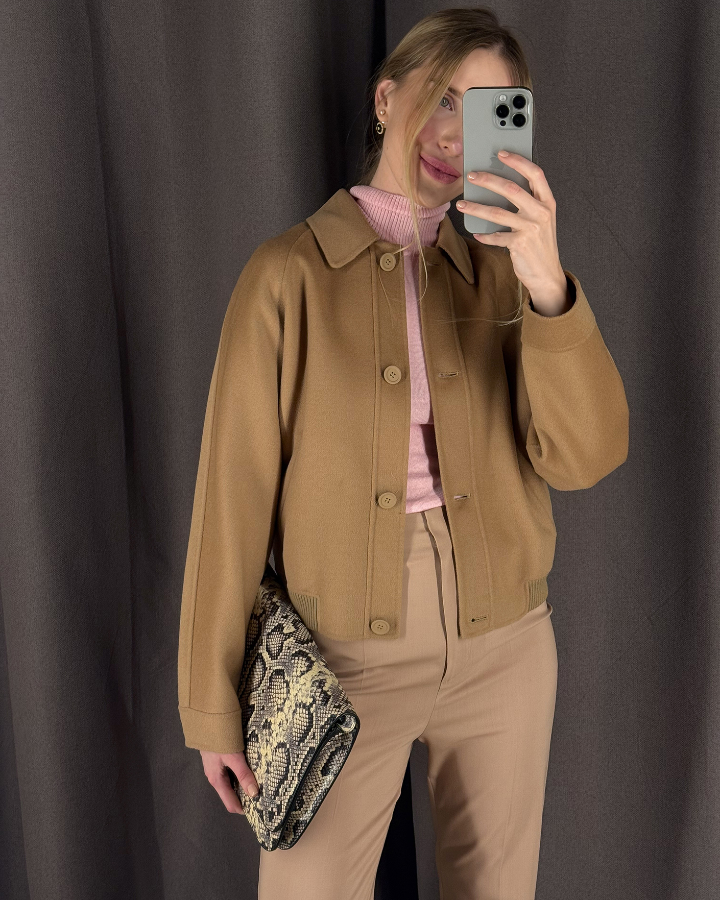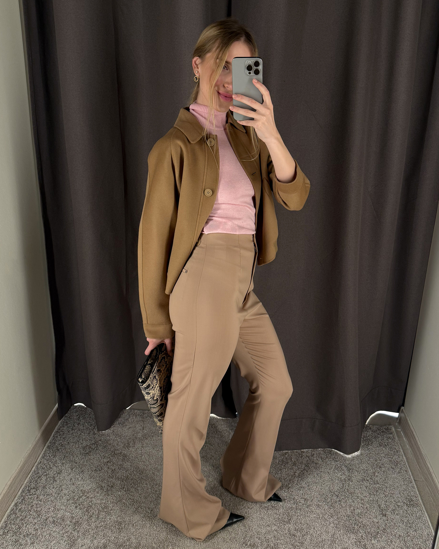 Идеальный образ на каждый день и для работы в офисе состоит из куртки-бомбер бежевого цвета с застежкой на крупные пуговицы, из приталенного жилета розового цвета из 100% шерсти с воротником-стойка, из брюк бежевого цвета.