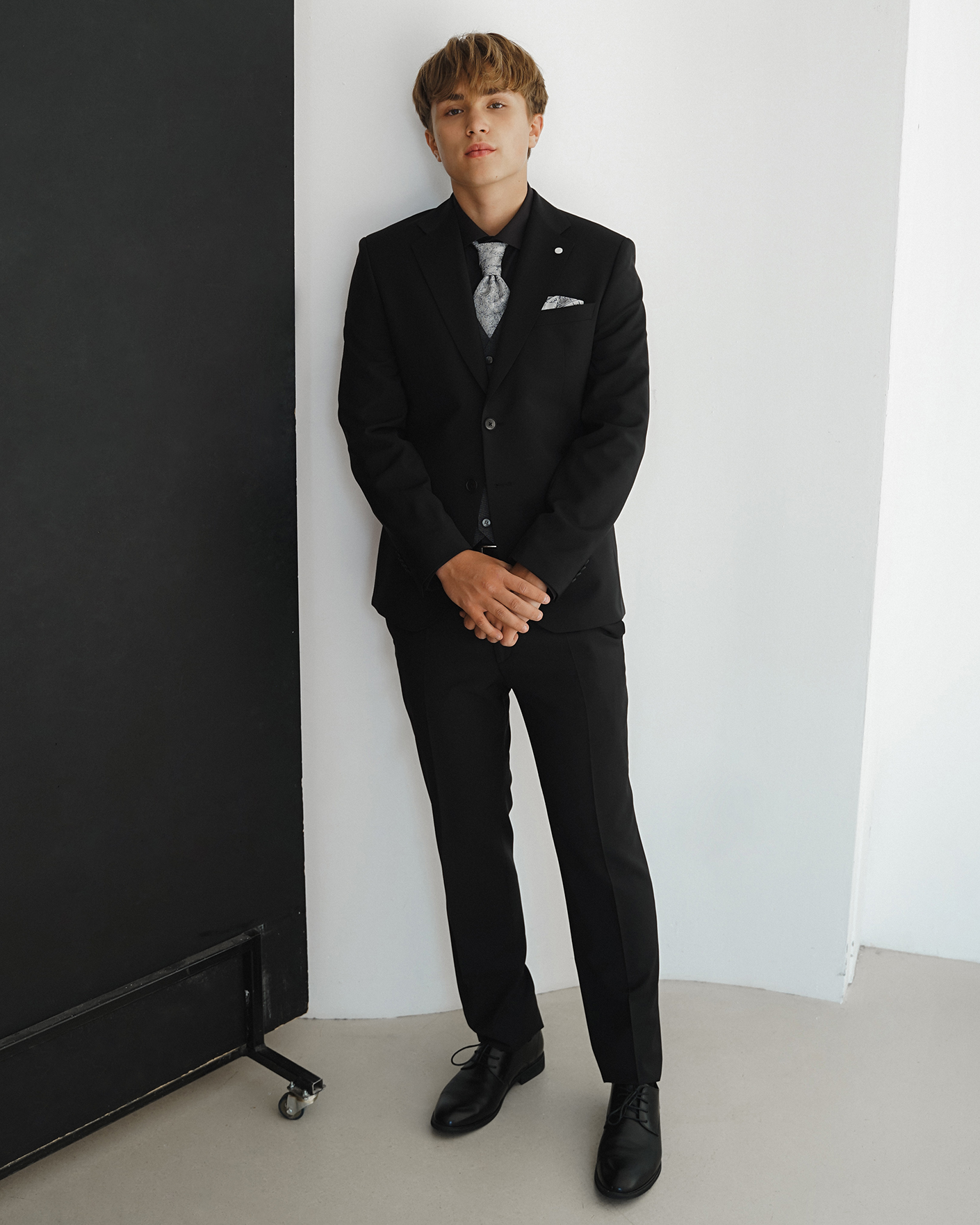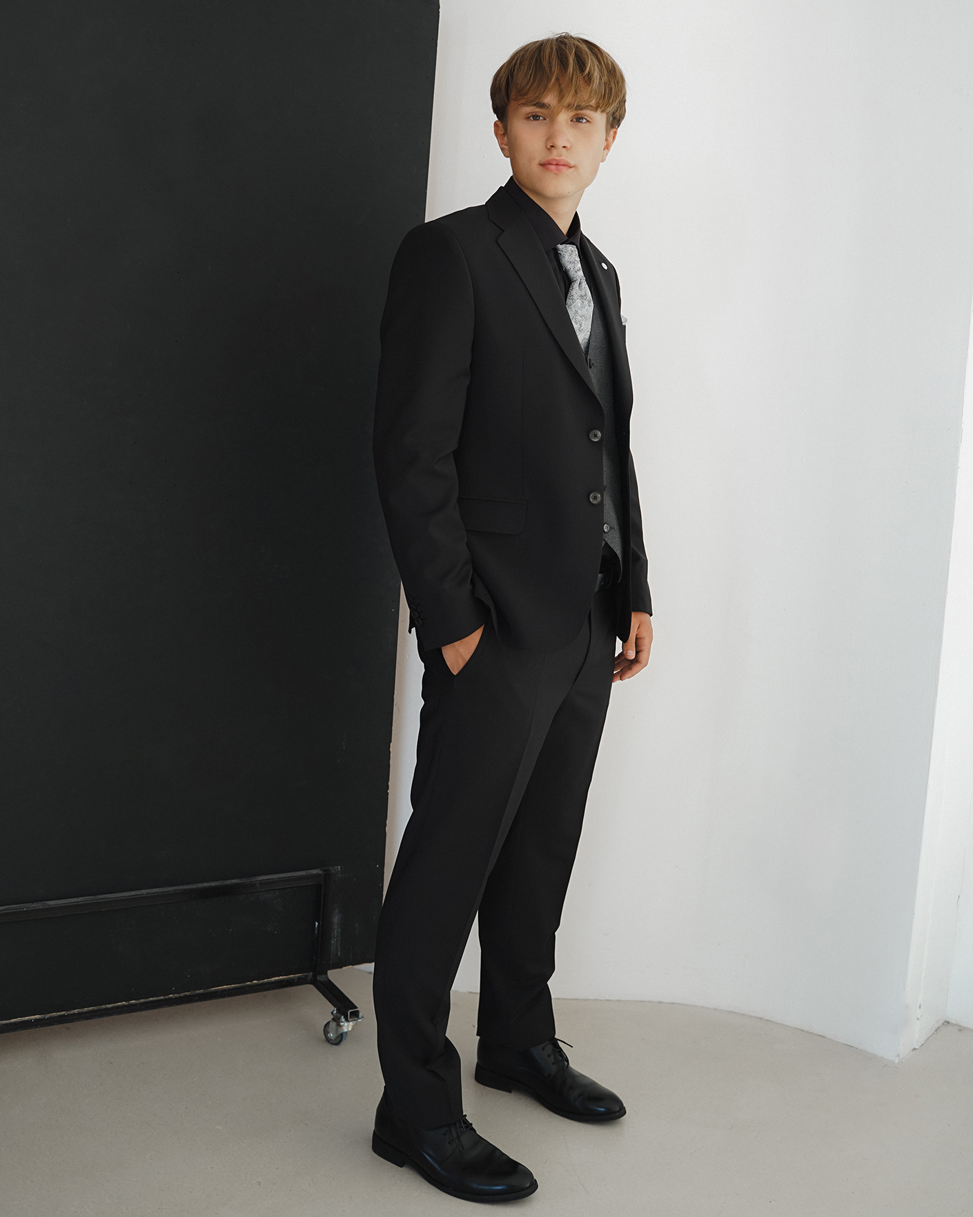 Идеальный образ на выпускной вечер состоит из черного пиджака с карманами с клапанами, из жилета серого цвета в мелкий оптический рисунок, из хлопковой рубашки черного цвета, а также из классических брюк со стрелками.