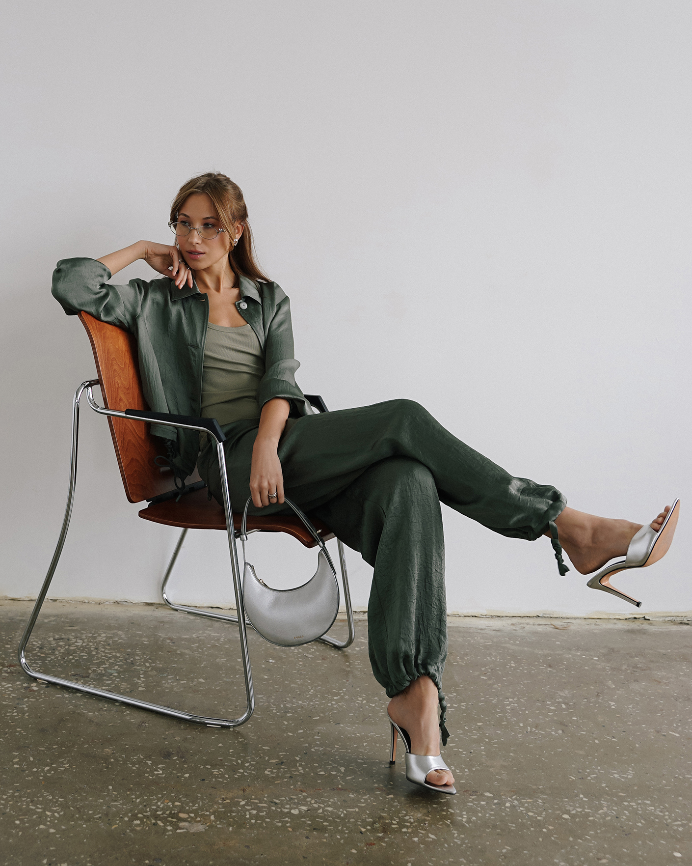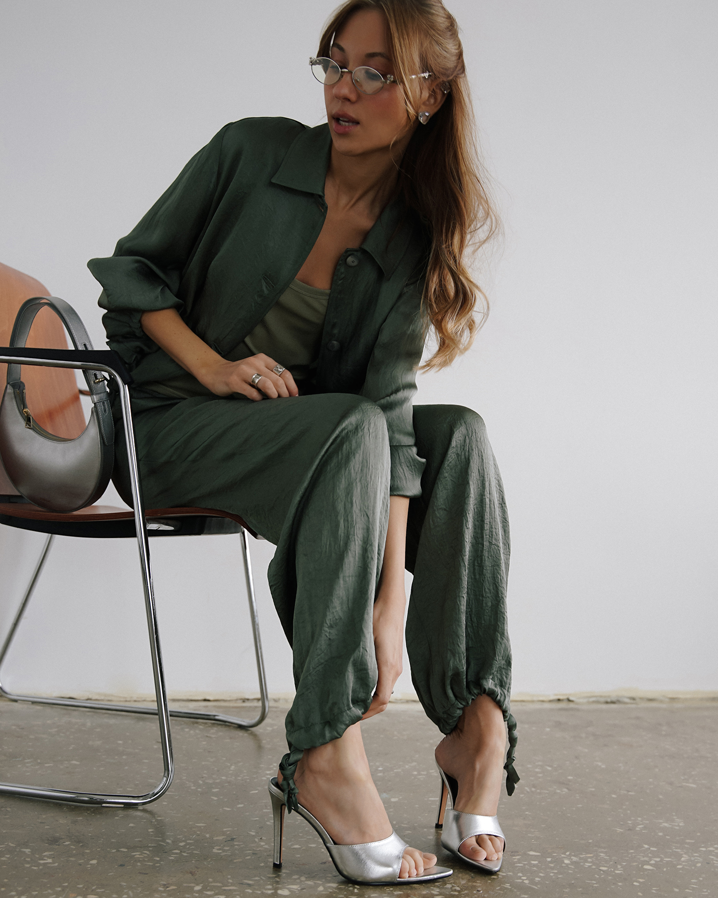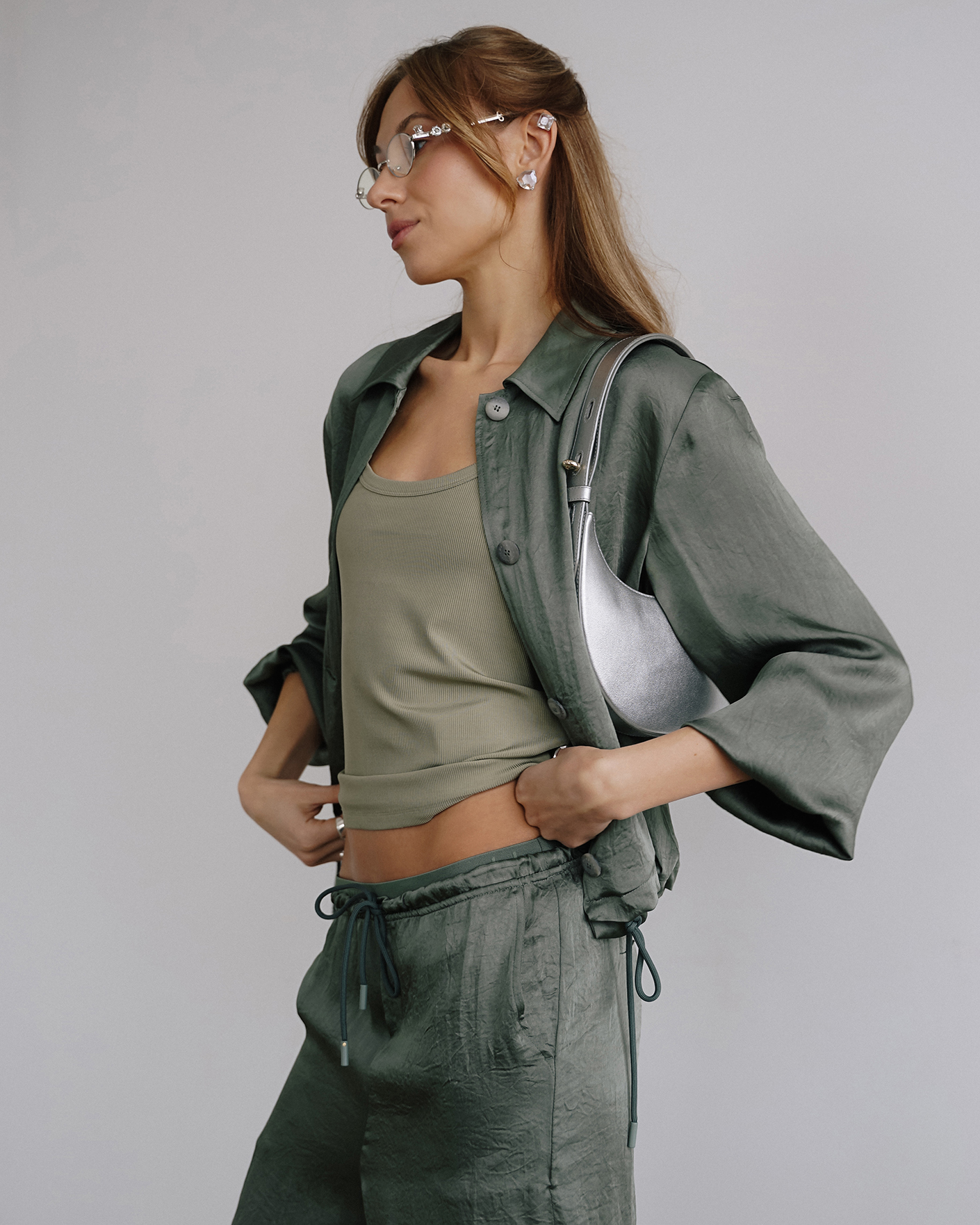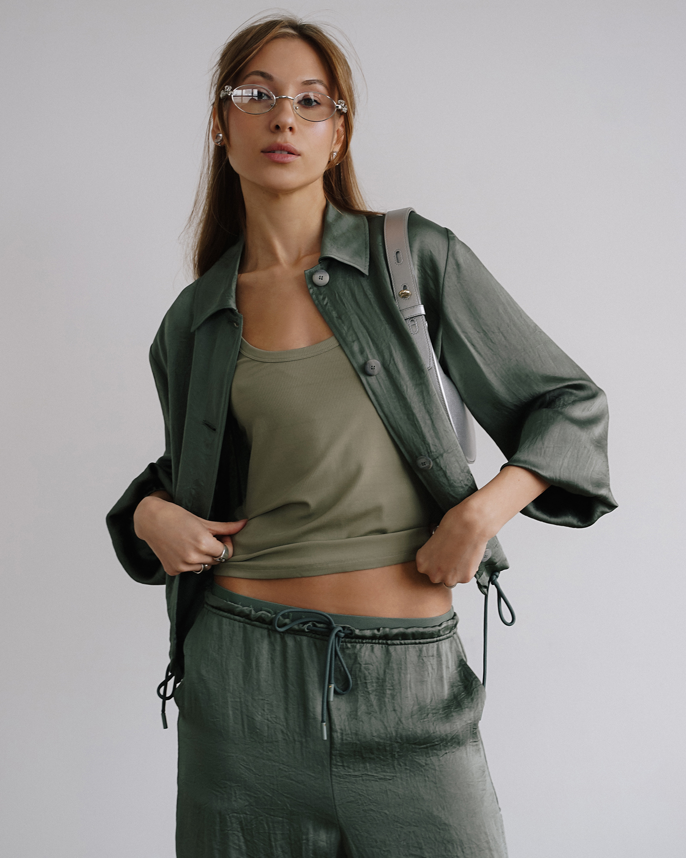Идеальный образ от Marella для стильных прогулок состоит из блузы фисташкового цвета с атласным блеском, из приталенной майки оливкового цвета в рубчик, также из брюк фисташкового цвета с атласным блеском.