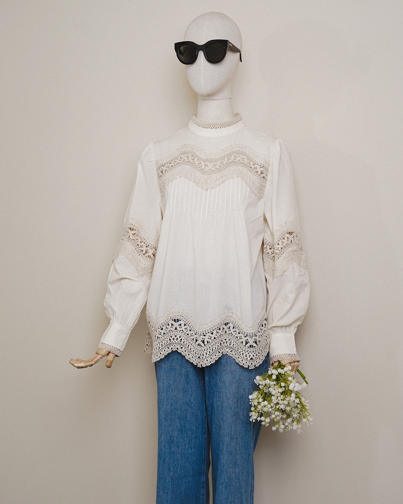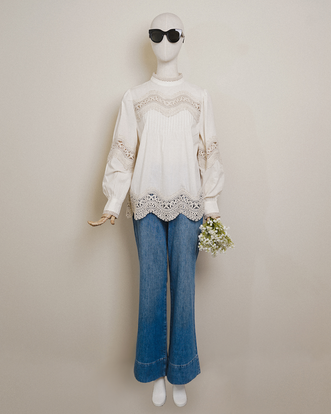 Идеальный образ от OUI для прогулок состоит из хлопковой блузы белого цвета в кружевной рисунок и из джинс-труб голубого цвета из 100% хлопка.