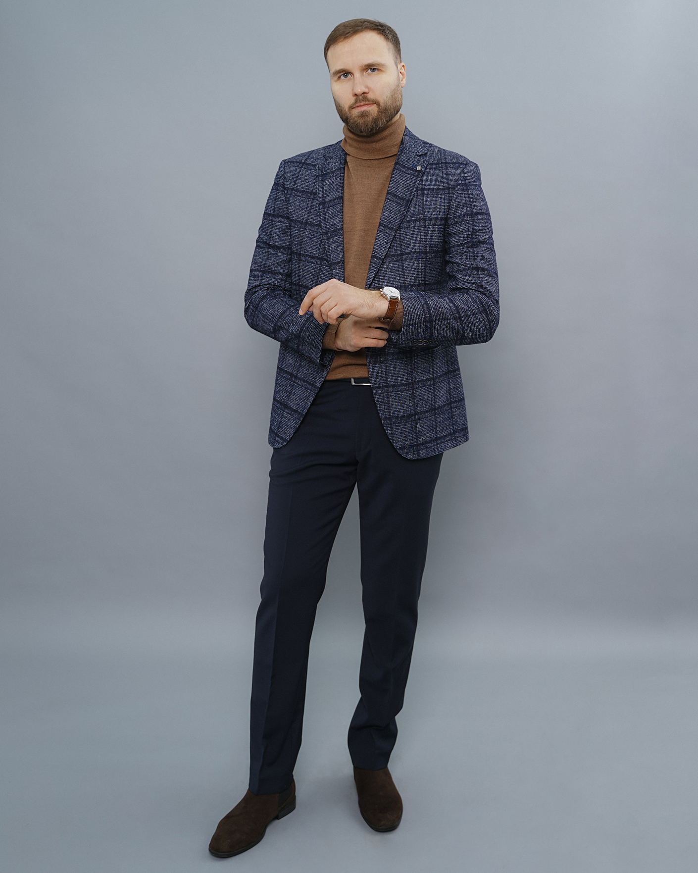 Классический образ для деловых встреч состоит из пиджака фиолетово-синего цвета в крупную клетку, из шерстяной водолазки коричневого цвета и из классических брюк темно-синего цвета.