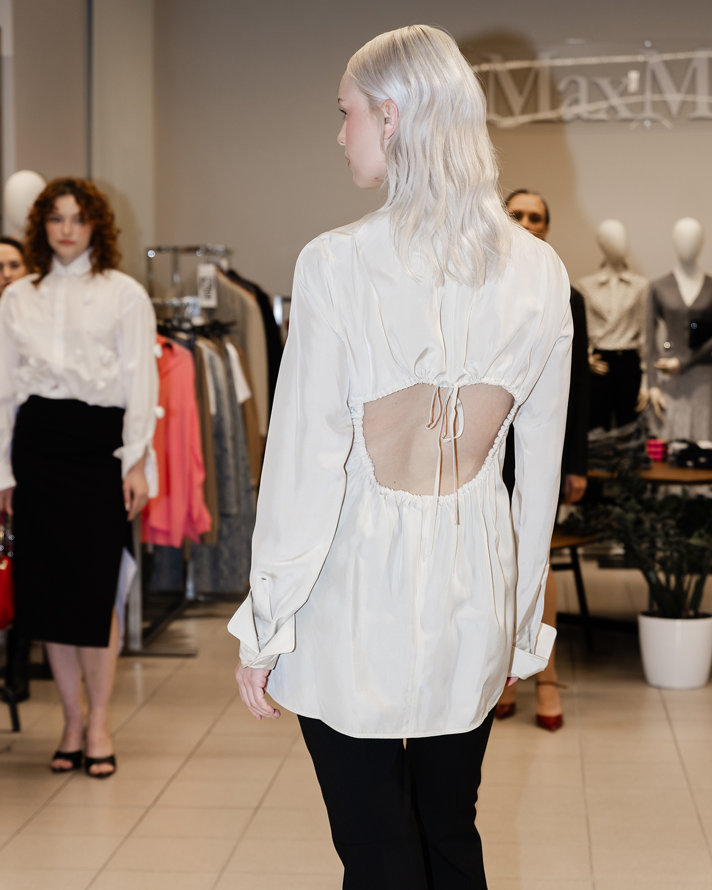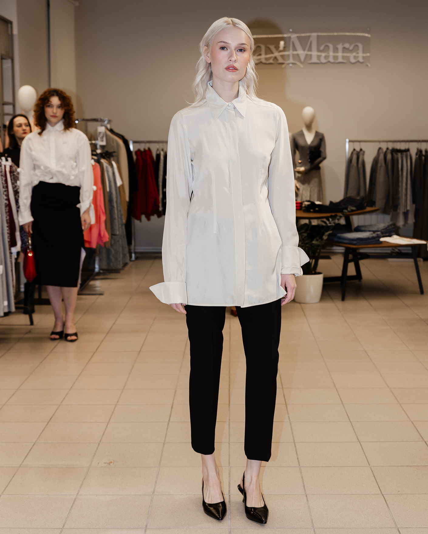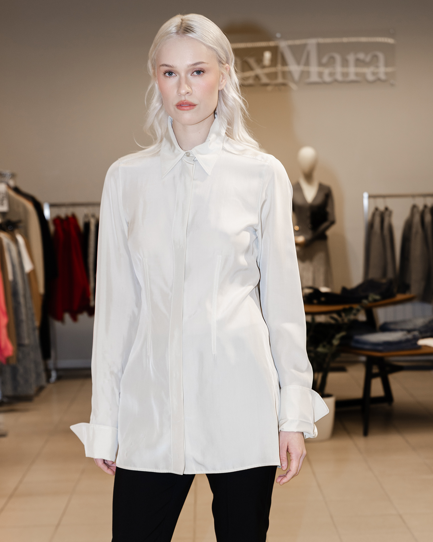 Классический образ для работы в офисе состоит из приталенной рубашки светло-бежевого цвета, изюминка которой, присборенный вырез, который оставляет часть спины открытой, а также из зауженных брюк в черном цвете из 100% шерсти.