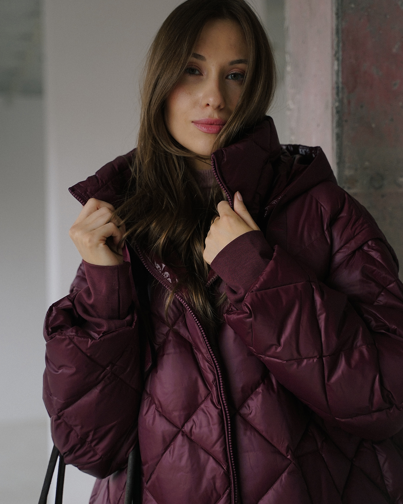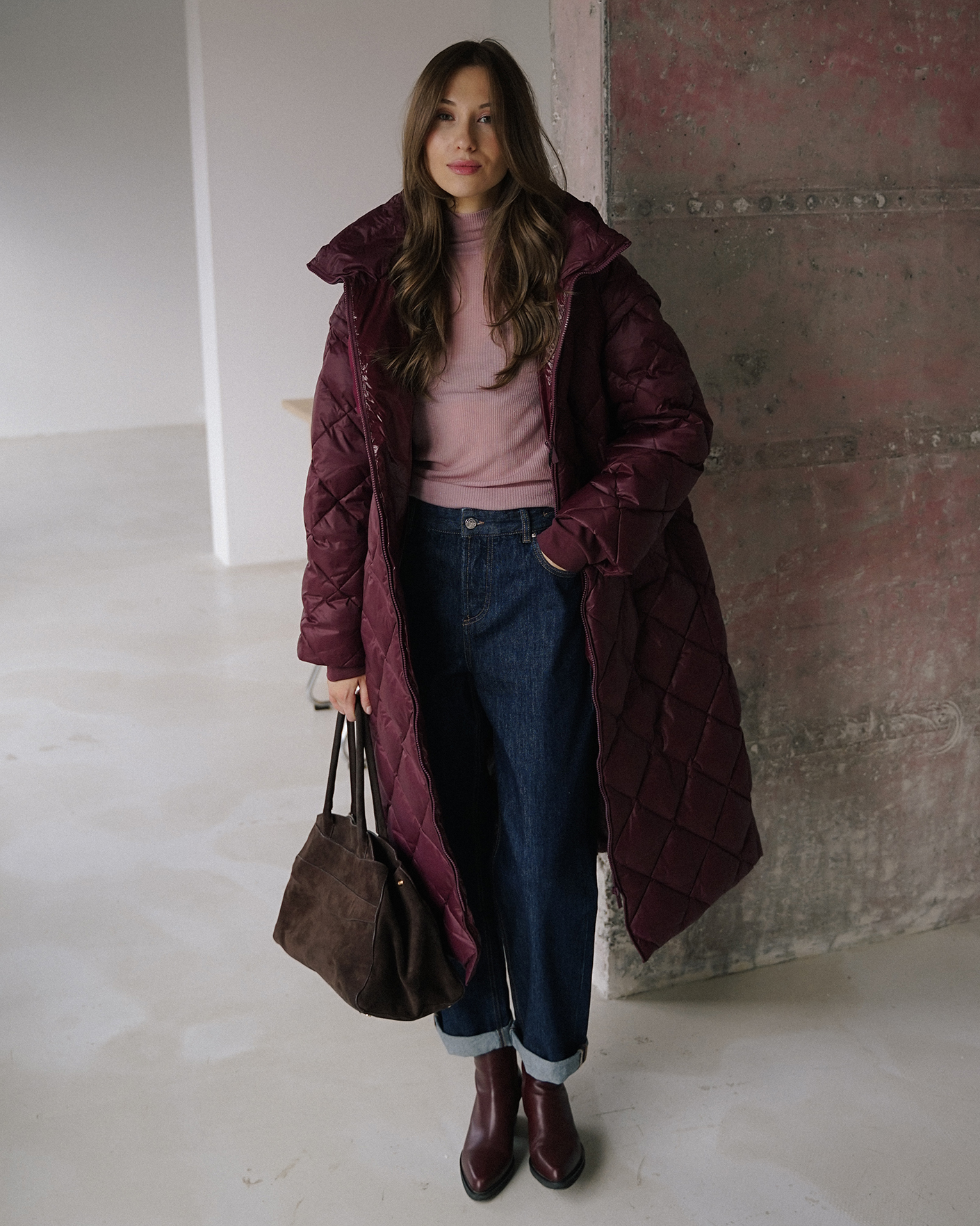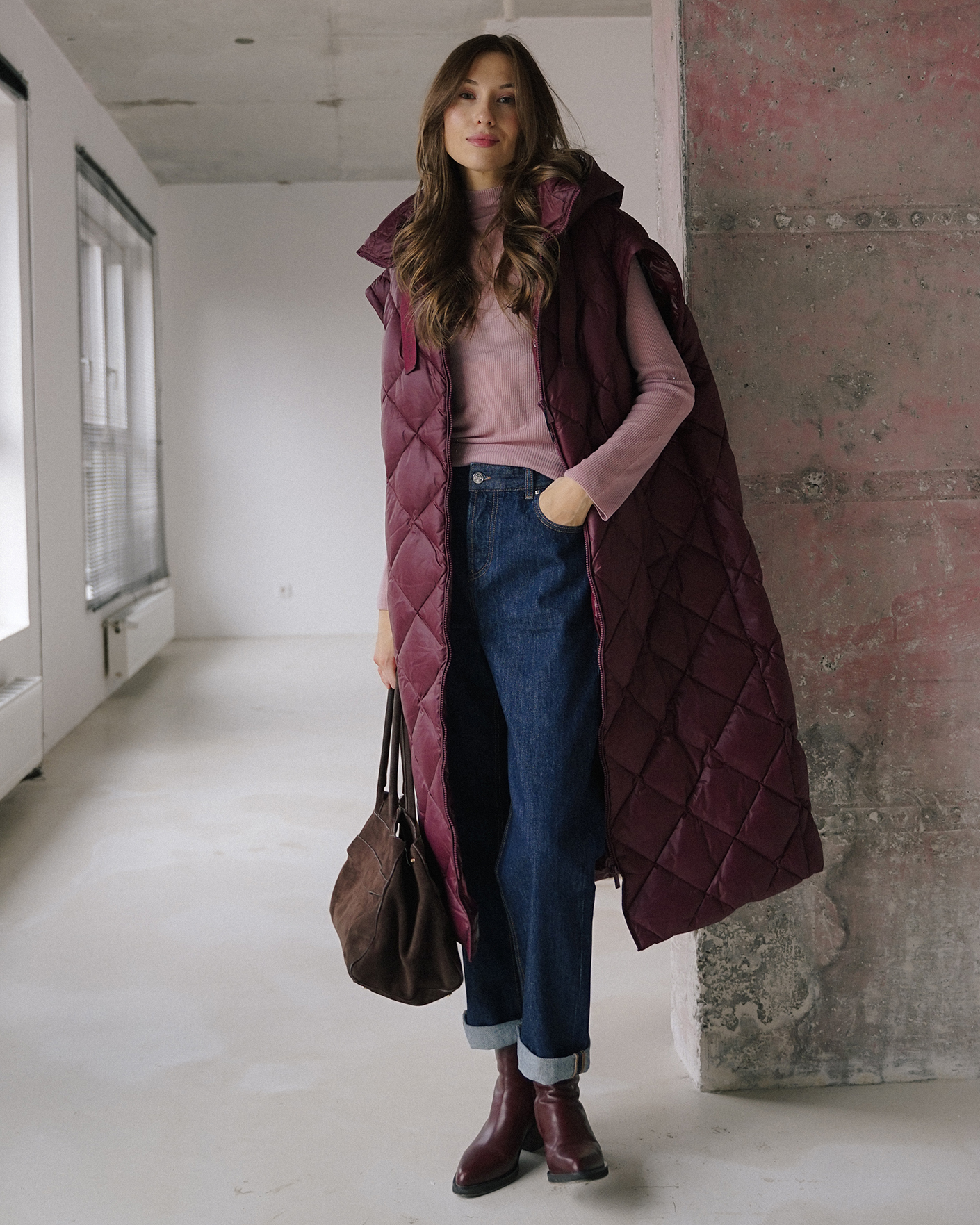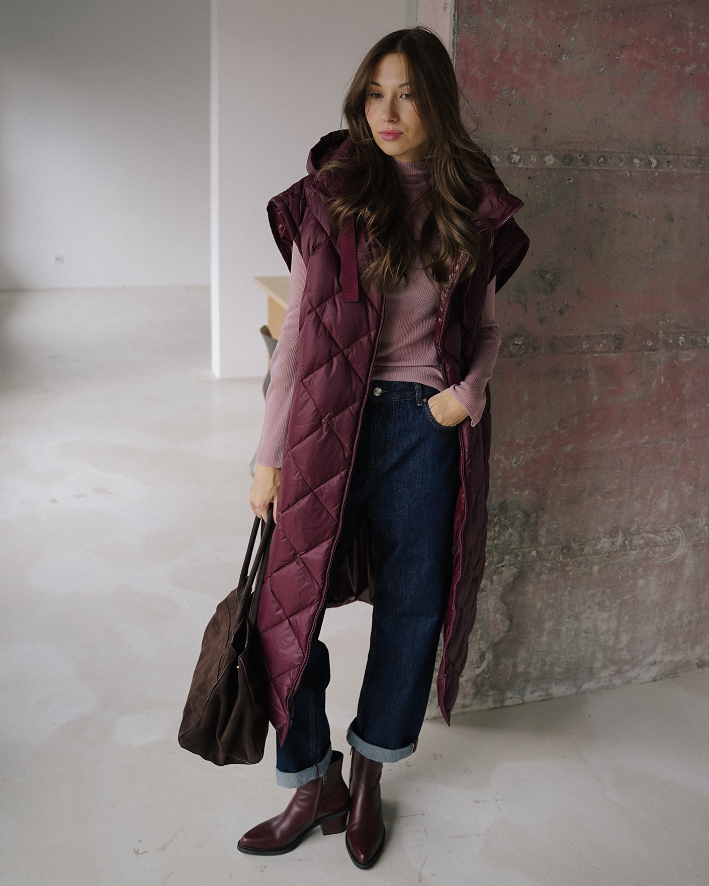 Комфортный образ для прогулок состоит из утепленного пальто-жилета вишневого цвета в ромбическую стежку, из шерстяной водолазки розового цвета в рубчик и со стразами, и из джинс темно-синего цвета из 100% хлопка.