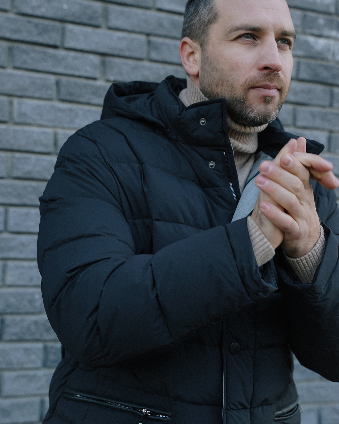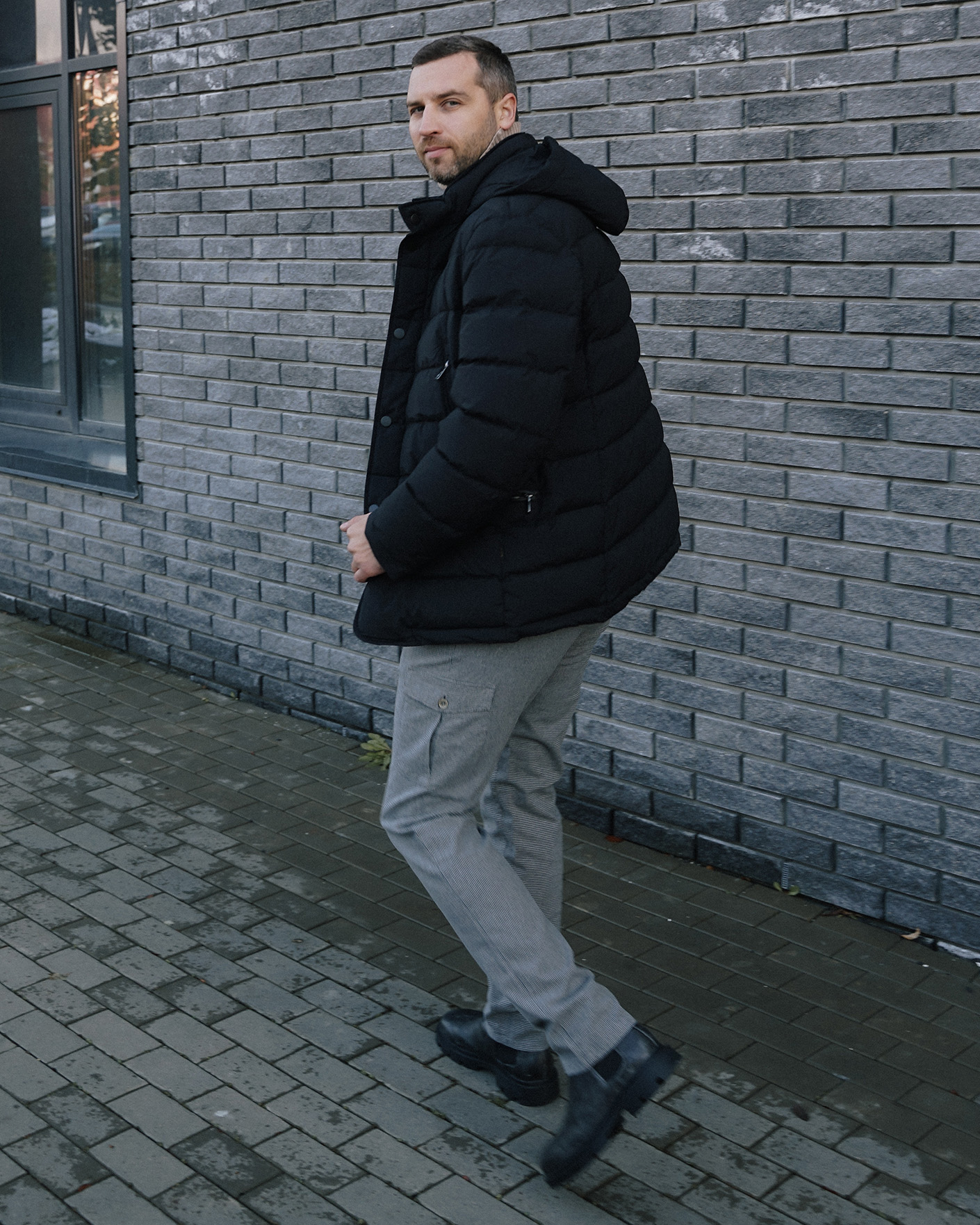 комфортный образ для прогулок: пуховик, свитер, брюки-карго