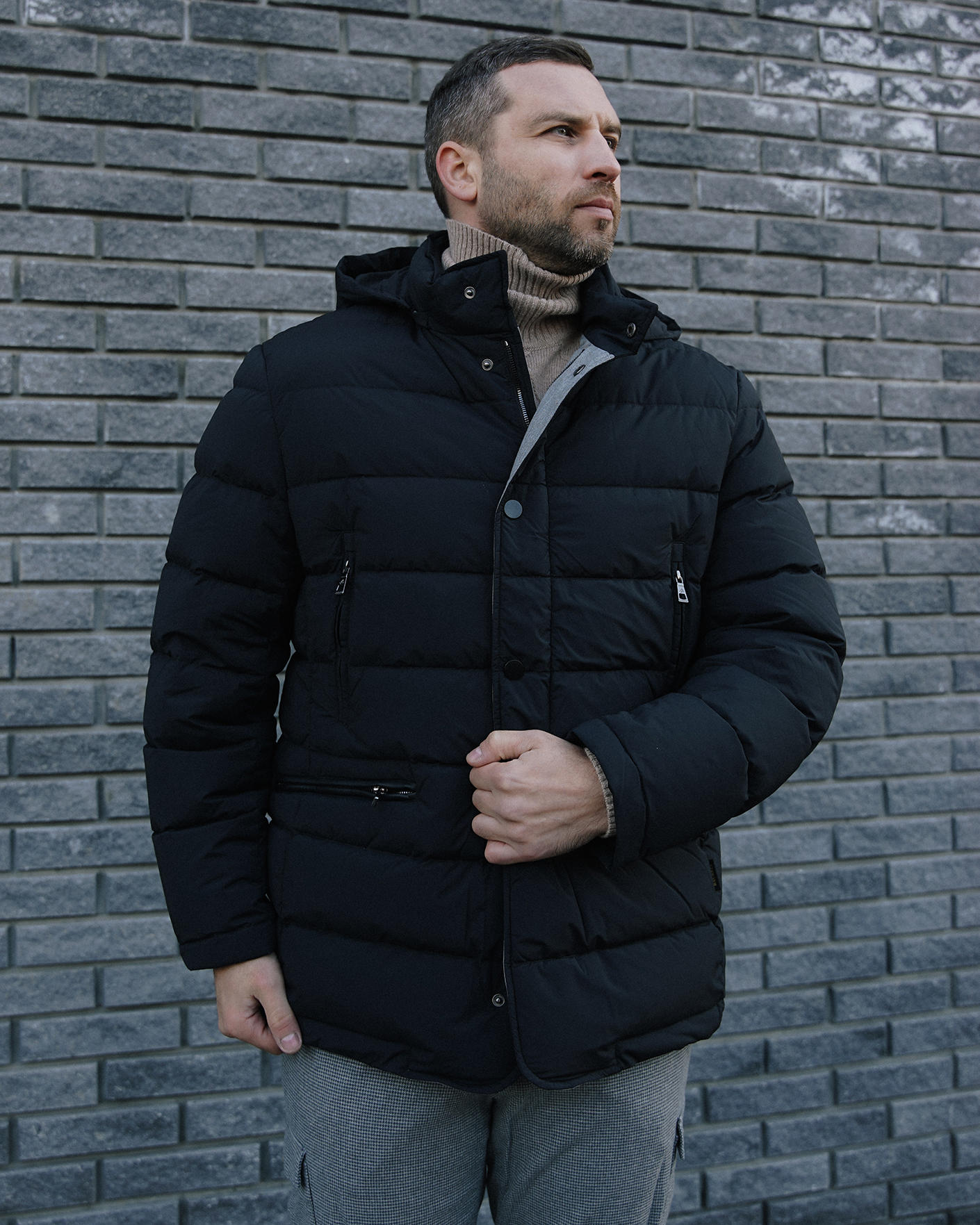 Комфортный образ для прогулок состоит из теплого пуховика черного цвета в стежку со съемным капюшоном, из шерстяного свитера бежевого цвета в вывязанный ромбический рисунок, также из хлопковых брюк-карго серого цвета в мелкий рисунок гусиные лапки.