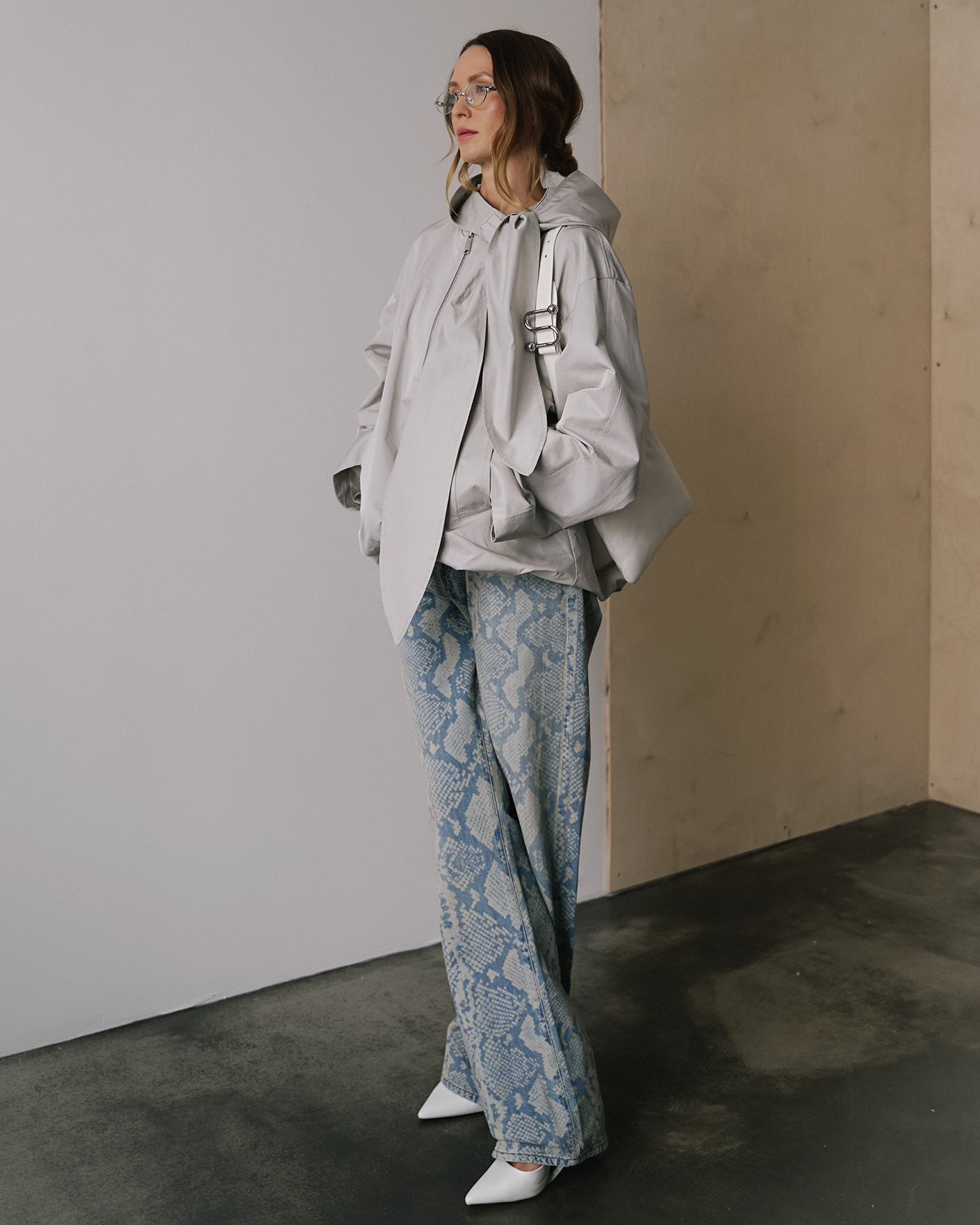 Комфортный образ на каждый день состоит из ветровки светло-серого цвета с капюшоном, из базовой футболки, а также из джинс серо-голубого цвета в змеиный принт, вывполненных из 100% хлопка.
