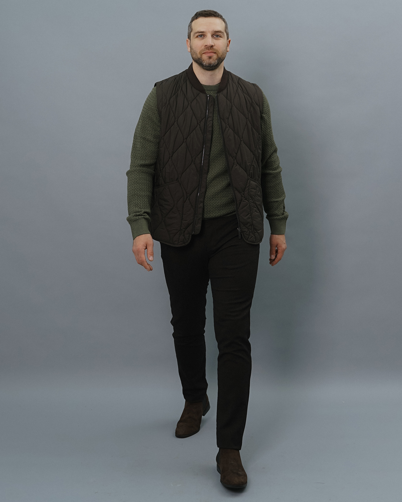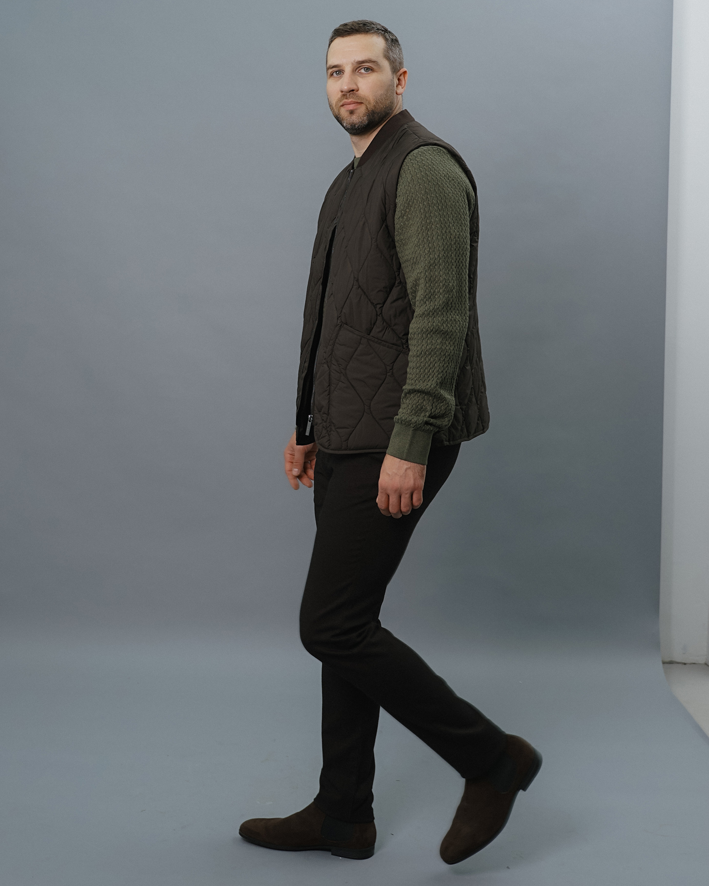 Комфортный образ на каждый день состоит из стеганого жилета темно-коричневого цвета на молнии, из джемпера оливкового цвета в вертикальный текстурный рисунок и из брюк-чинос коричневого цвета в мелкий рисунок.