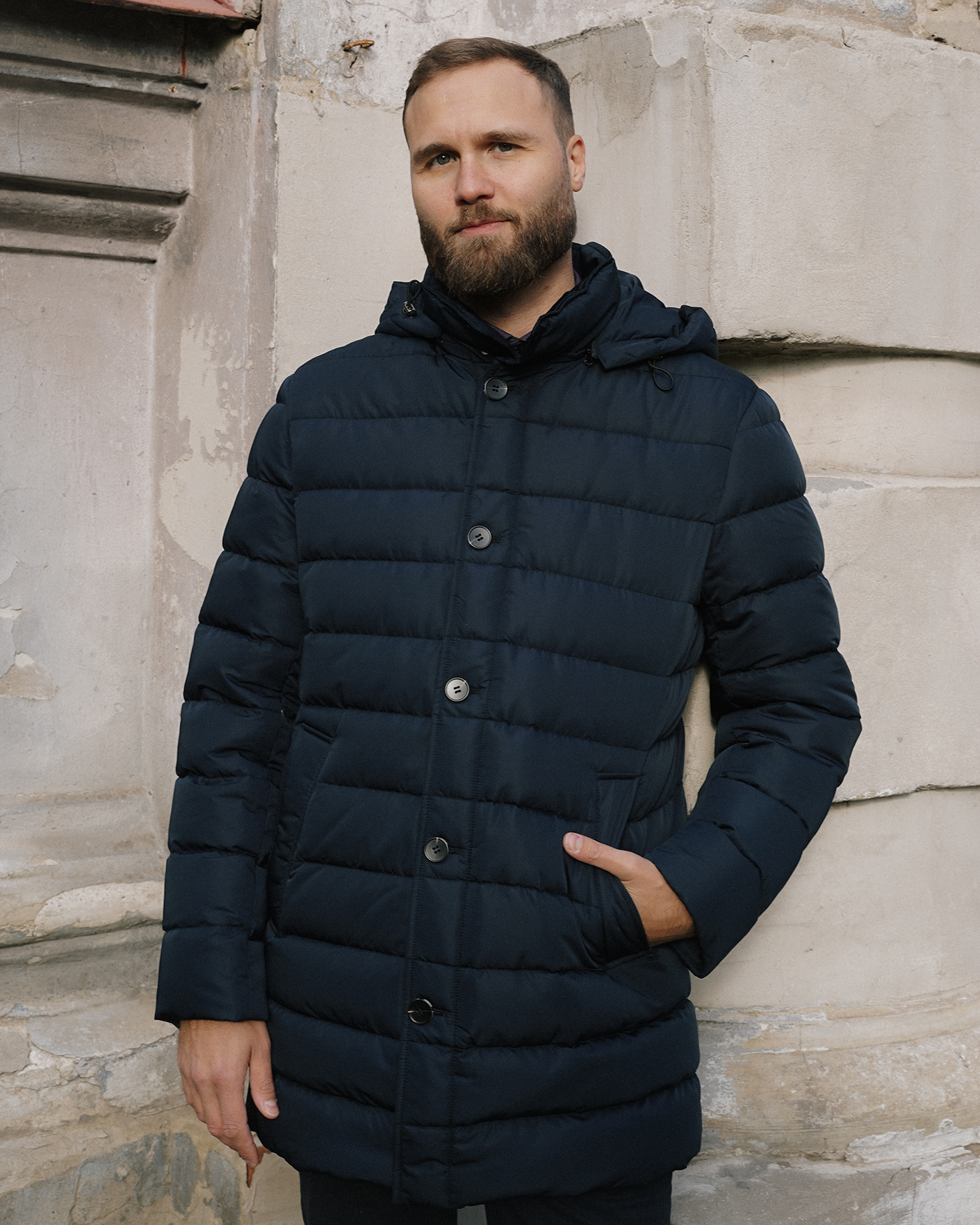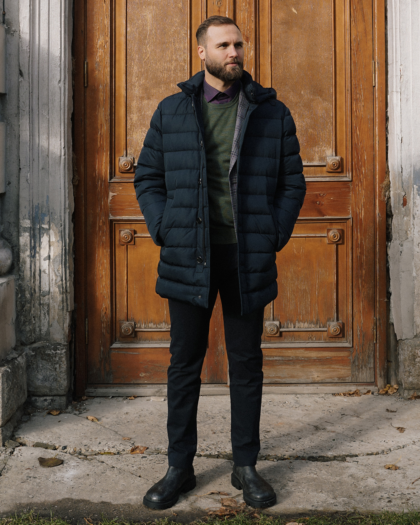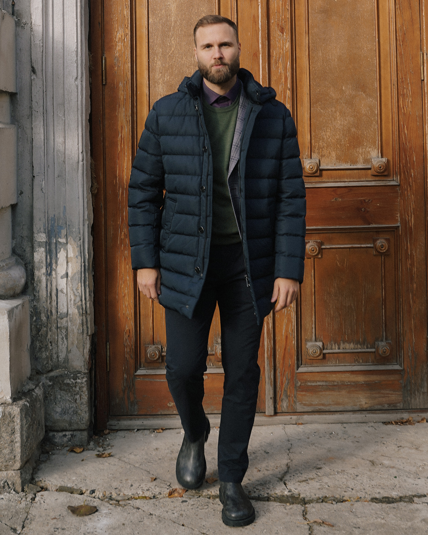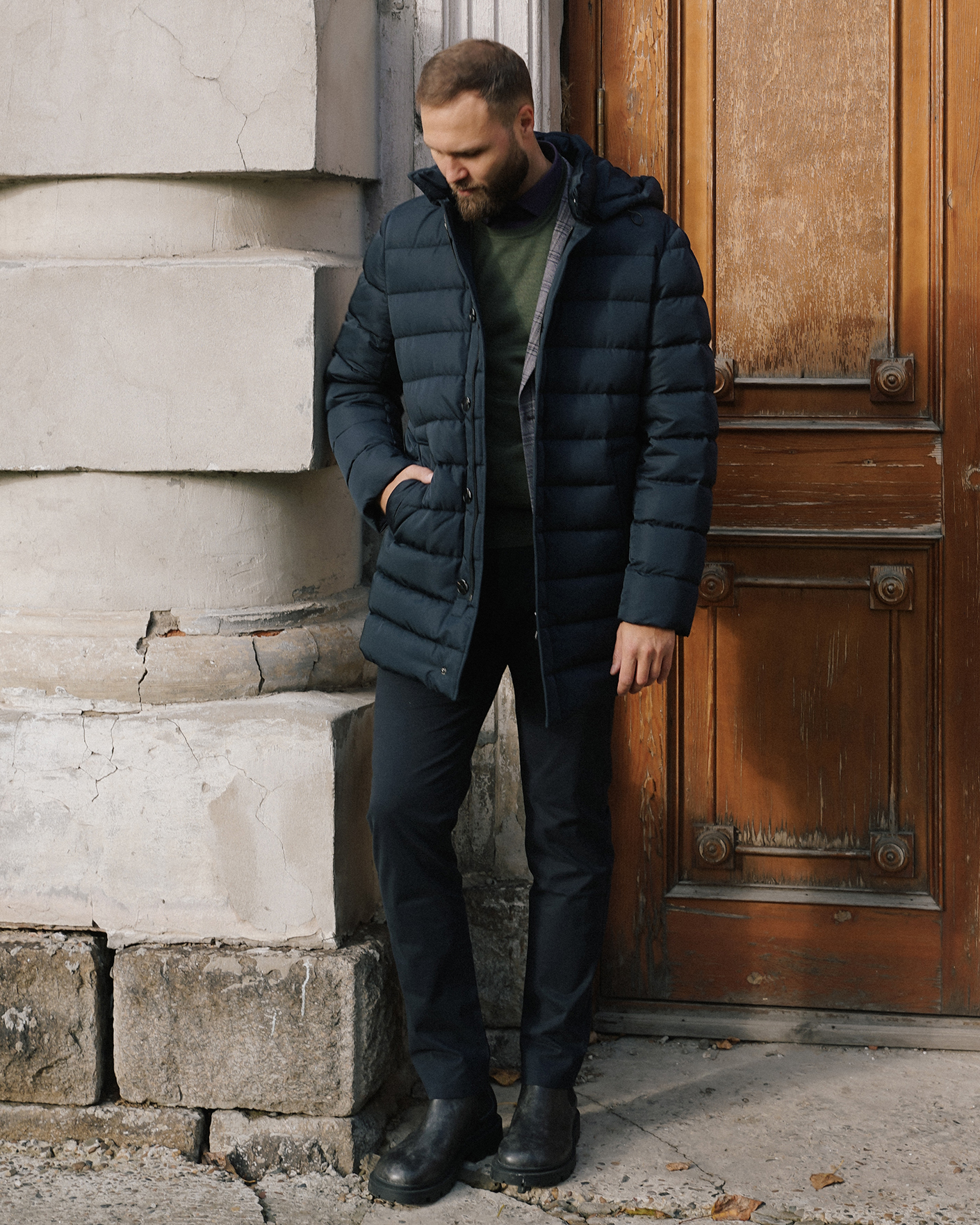 Многослойный образ на каждый день состоит из утепленного полупальто темно-синего цвета, из пиджака сине-серого цвета в крупную клетку, из базового джемпера из 100% шерсти, из хлопковой рубашки сливового цвета в мелкий оптический рисунок, также из брюк-чинос темно-синего цвета в строчный рисунок.