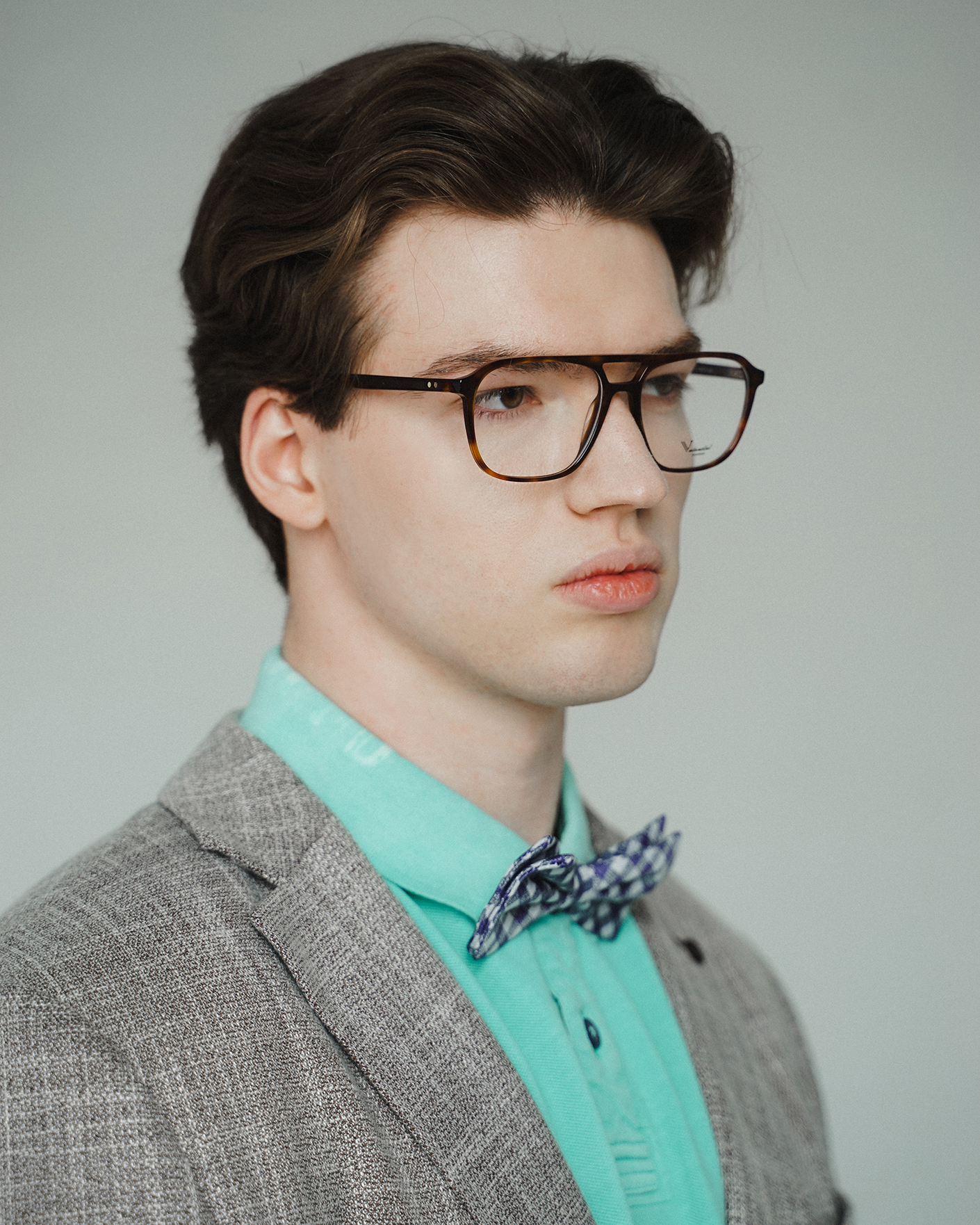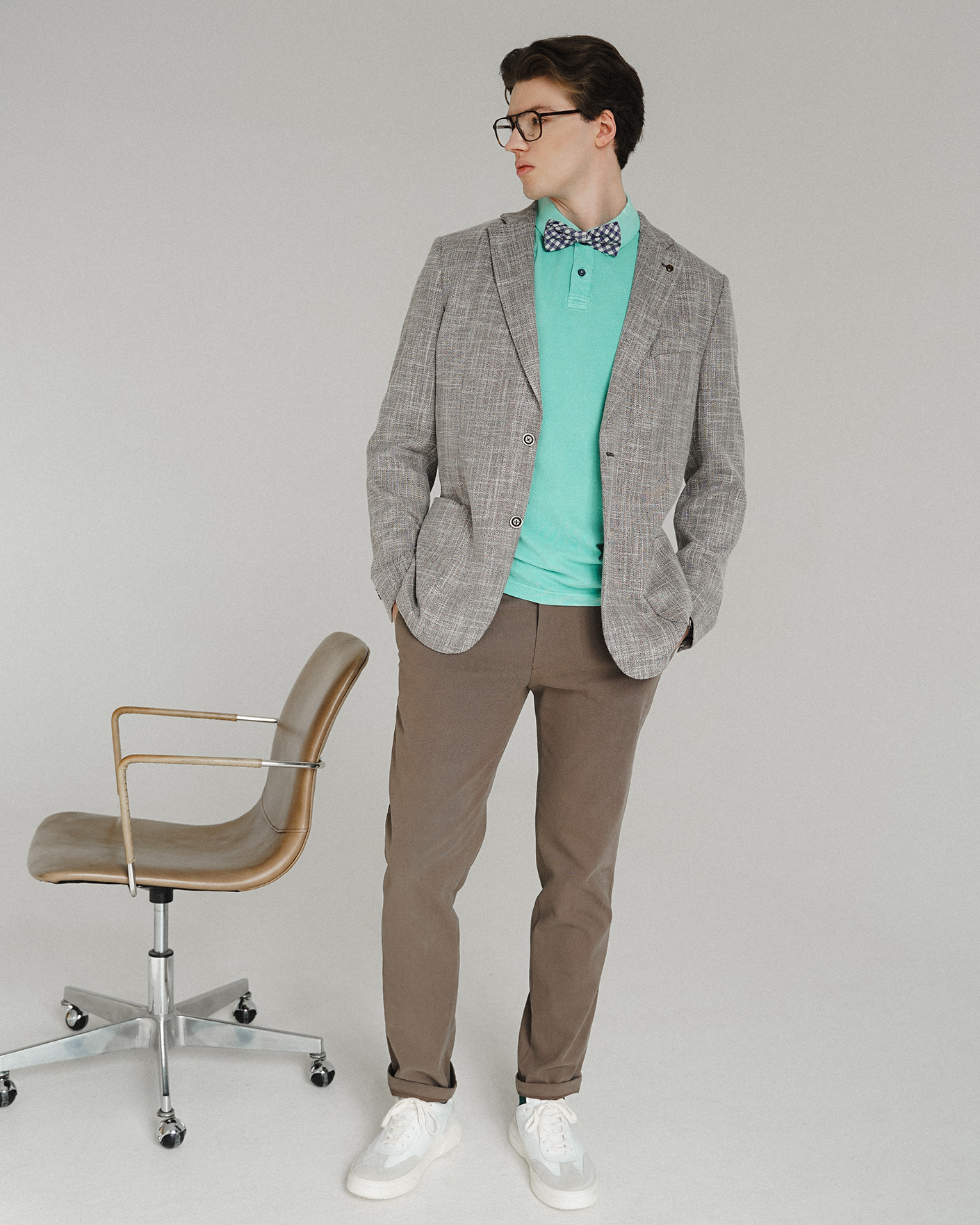 Образ для праздничного вечера состоит из пиджака бело-коричневого цвета в мелкий строчный рисунок, из футболки-поло мятного цвета из 100% хлопка, а также из хлопковых брюк-чинос коричневого цвета.