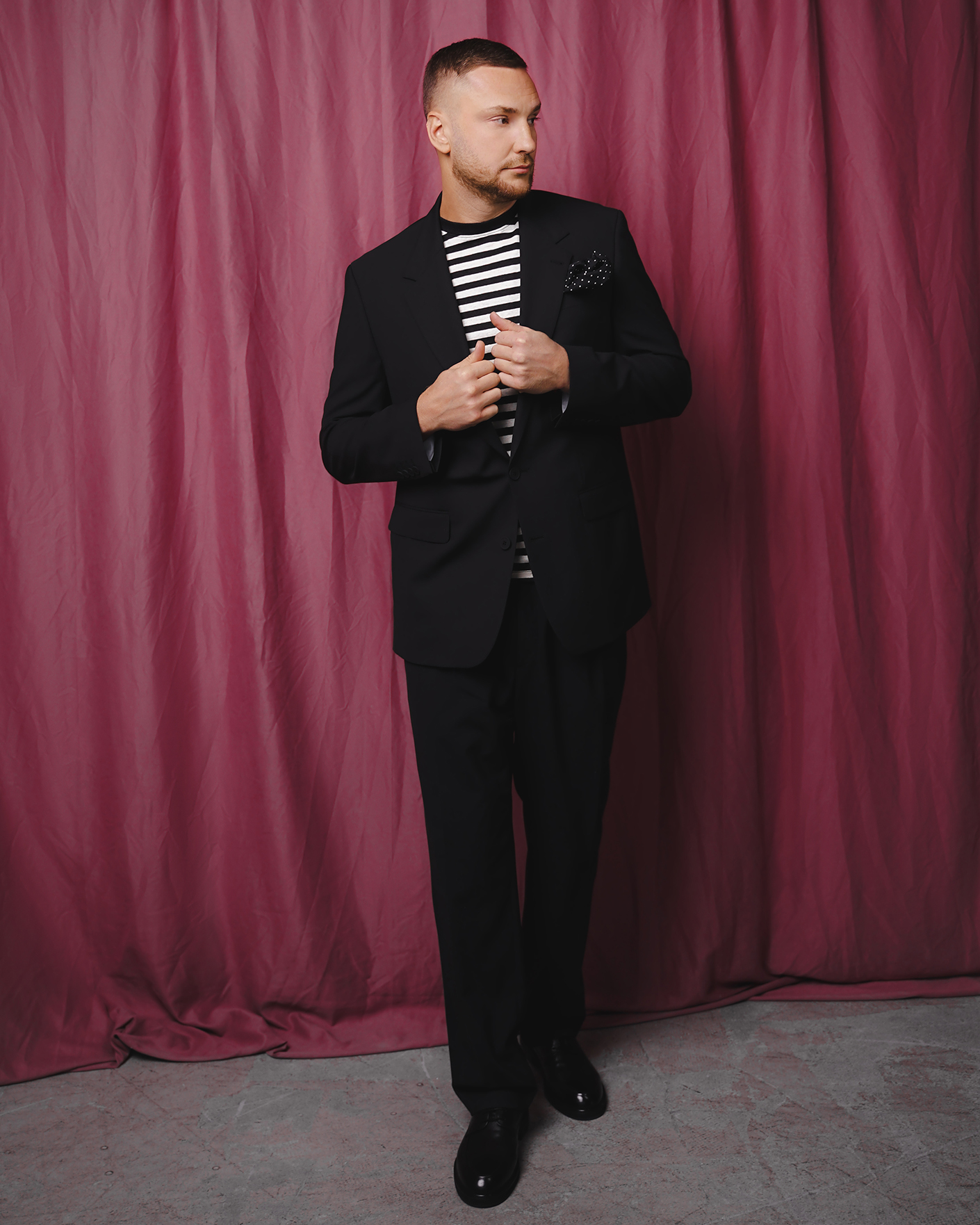 Образ для стильного вечера от Digel состоит из пиджака черного цвета в строчный рисунок, из льняной футболки сине-белого цвета в горизонтальную полосу, также из черных брюк с защипами.