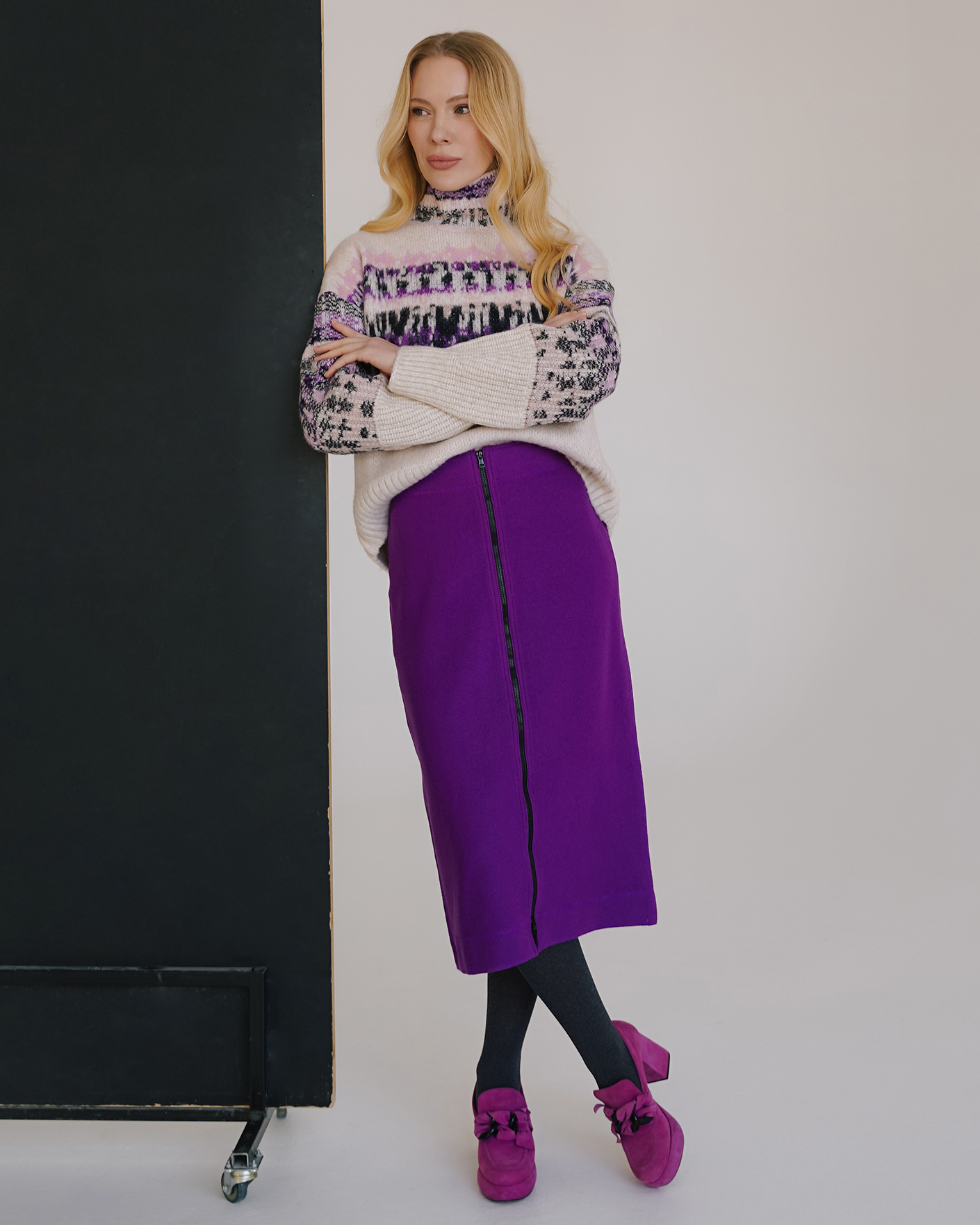 Универсальный образ от Marc Cain для работы в офисе состоит из свитера в скандинавский рисунок и из ярко-фиолетовой юбки карандаш с молнией по центру.