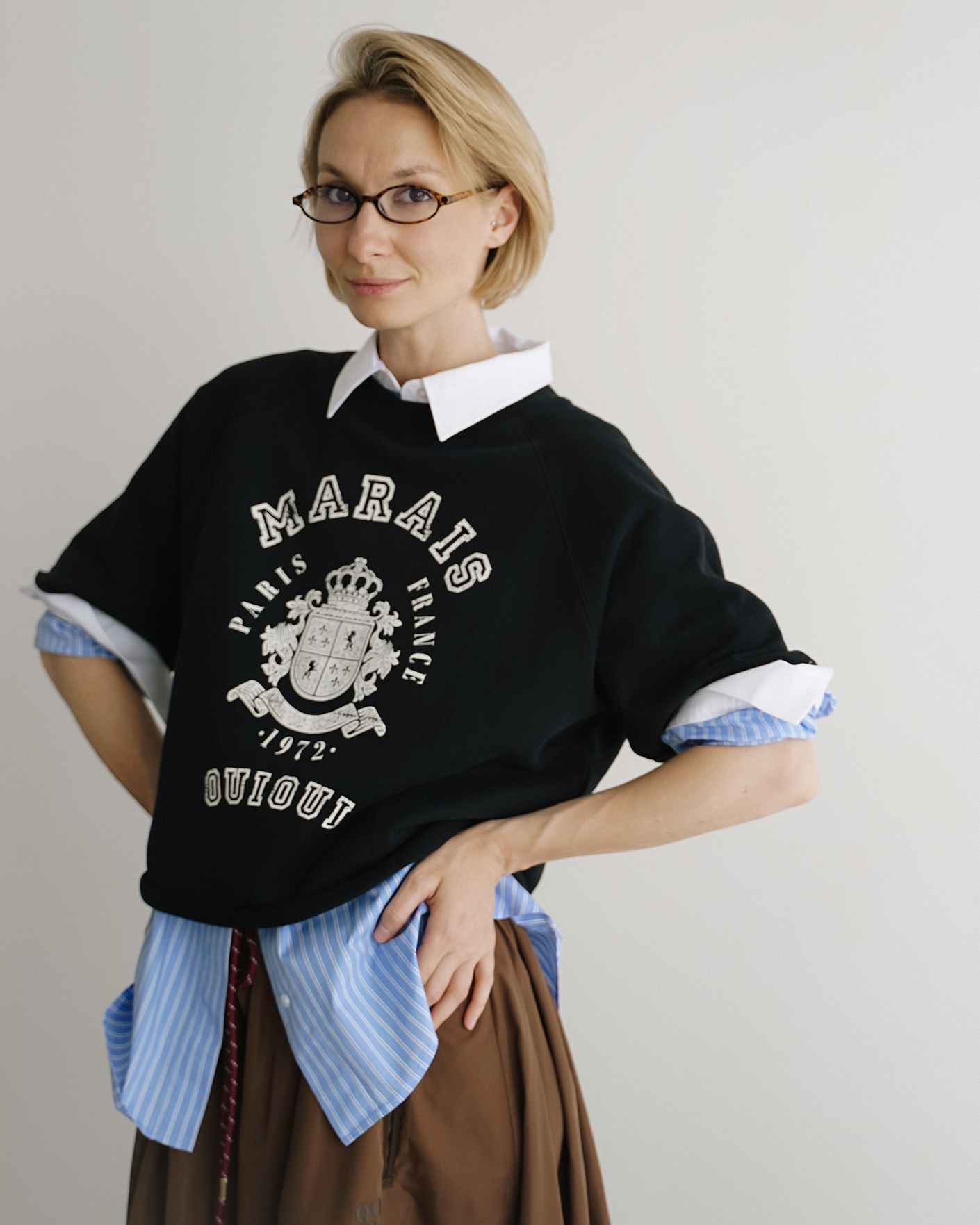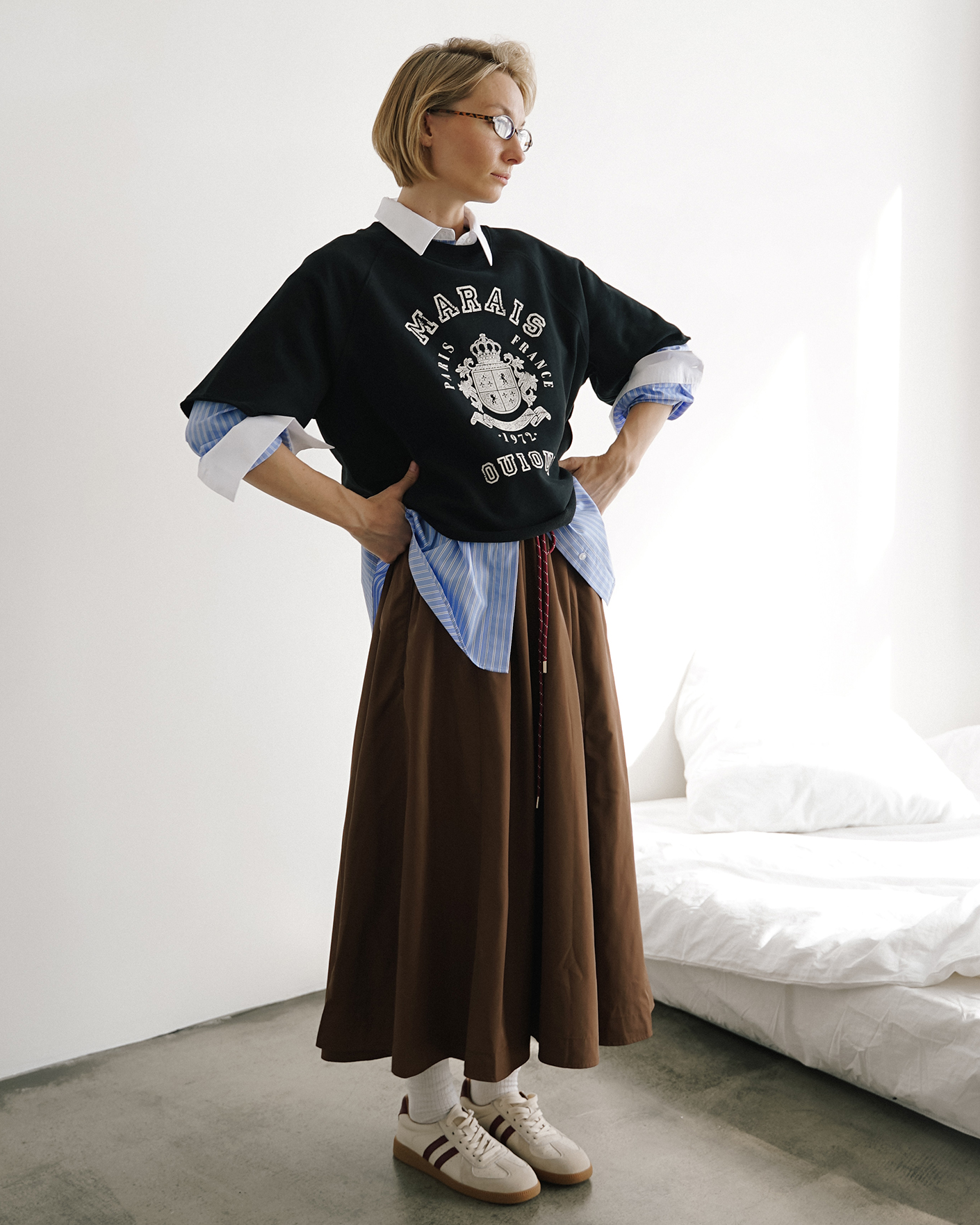 Образ от OUI для комфортных прогулок по городу состоит из укороченного свитшота черного цвета с принтом, выполненного из 100% хлопка, из хлопковой рубашки голубого цвета в вертикальную узкую полосу, а также из юбки четырехклинки коричневого цвета на эластичном поясе со шнурком.