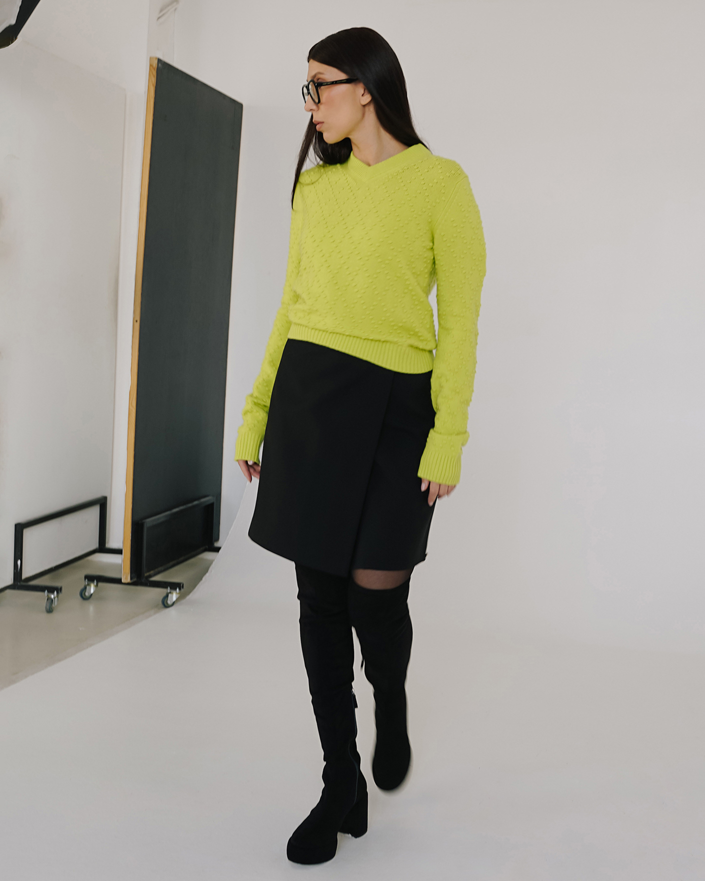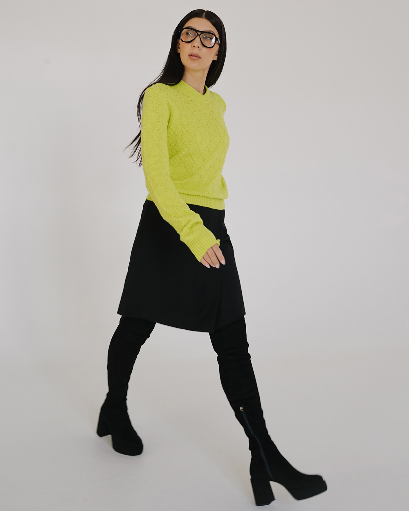Образ от Sportmax для работы в офисе состоит из пуловера салатового цвета в текстурный геометрический рисунок и из юбки-трапеции черного цвета на запахе из 100% шерсти.