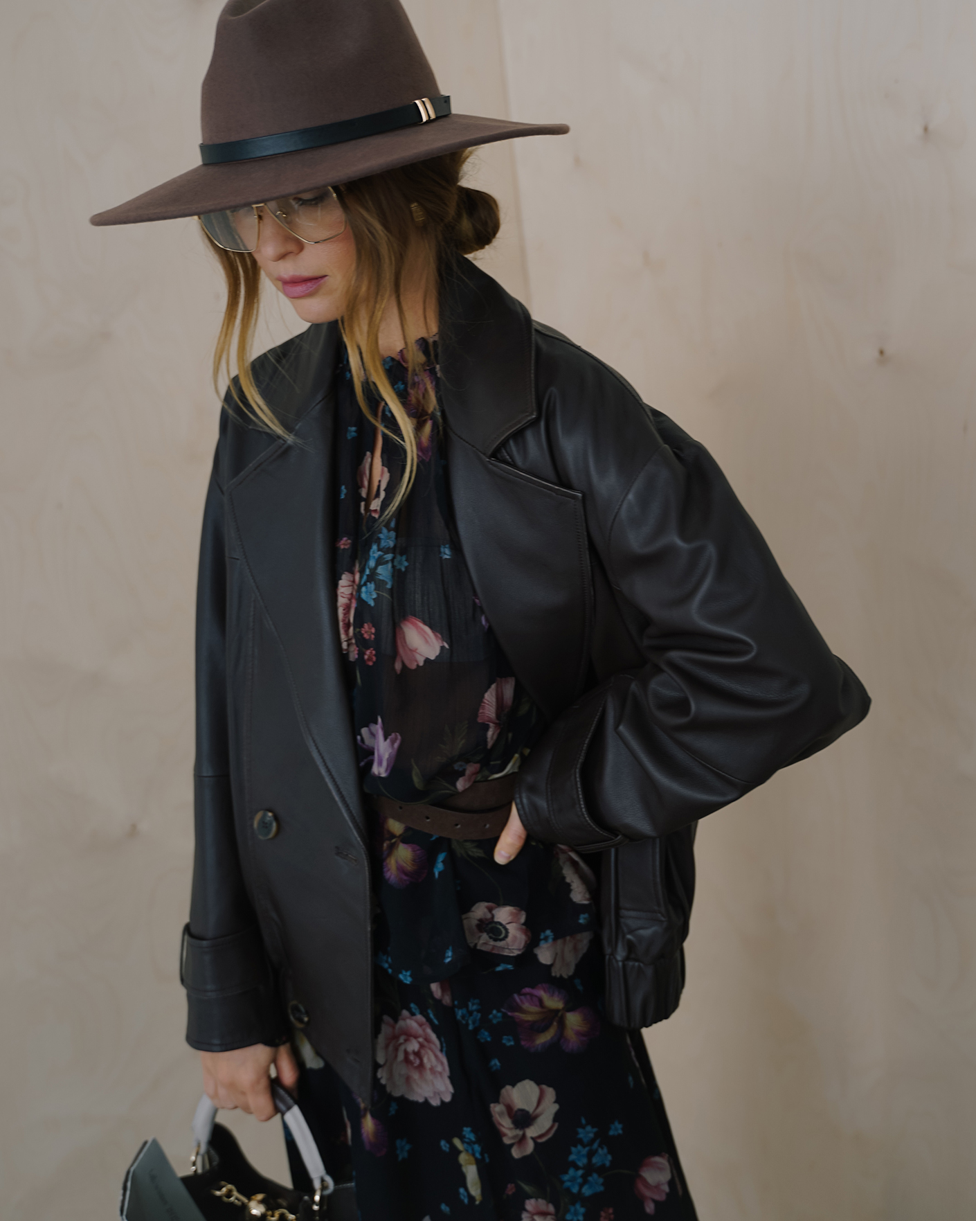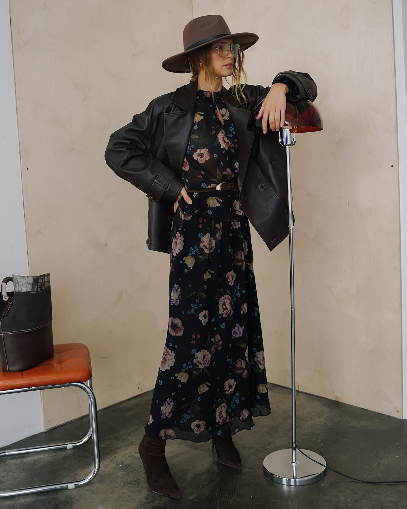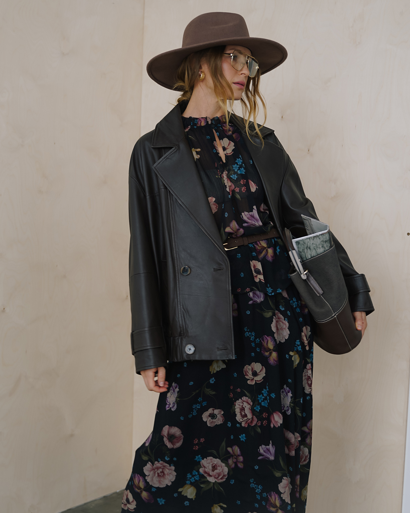 Образ в стиле бохо для стильных прогулок состоит из двубортной куртки темно-коричневого цвета с блеском, из блузы и юбки розово-черного цвета в крупный цветочный принт.