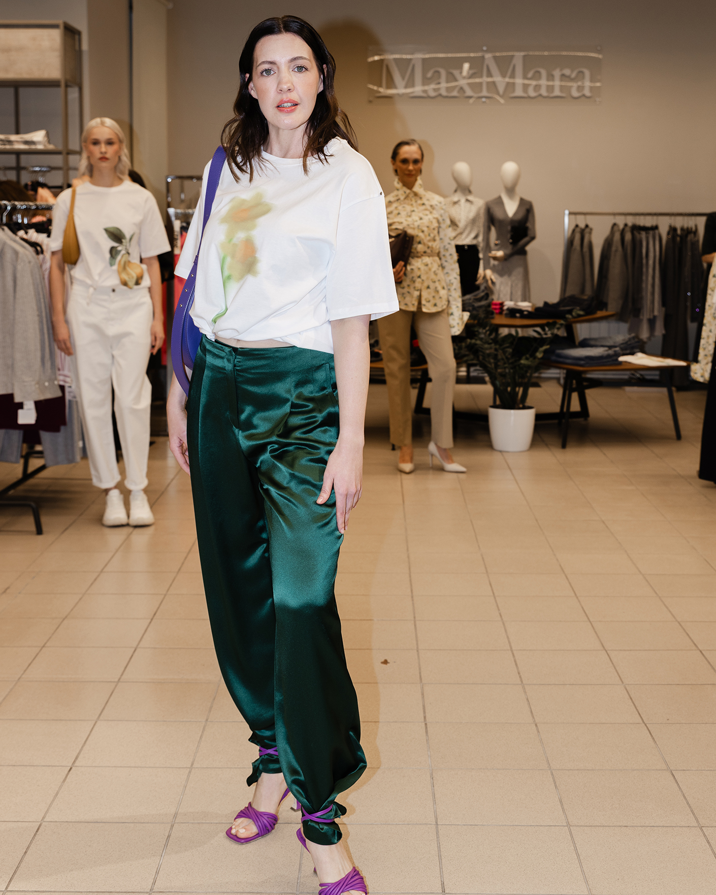 Повседневный образ и для прогулок состоит из свободной футболки белого цвета с размытым цветочным принтом и из брюк зеленого цвета с атласным блеском.