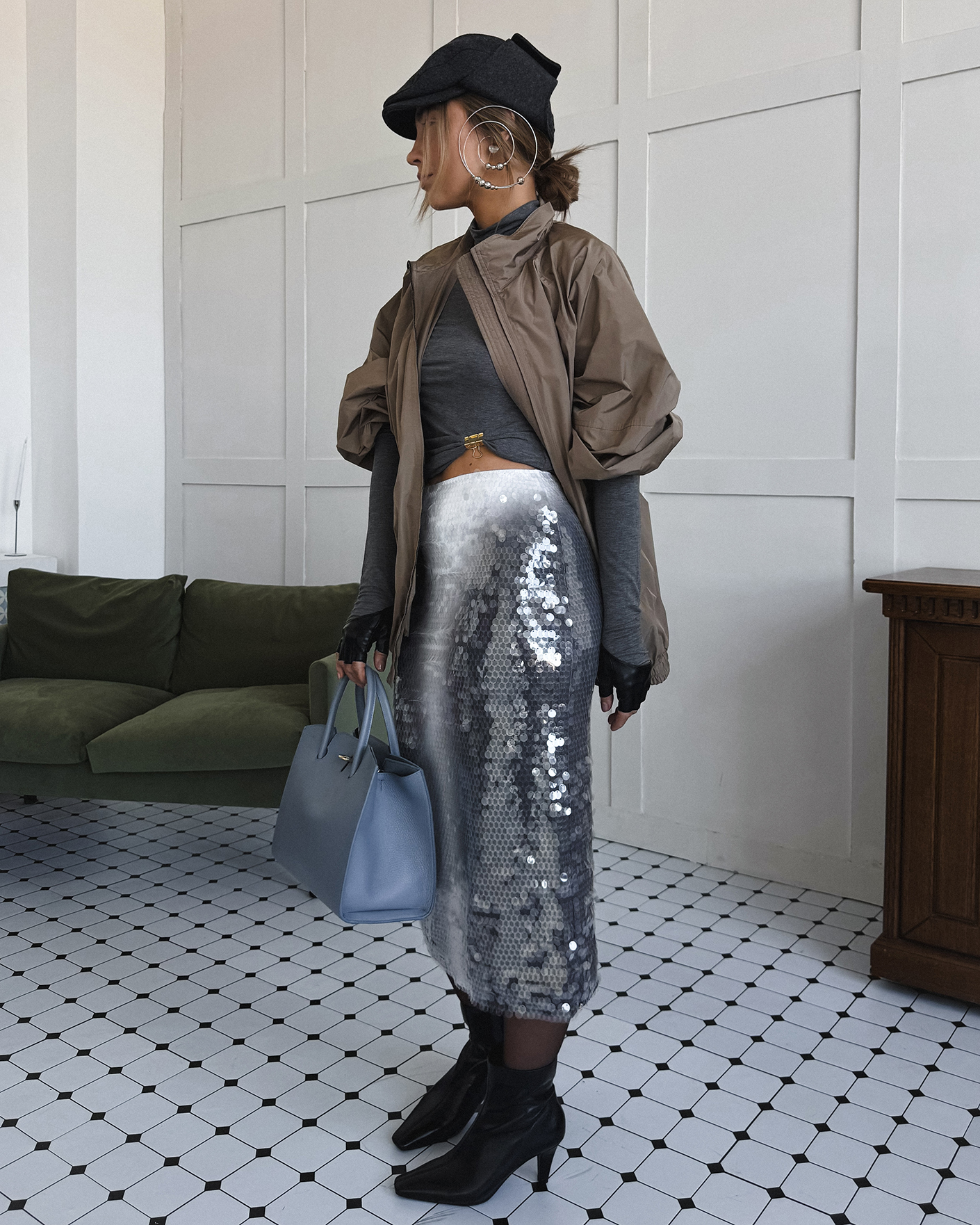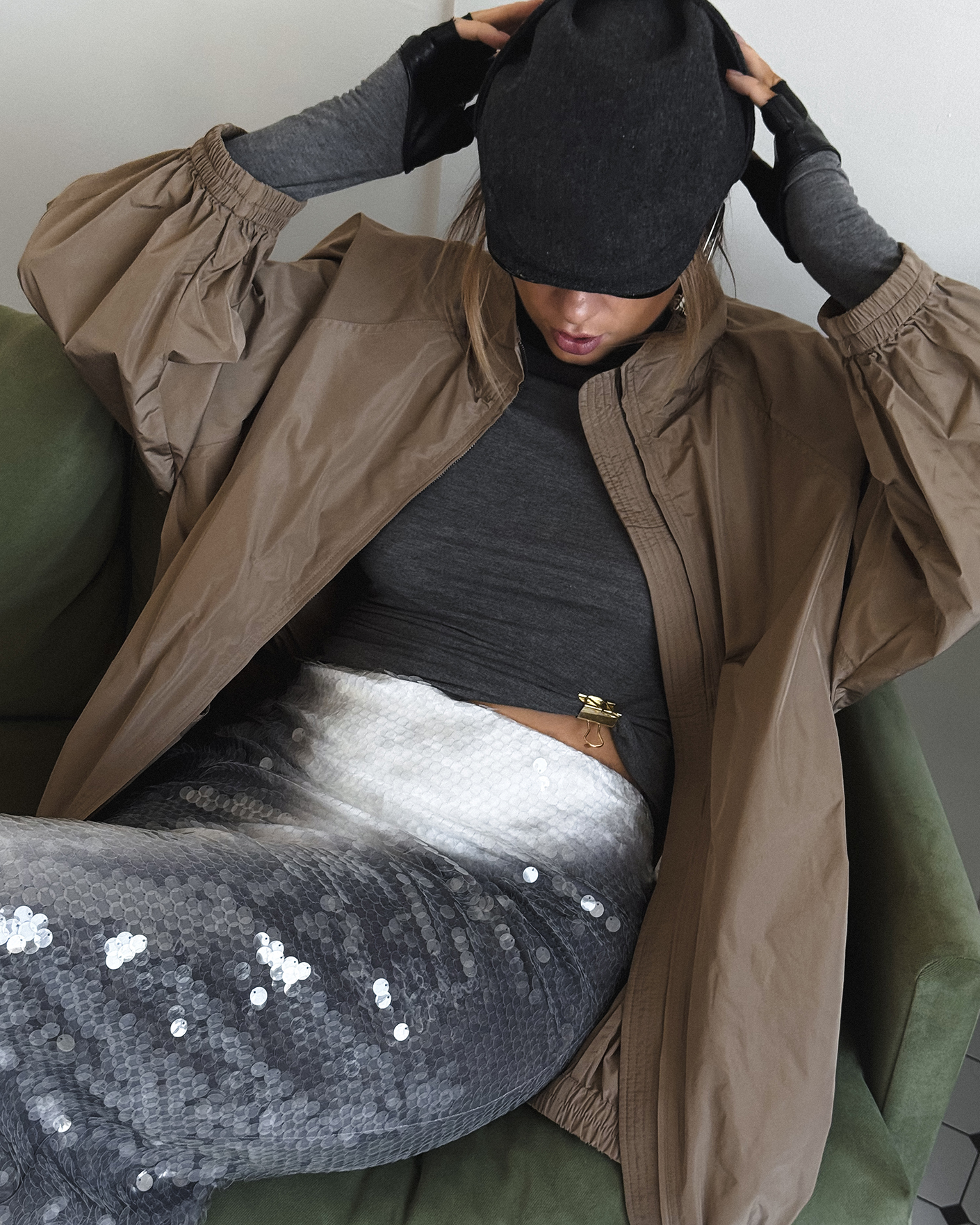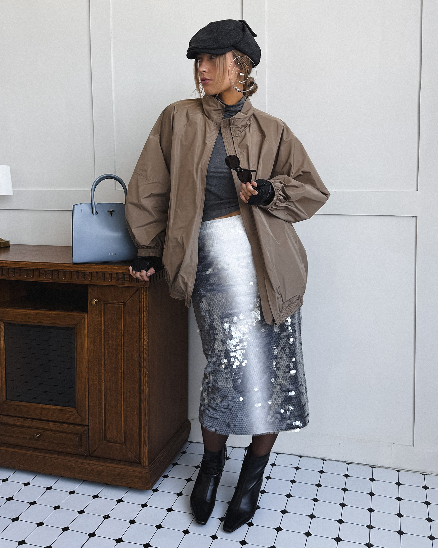 Современный образ для стильных прогулок по городу состоит из удлиненной ветровки-бомбер серо-бежевого цвета с застежкой на молнию, из приталенной водолазки в сером цвете, также из юбки-карандаш с крупными пайетками, что делаем образ более ярким. Смело добавляйте стильные аксессуары.