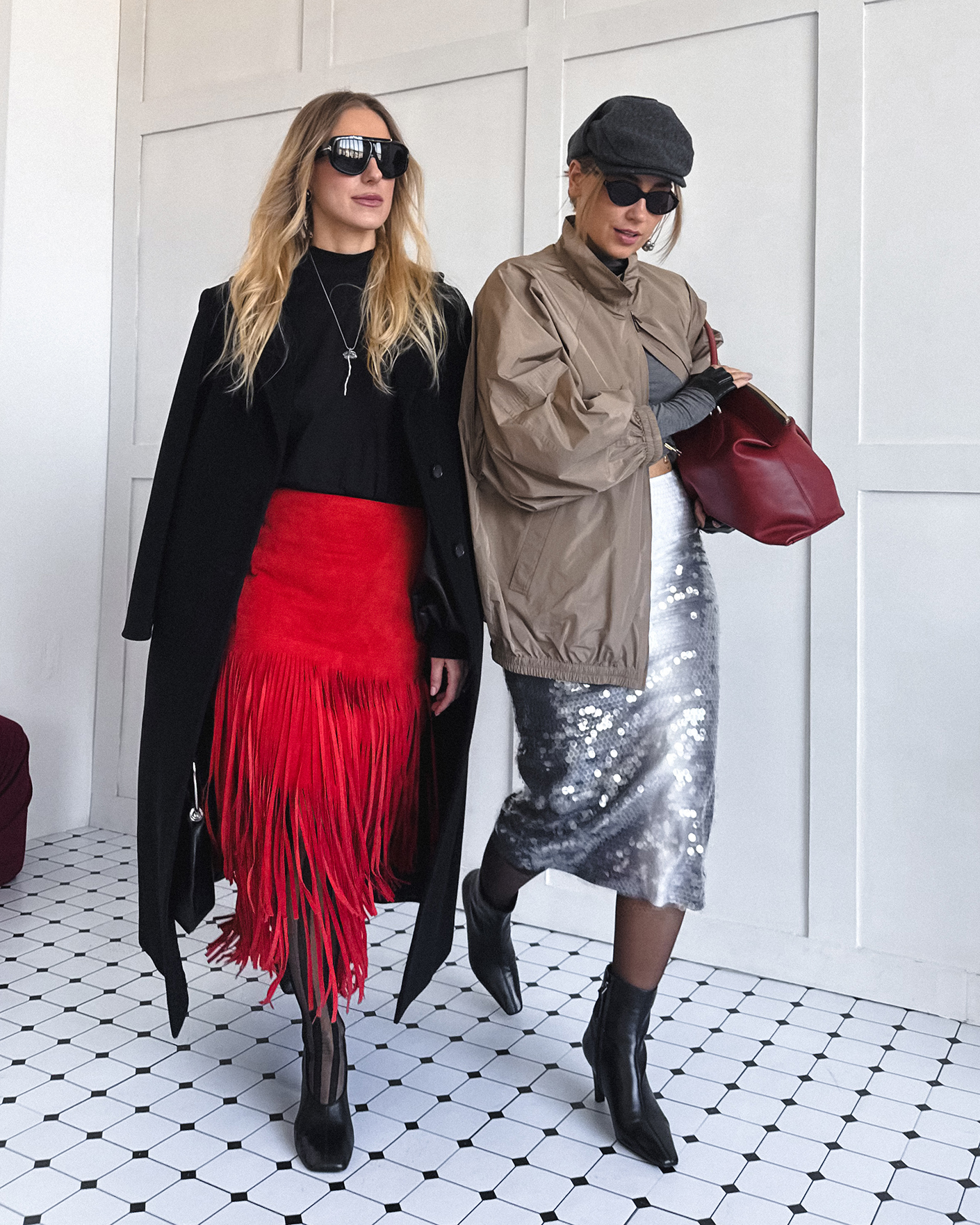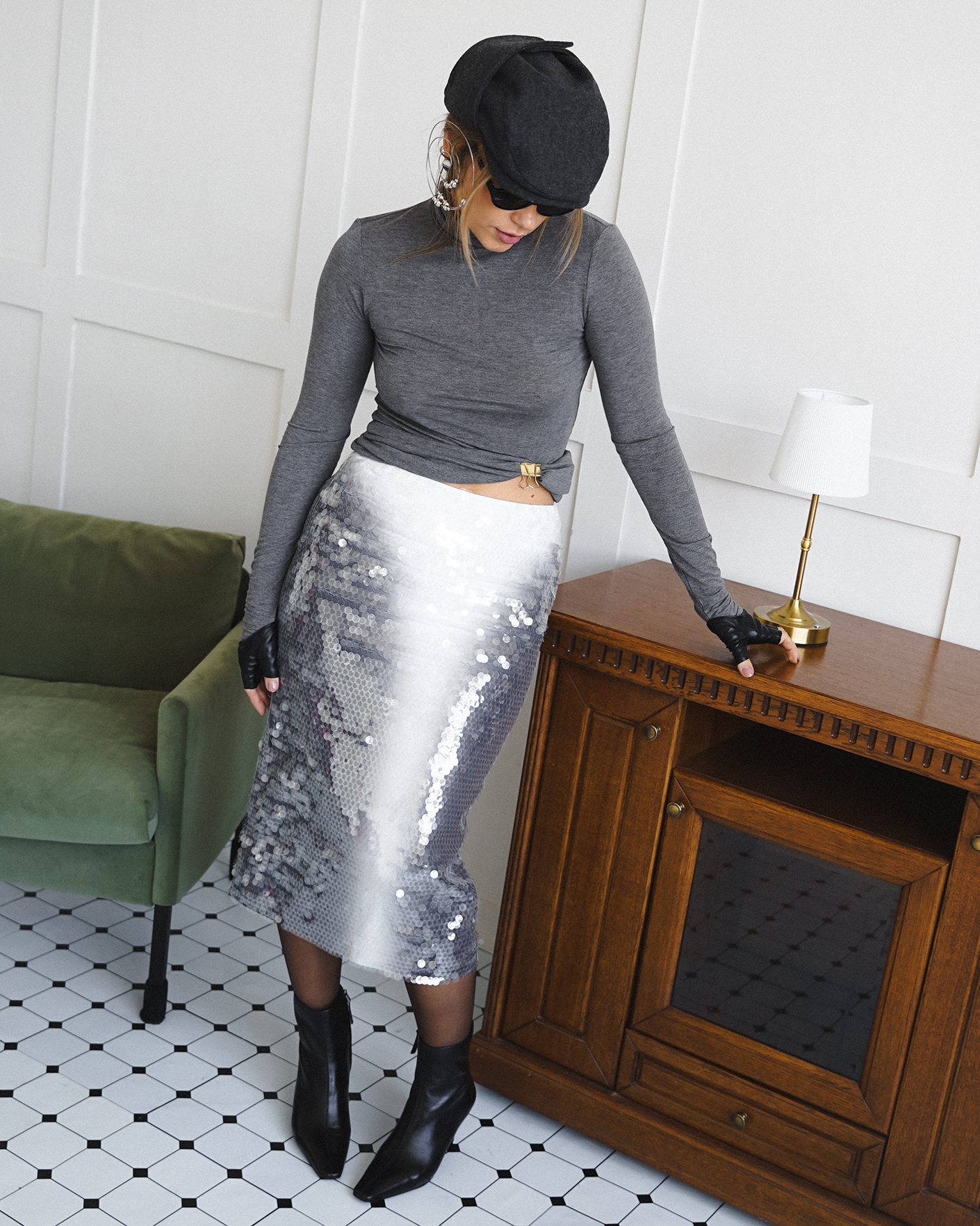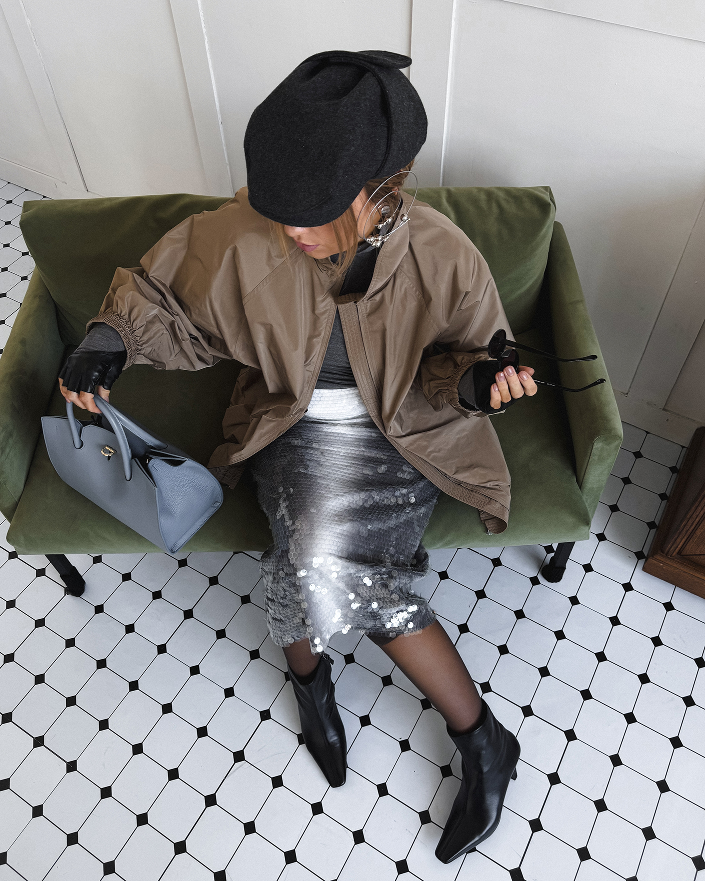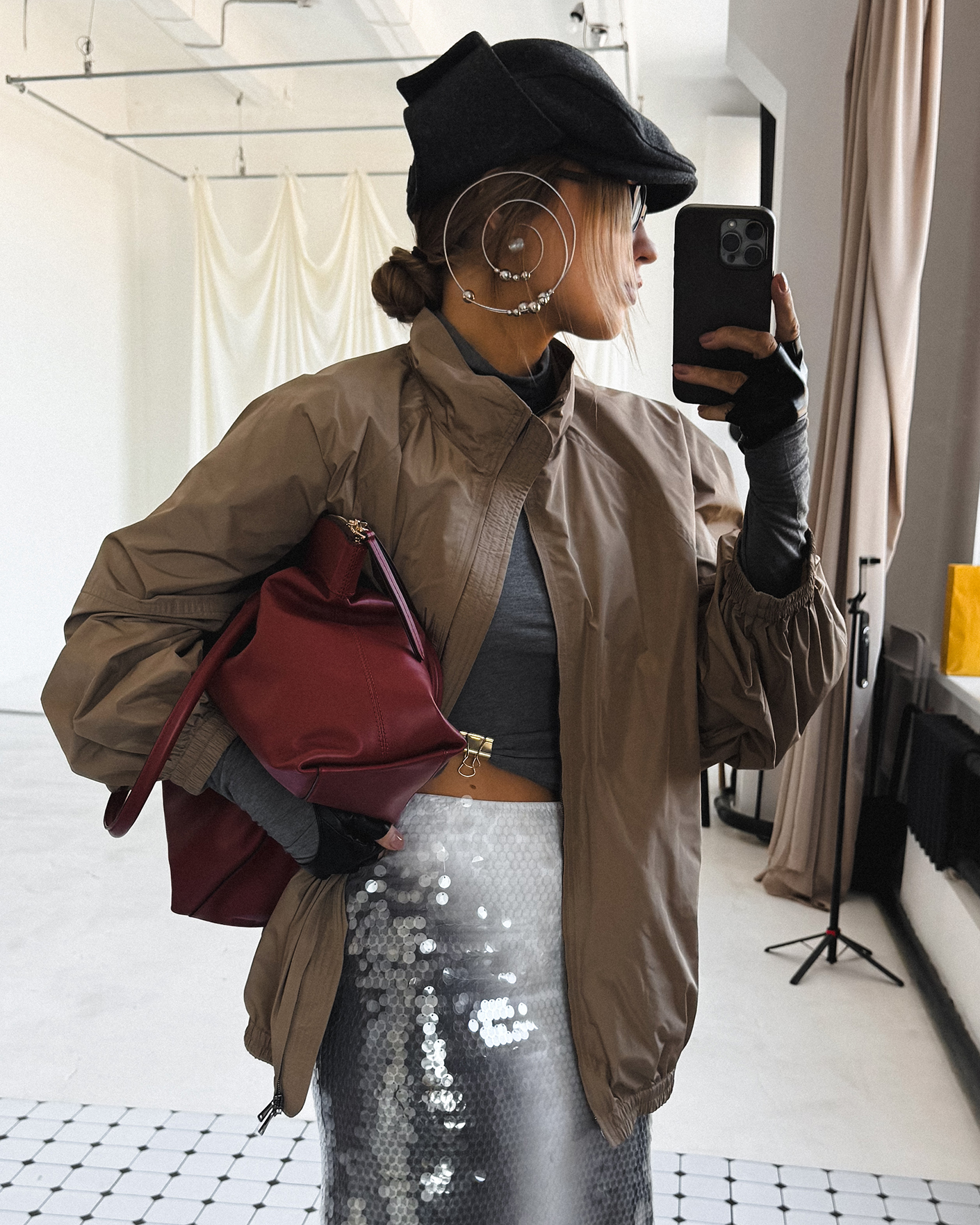 Современный образ для стильных прогулок по городу состоит из удлиненной ветровки-бомбер серо-бежевого цвета с застежкой на молнию, из приталенной водолазки в сером цвете, также из юбки-карандаш с крупными пайетками, что делаем образ более ярким. Смело добавляйте стильные аксессуары.