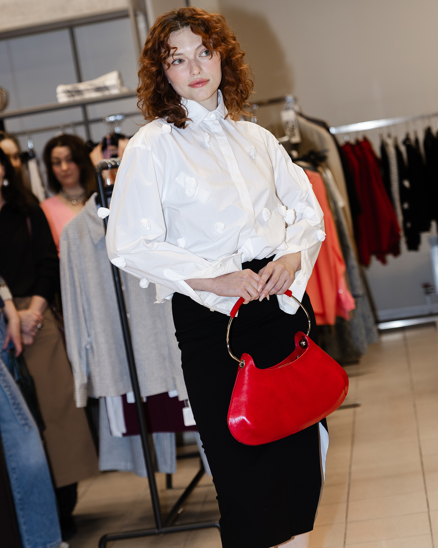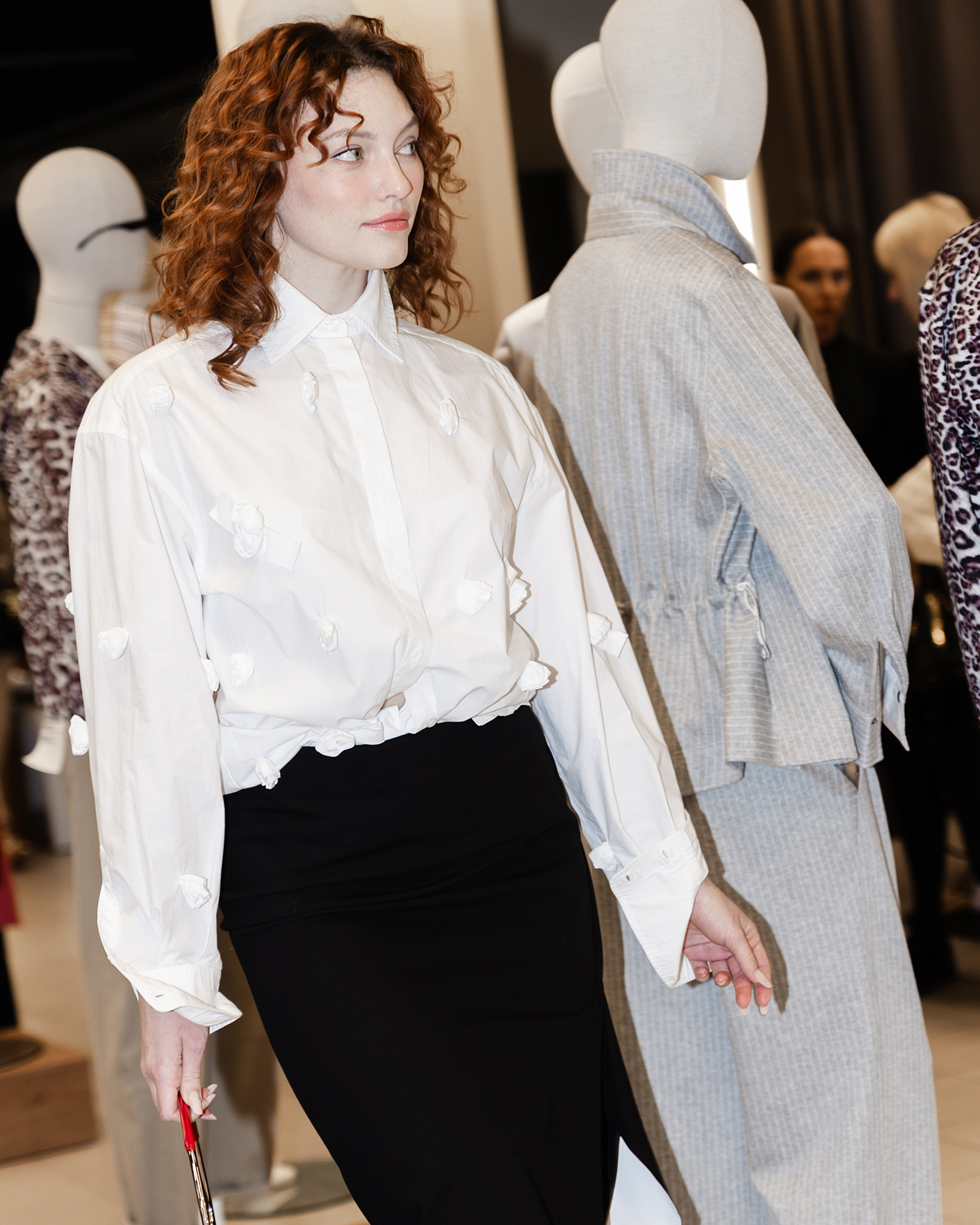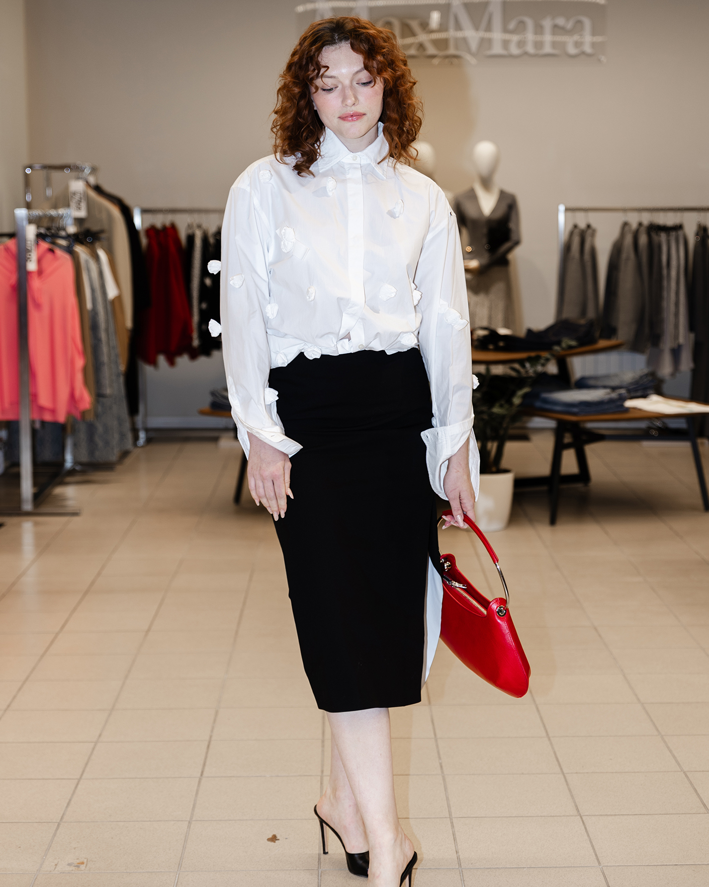 Классический образ от Sportmax для деловых встреч состоит из хлопковой рубашки белого цвета с декором в виде цветков и из юбки-карандаш черного цвета с эффектным боковым разрезом.