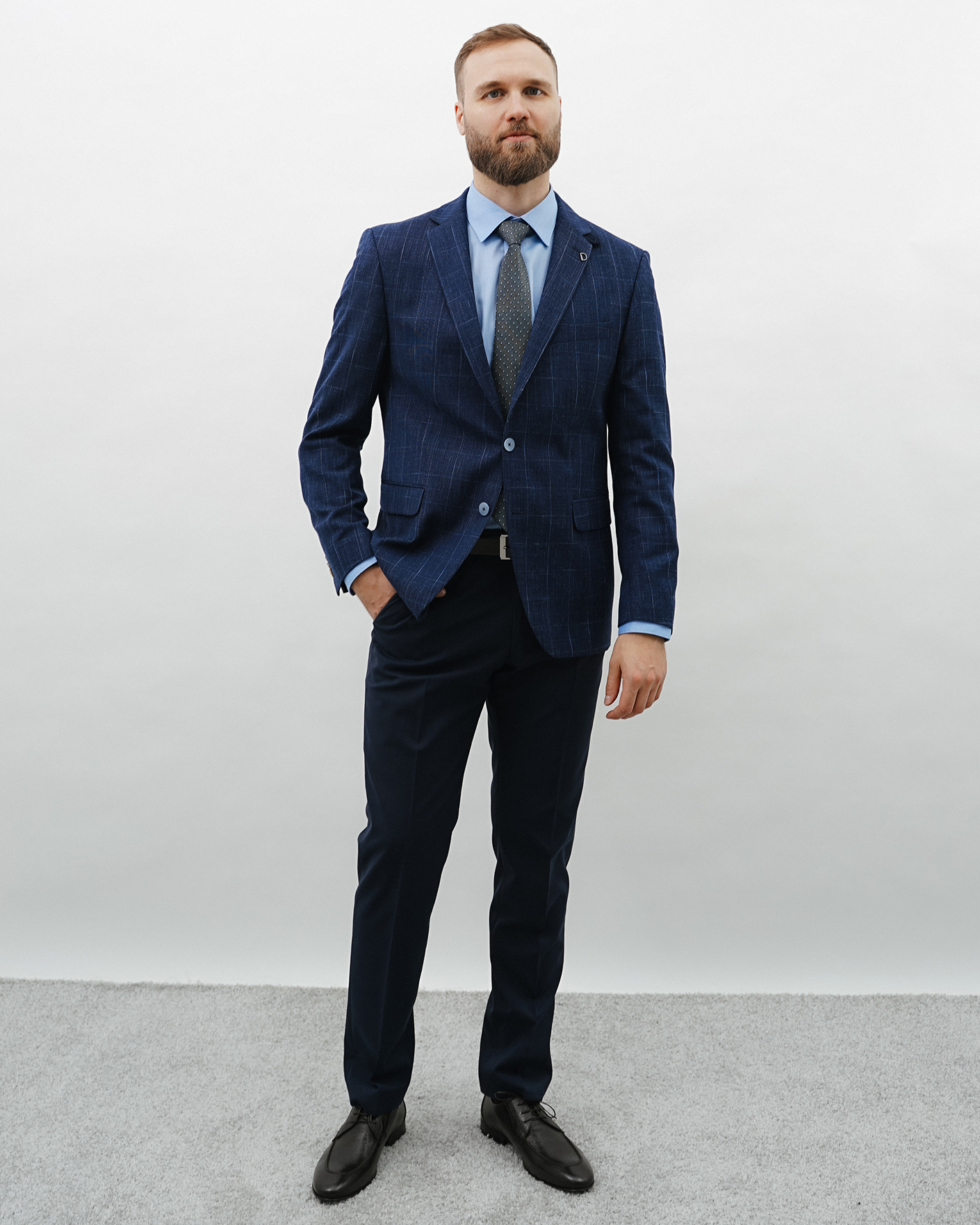 Стильный деловой образ от Digel состоит из шерстяного пальто серого цвета в крупный рисунок гусиные лапки, из пиджака синего цвета в крупную клетку, из рубашки в мелкий рисунок из 100% хлопка, а также из классических брюк темно-синего цвета со стрелками.