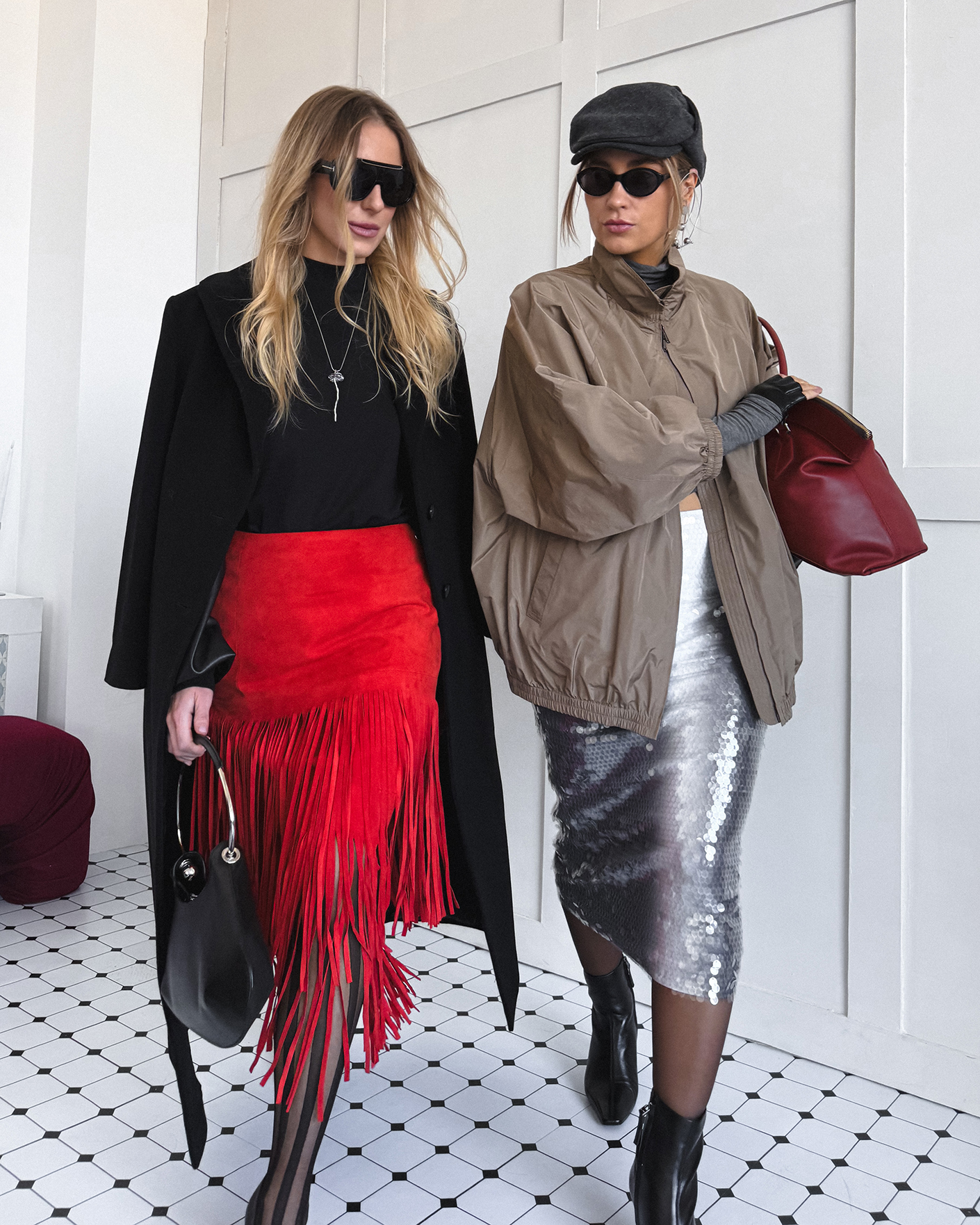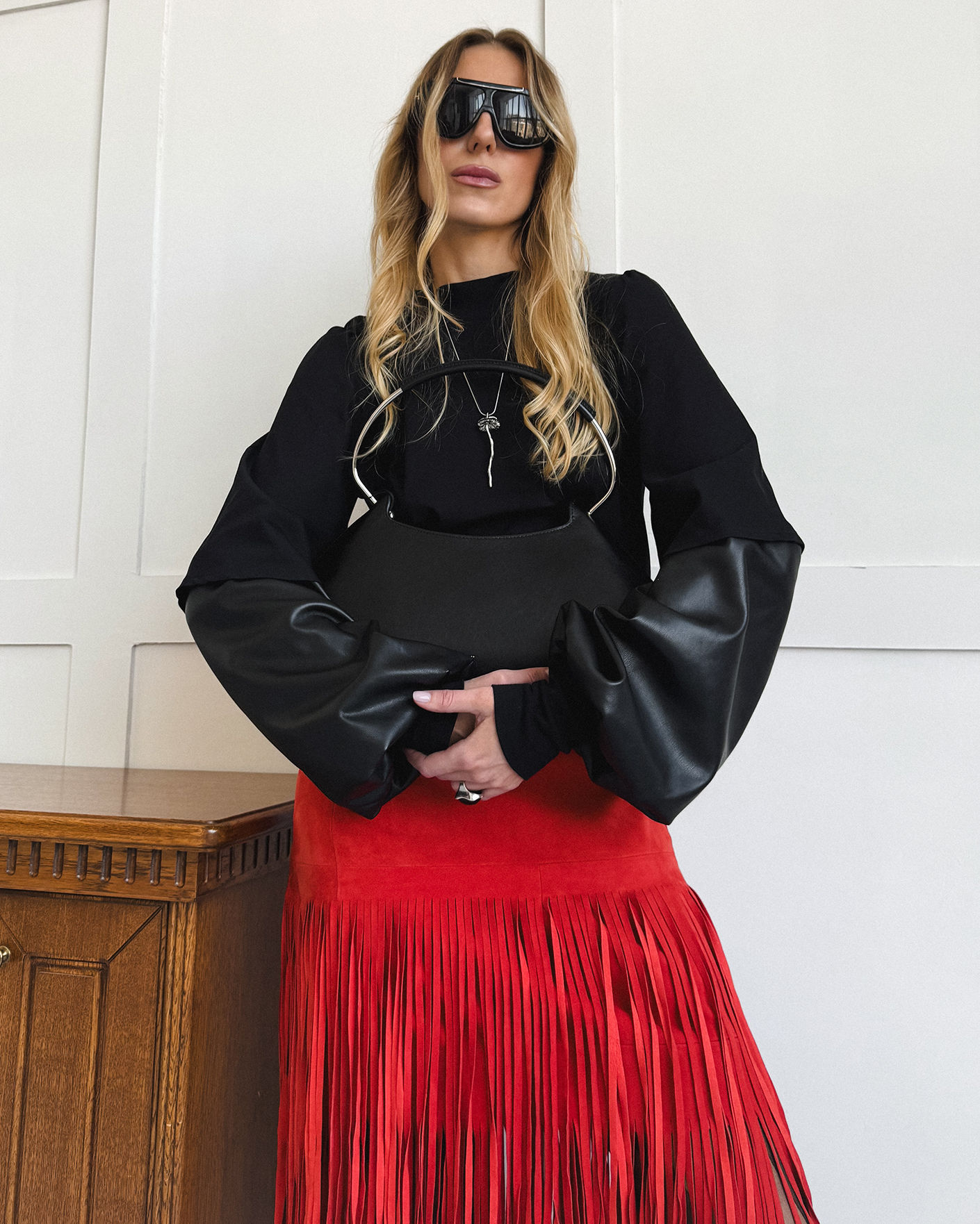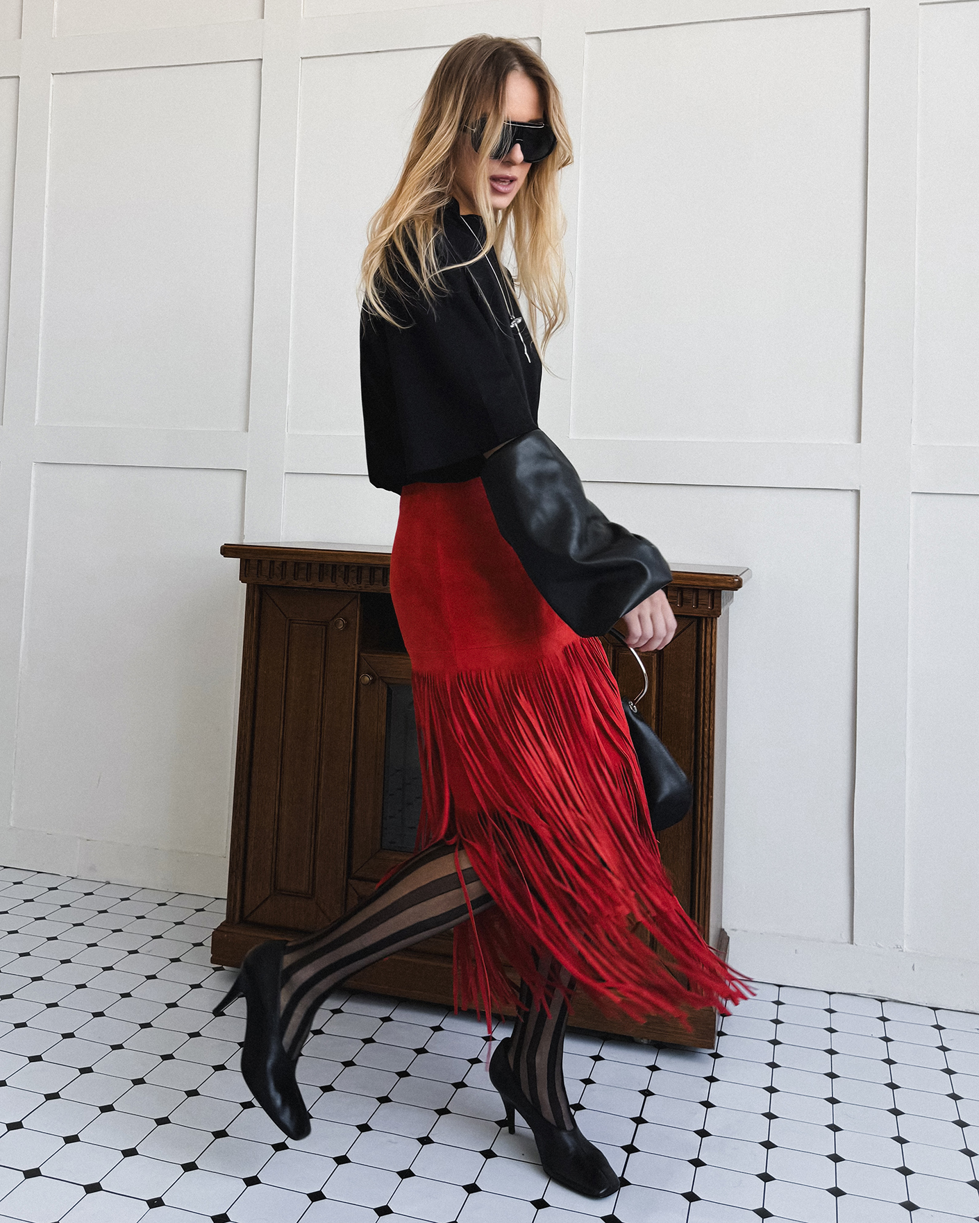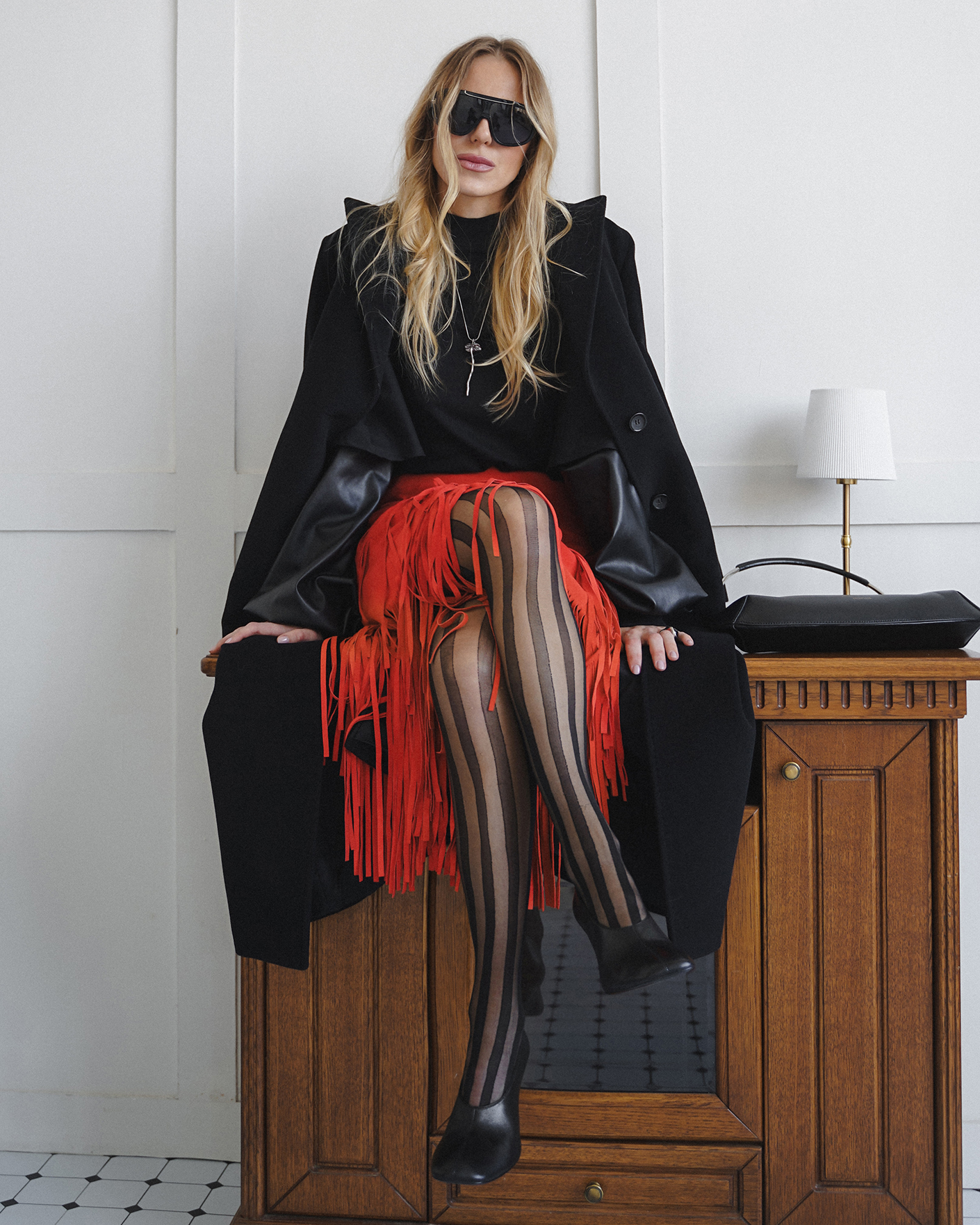 Стильный дерзкий образ для прогулок по городу состоит из классеческого черного пальто длины макси, из хлопковой футболки в черном цвете, также из кожаной юбки-карандаш алого цвета с декором в виде бахромы.