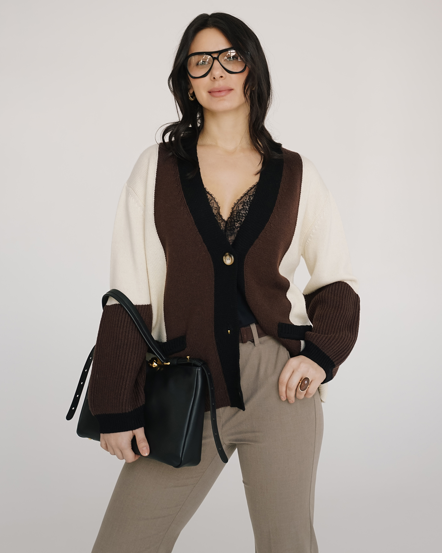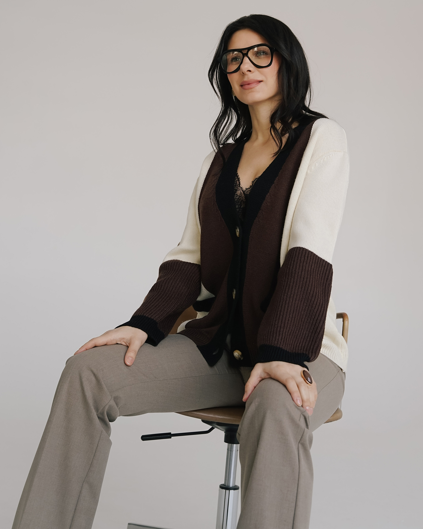 Стильный образ Marella для работы в офисе состоит из шерстяного кардигана молочно-коричневого цвета в строчный и абстрактный рисунок, из топа в черном цвете с кружевом, а также из брюк серо-коричневого цвета в строчный рисунок.