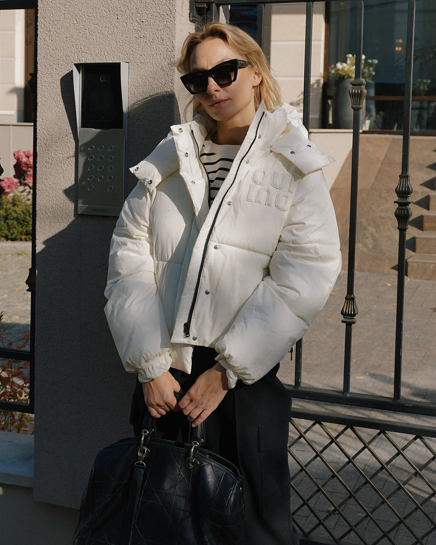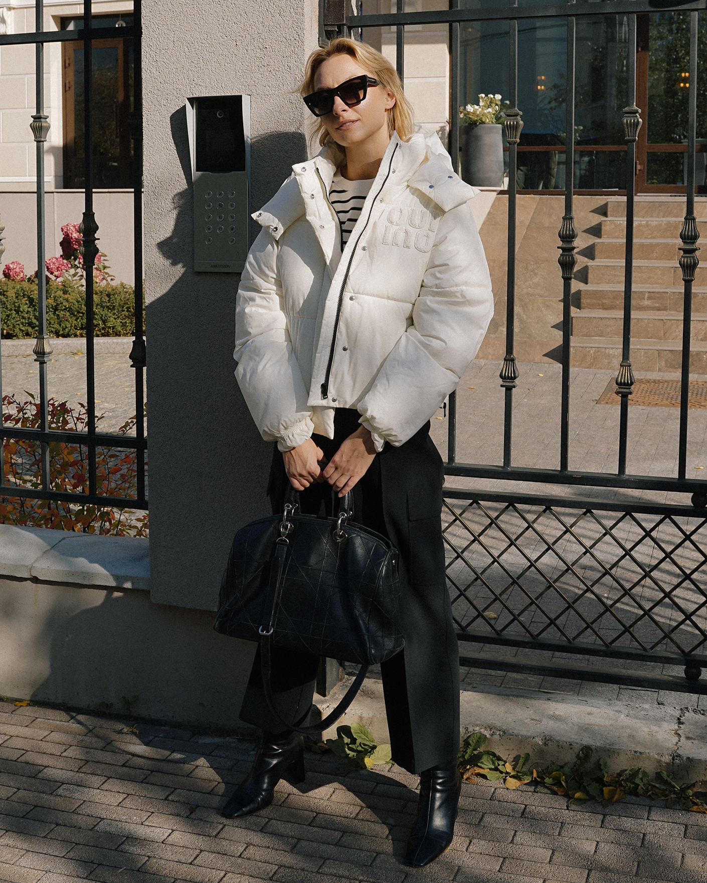 Стильный образ для повседневных дел состоит из теплой хлопковой куртки белого цвета с капюшоном, из футболки бело-черного цвета в горизонтальную полосу и из брюк-карго-труб черного цвета на эластичном поясе в складку и вставном шнурке.