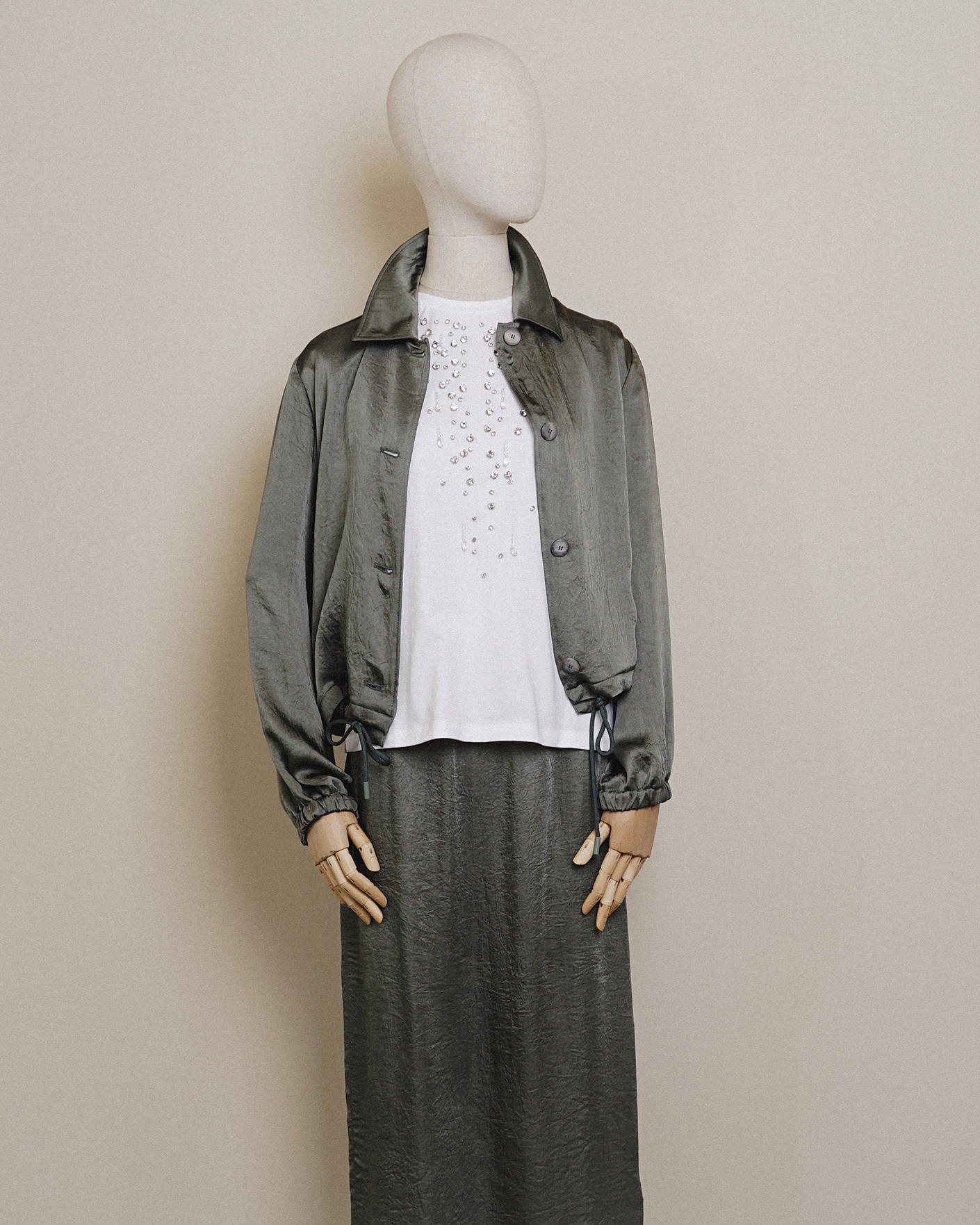 Стильный образ для прогулок от Marella состоит из блузы фисташкового цвета с атласным блеском, из хлопковой футболки белого цвета с декором страз, и из юбки-карандаш фисташкового цвета со специально помятым эффектом.