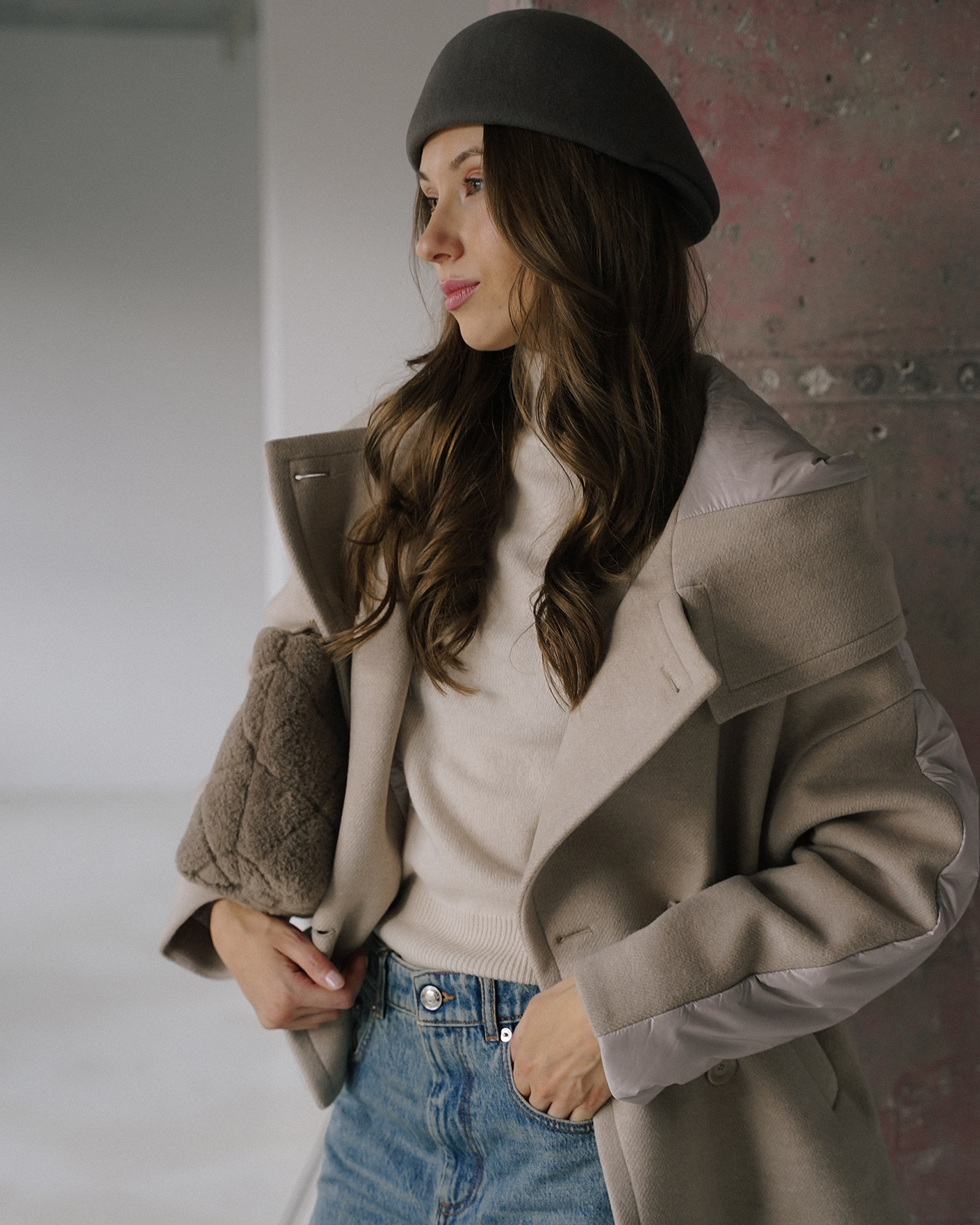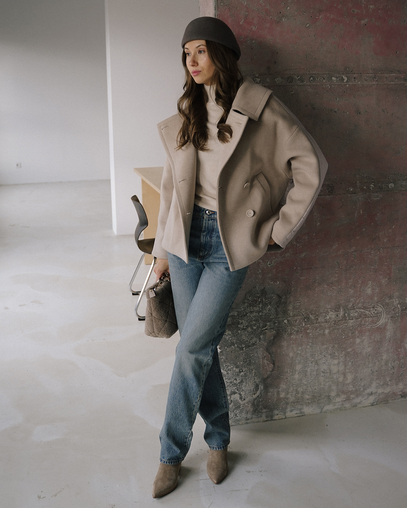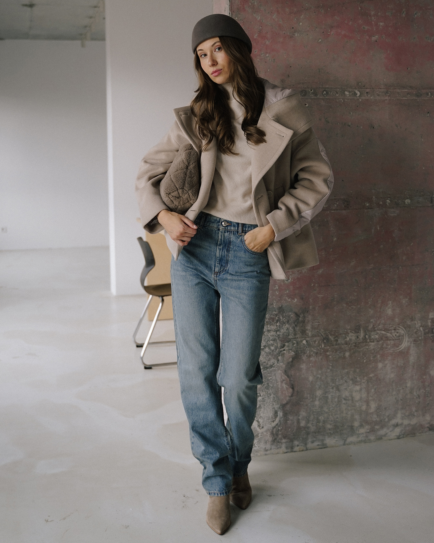стильный образ для прогулок по городу: полупальто, свитер, джинсы