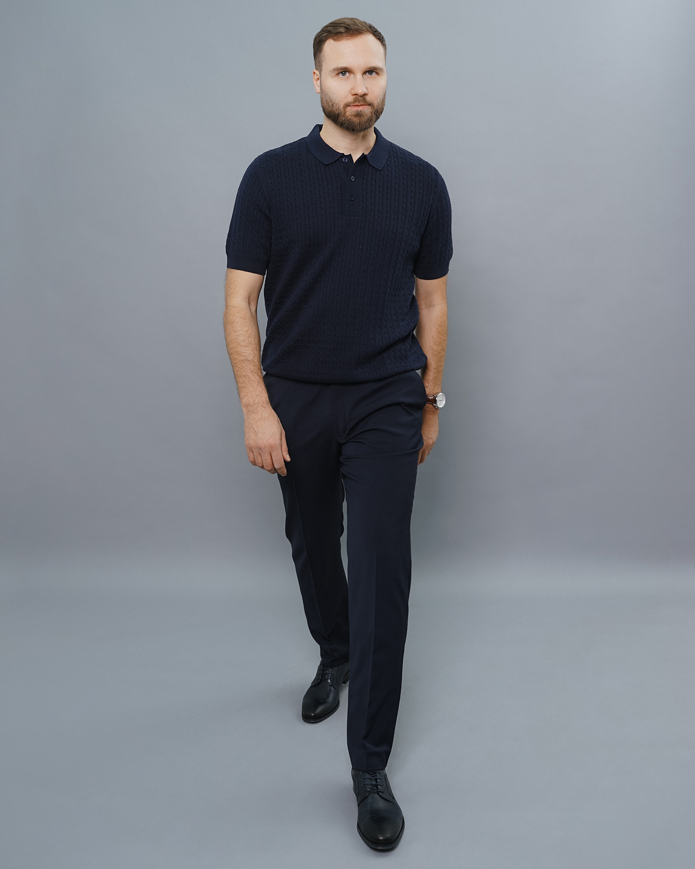 Стильный образ для работы в офисе состоит из хлопкового джемпера-поло темно-синего цвета в вертикальный строчный рисунок косичка и из брюк темно-синего цветав строчный рисунок.