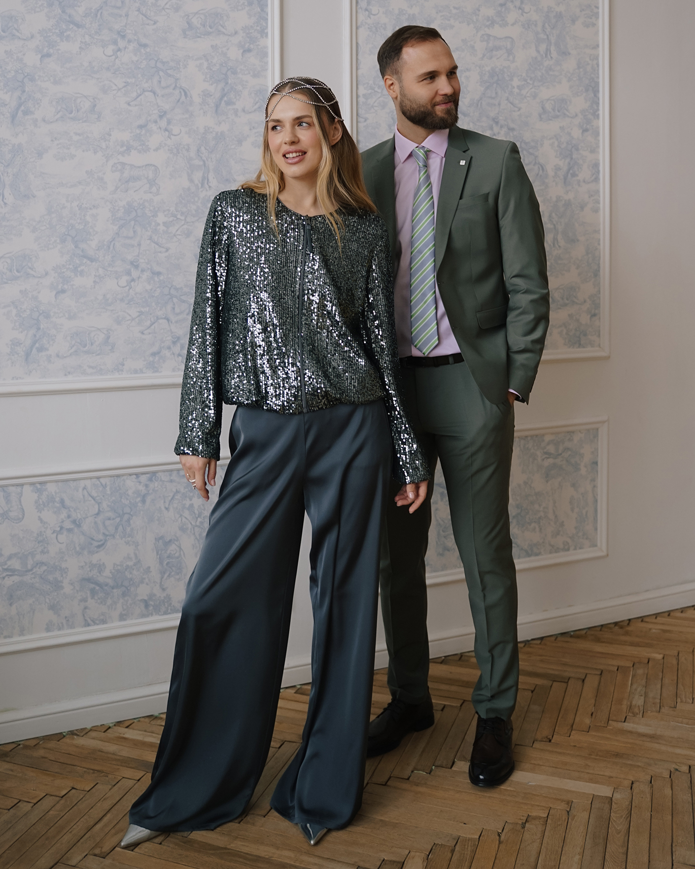 Стильный образ для вечеринки состоит из жакет-бомбера темно-зеленого цвета с декором в виде пайеток и из брюк-палаццо с атласным блеском.