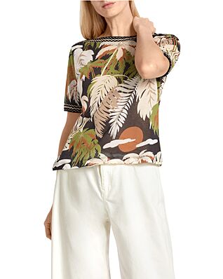 Стильный образ Marc Cain на каждый день и для работы в офисе состоит из футболки бежево-зеленого цвета в тропический рисунок и из широких брюк зеленого цвета со стрелками.
