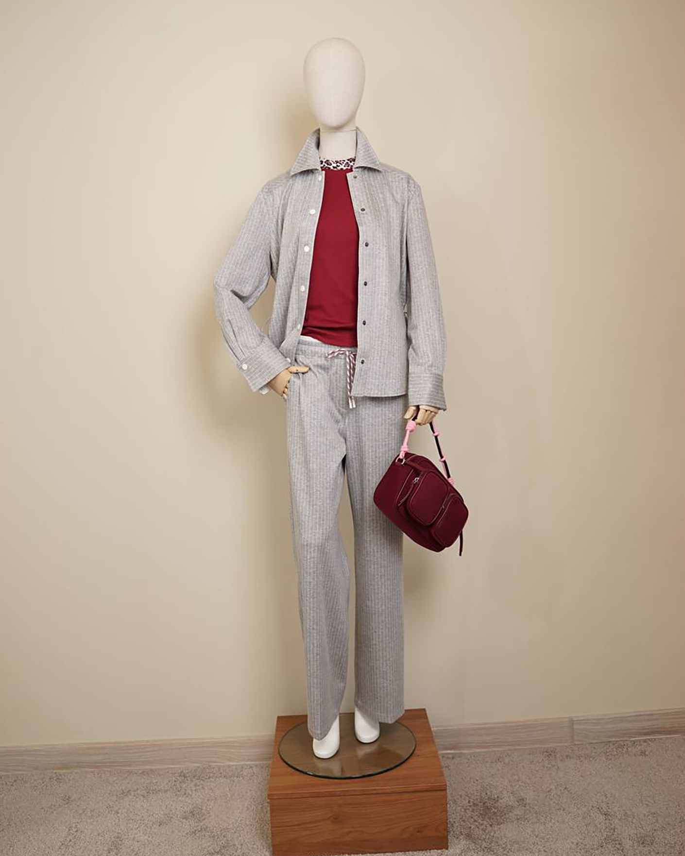 Стильный образ Marc Cain Sport на каждый день состоит из рубашки серого цвета в узкую вертикальную полосу, ширина которой регулируется кулисками по бокам, из приталенной майки вишневого цвета с отделкой в леопардовый принт, также из джоггеров серого цвета в узкую вертикальную полосу.