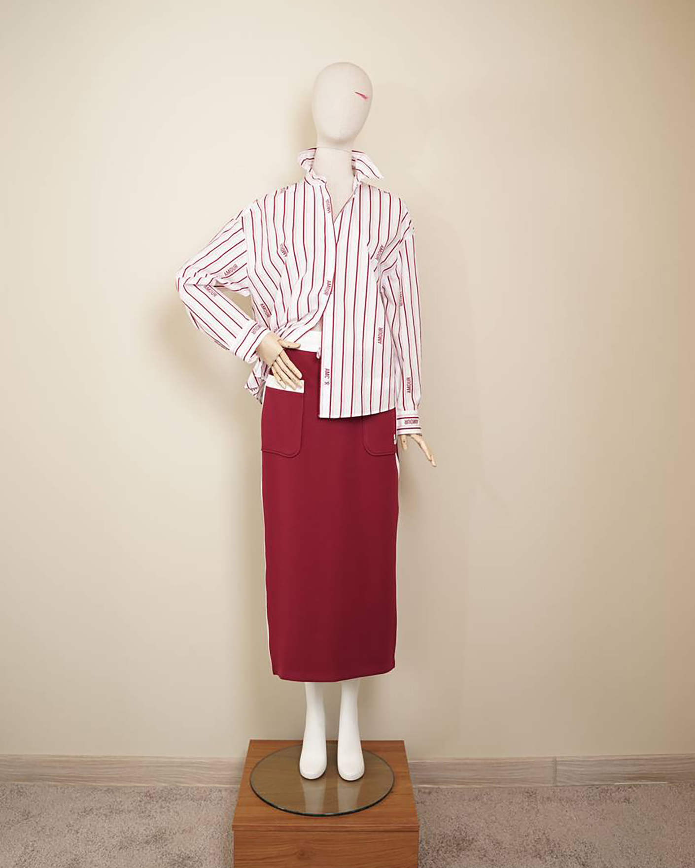 Стильный образ на каждый день от Marc Cain Sport состоит из хлопковой рубашки вишнево-белого цвета в вертикальную полосу и слоган и из юбки-карандаш вишневого цвета с широкими лампасами.