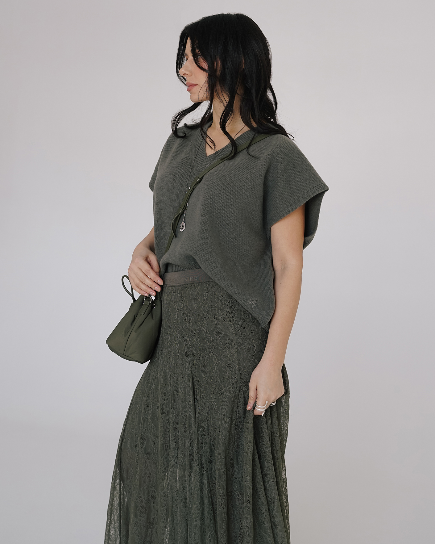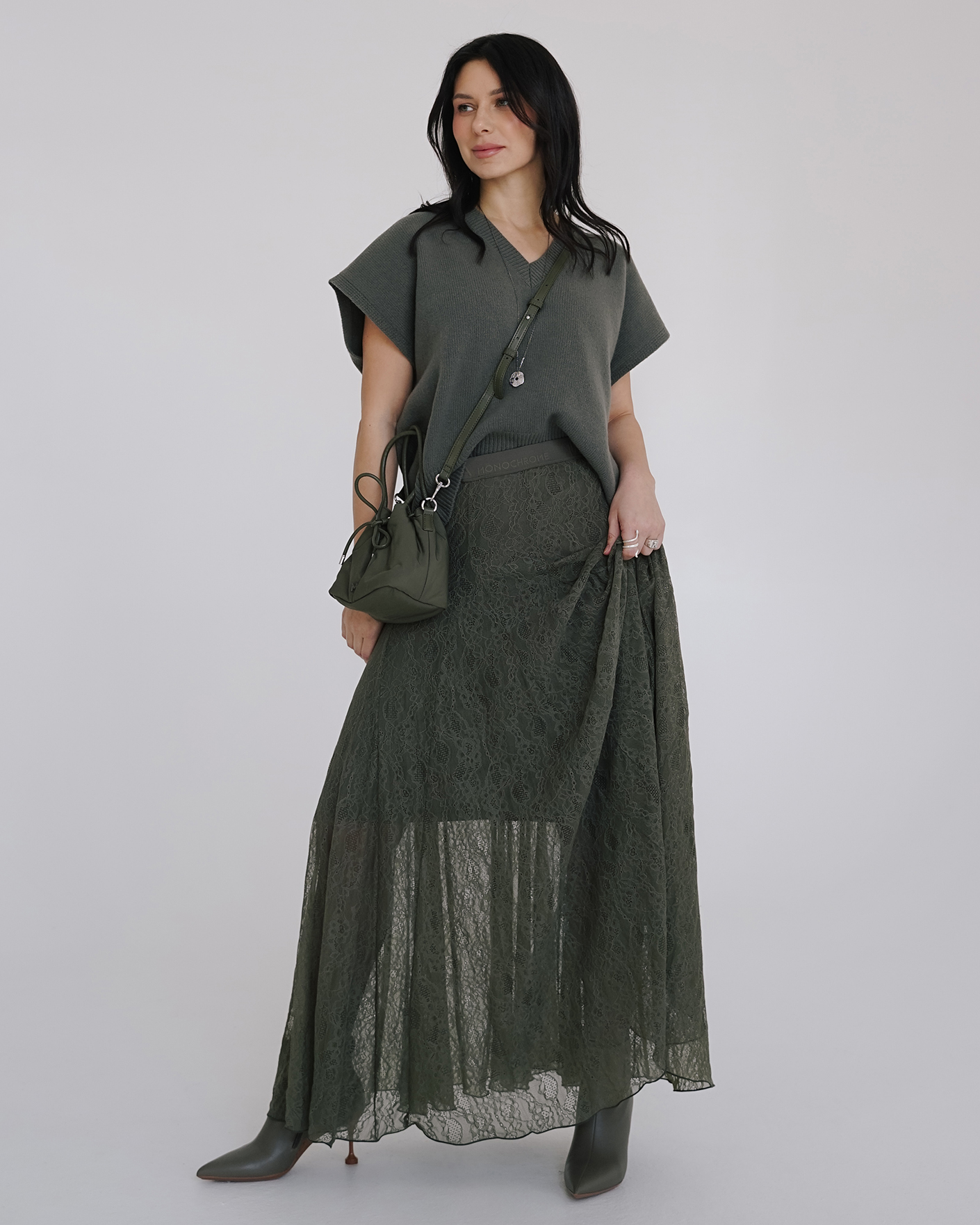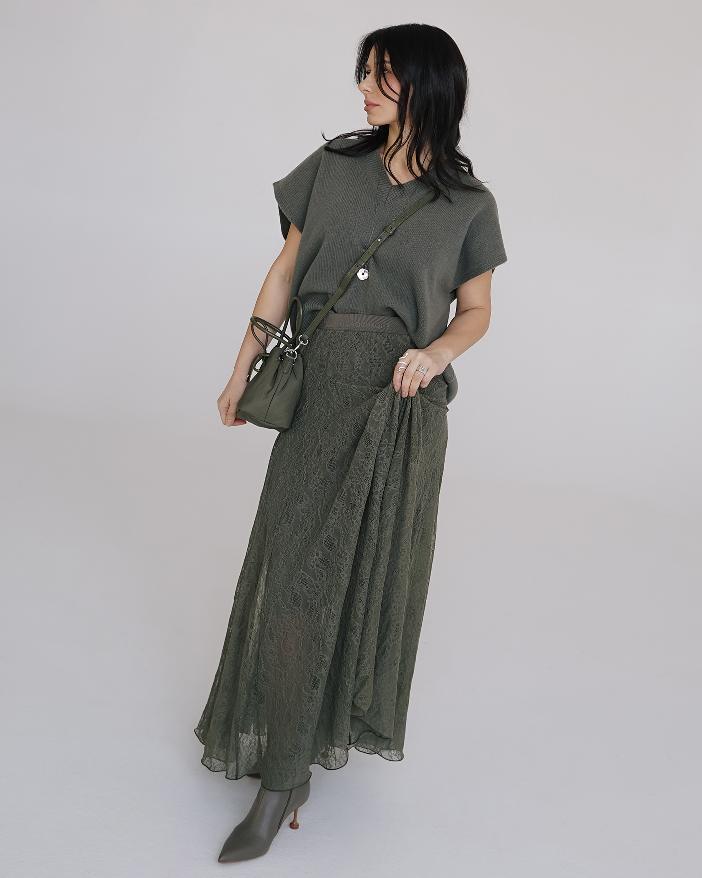 Стильный образ на каждый день от Marella в оливковом цвете состоит из вязаного жилета из 100% шерсти, с V-образным вырезом, также ищз юбки полусолнце в кружевной рисунок.